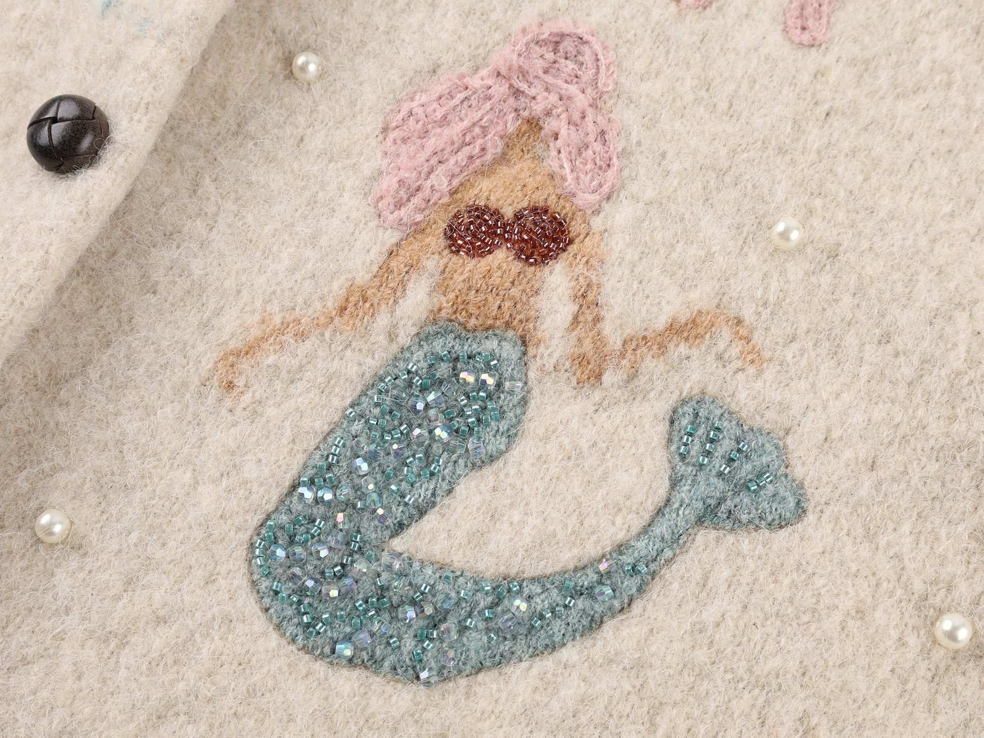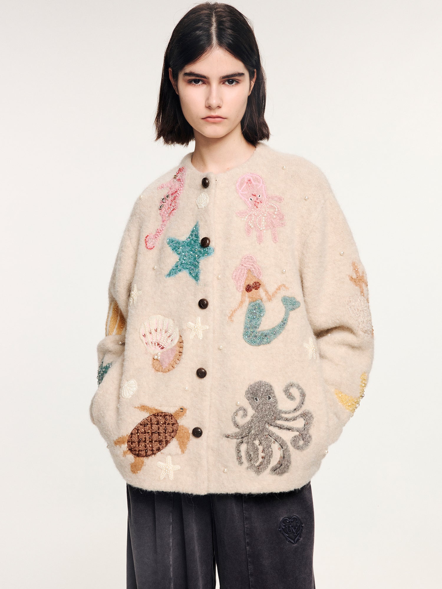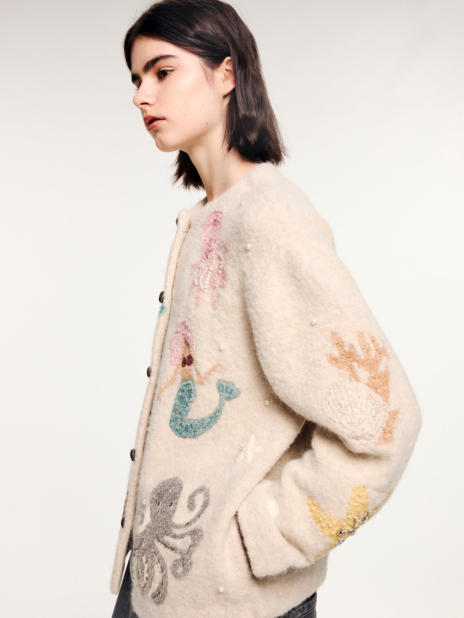 Centered on a fantasy undersea world, featuring jacquard craftsmanship, hand-crochet-style appliqué, beads, pearls, and hand-sewn rhinestones.