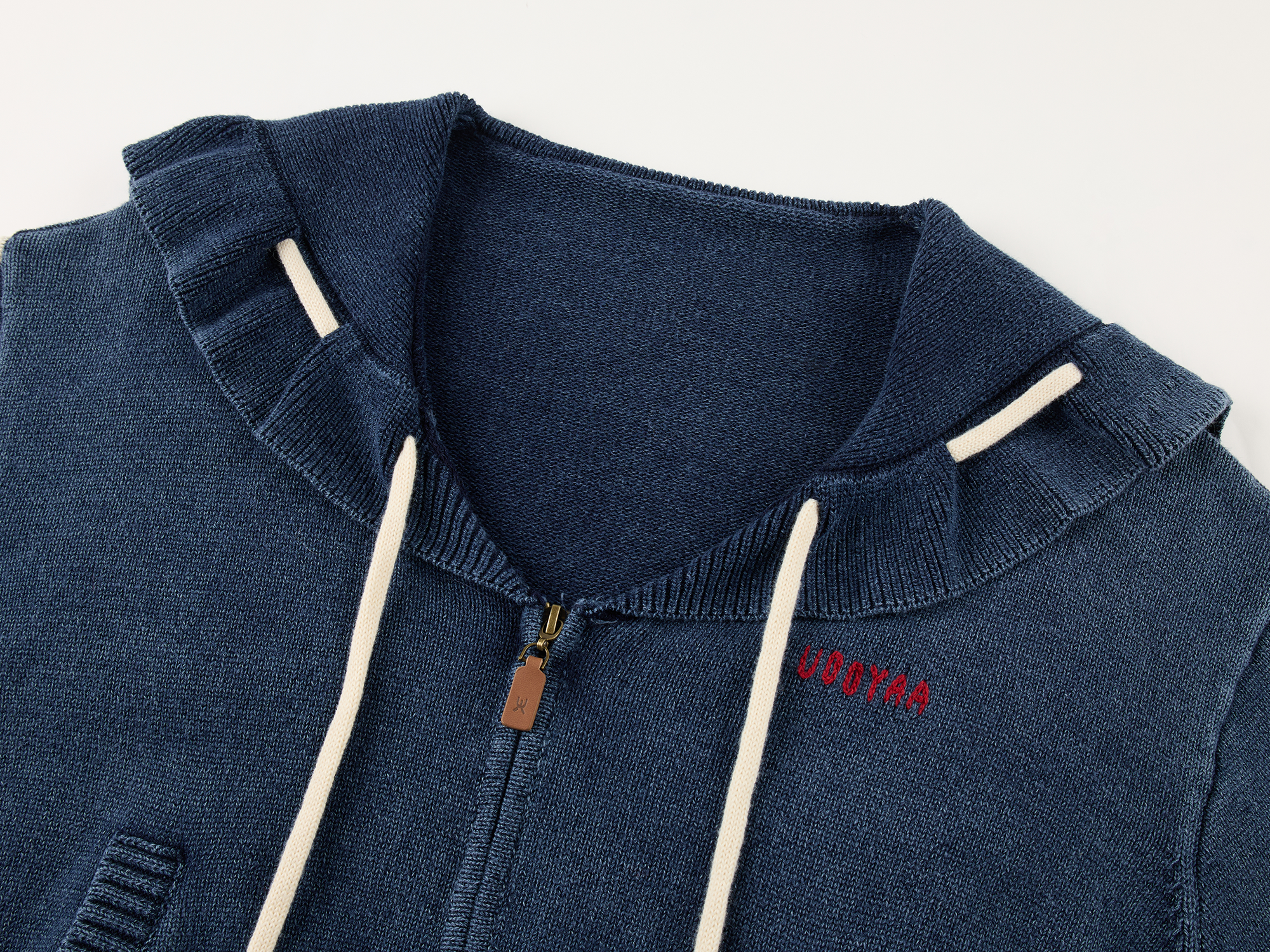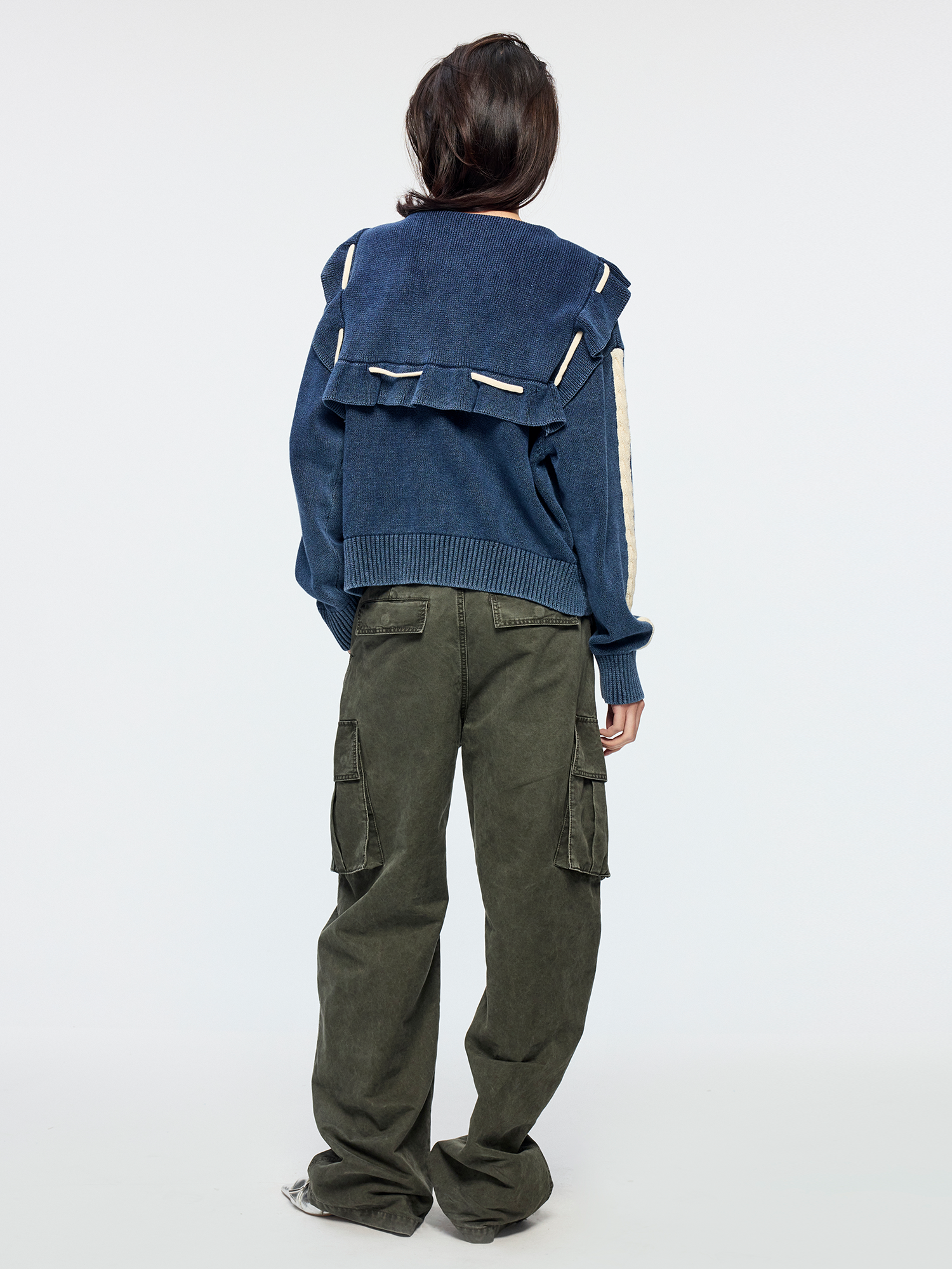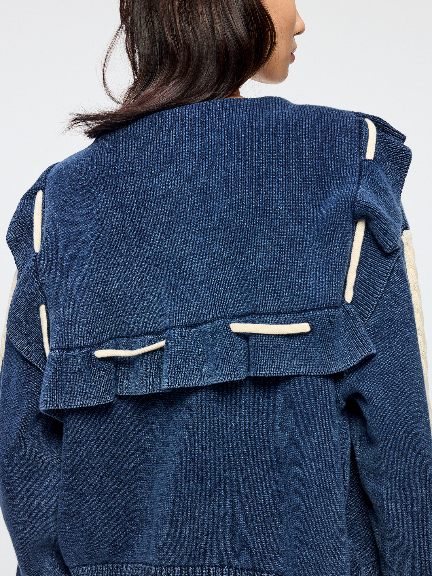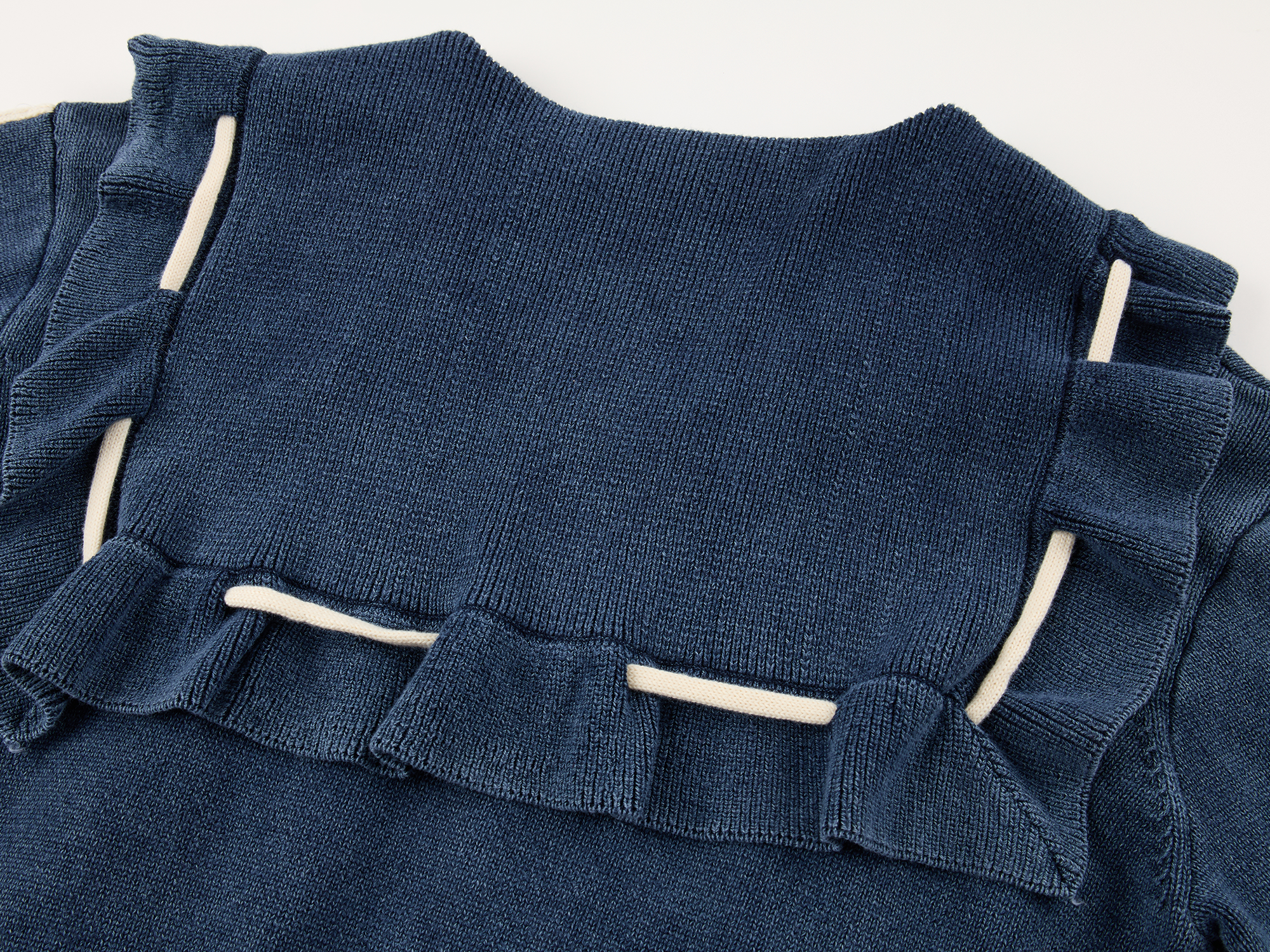 Drawstring structure on a classic sailor collar allows for adjustable ruffle shapes. Relaxed silhouette balances youthfulness with spontaneity.