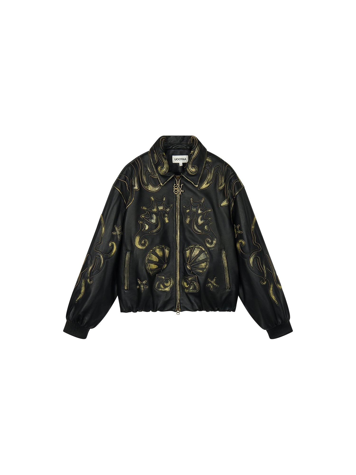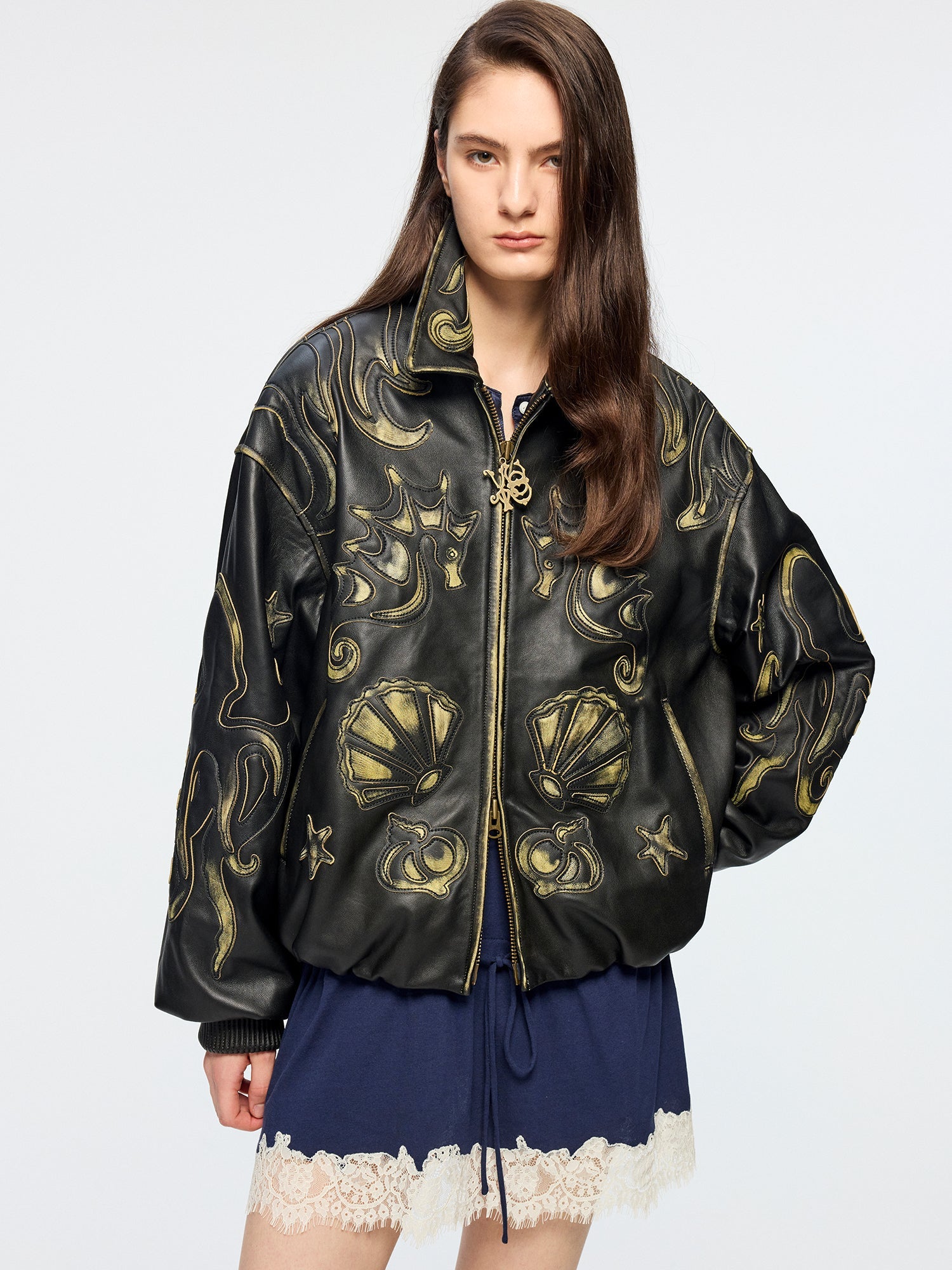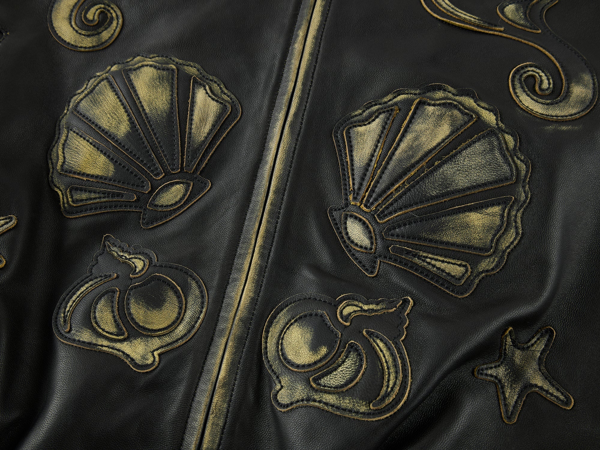 Rubbed leather jacket with fantasy undersea appliqu¨¦