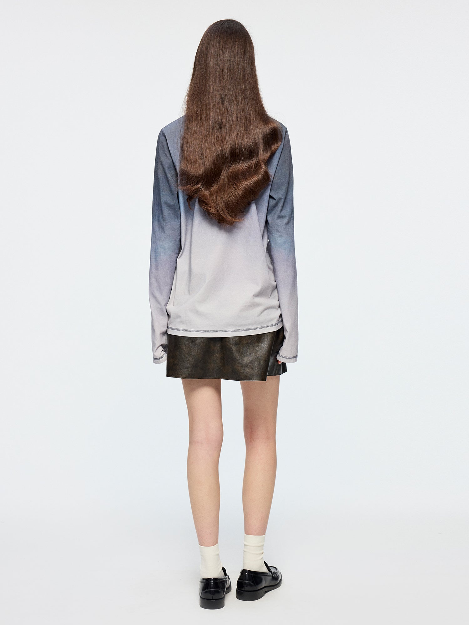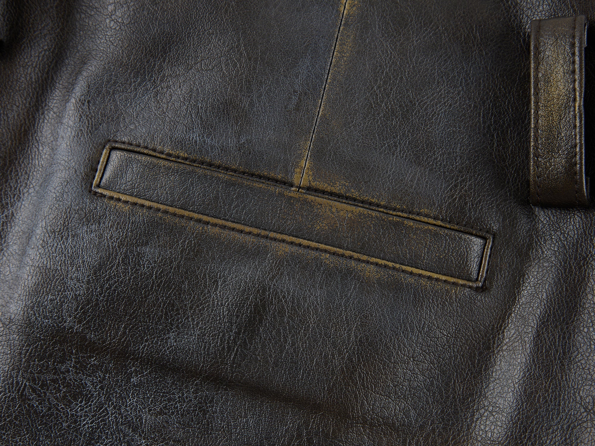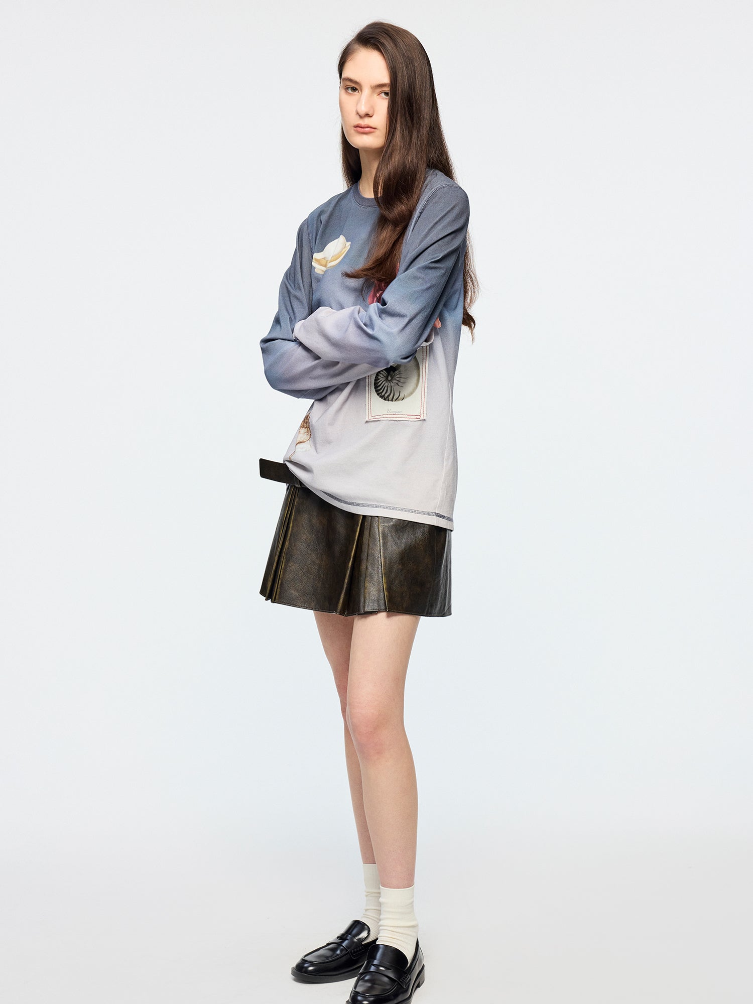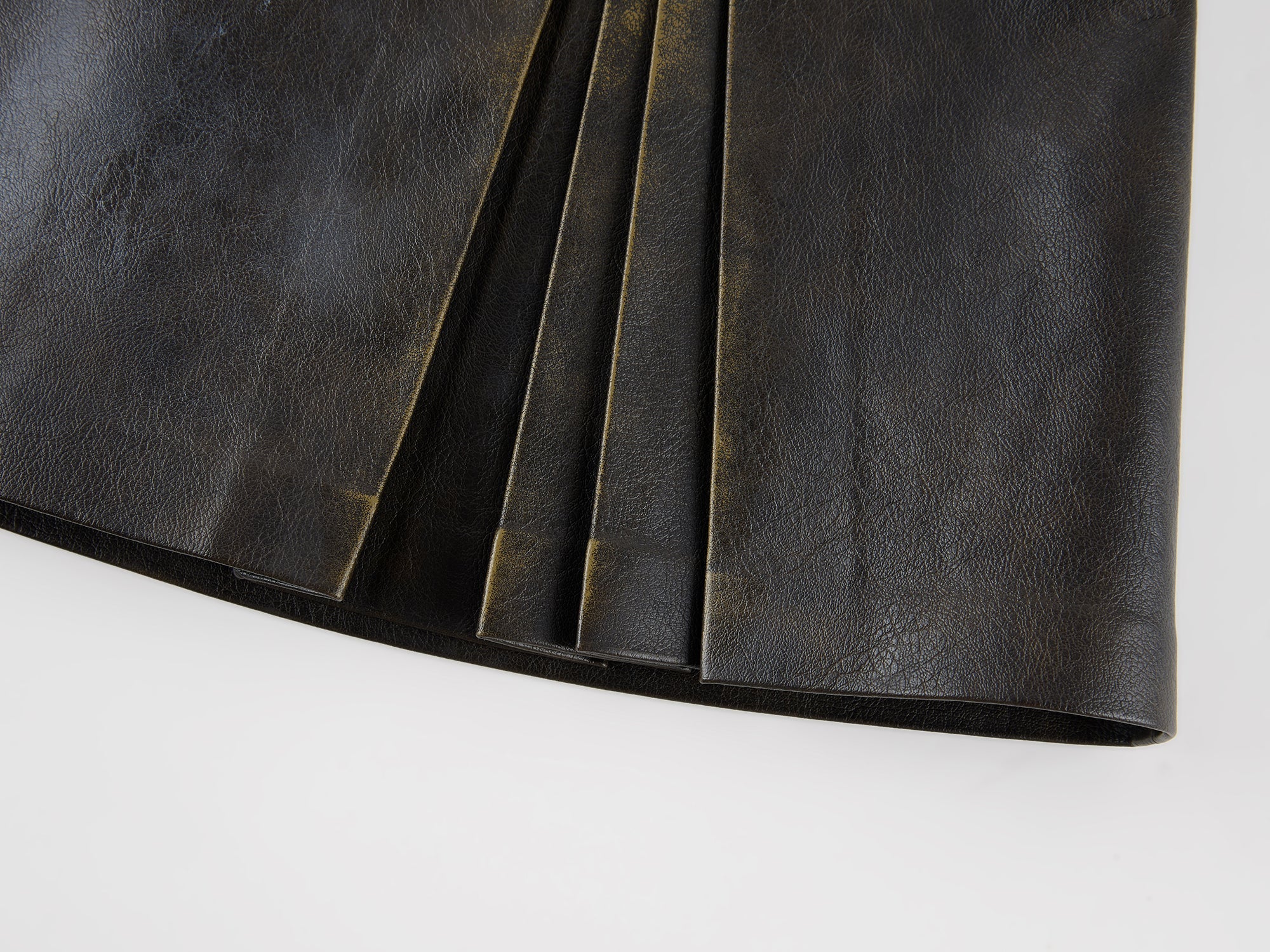 Pleated mini skirt in rubbed PU leather features an antique gold belt for a vintage urban look.