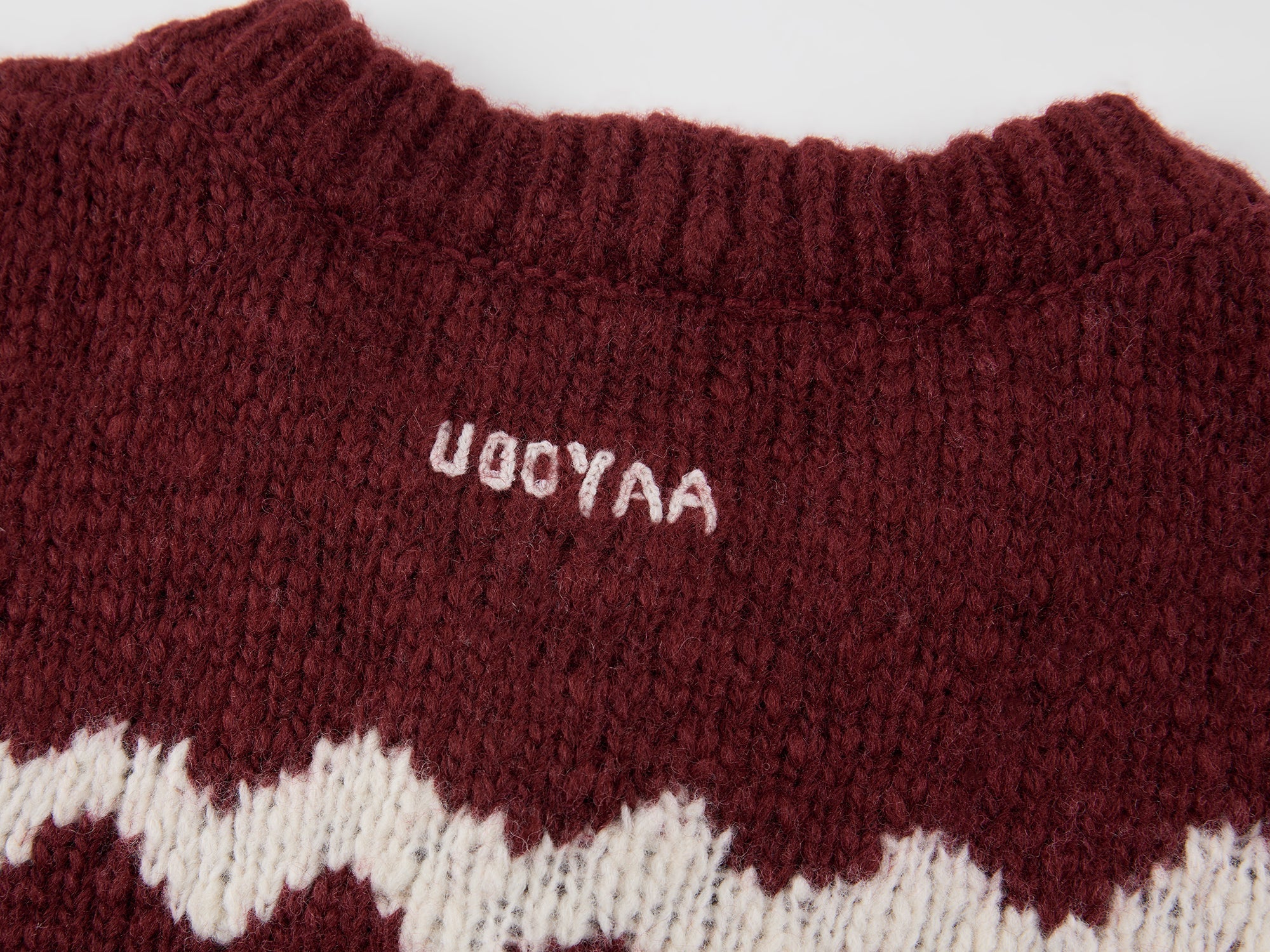 Wool blend fancy yarn creates a vintage texture. Classic red and white colorway offers a fluffy, comfortable, and youthful vibe.Fabric:
