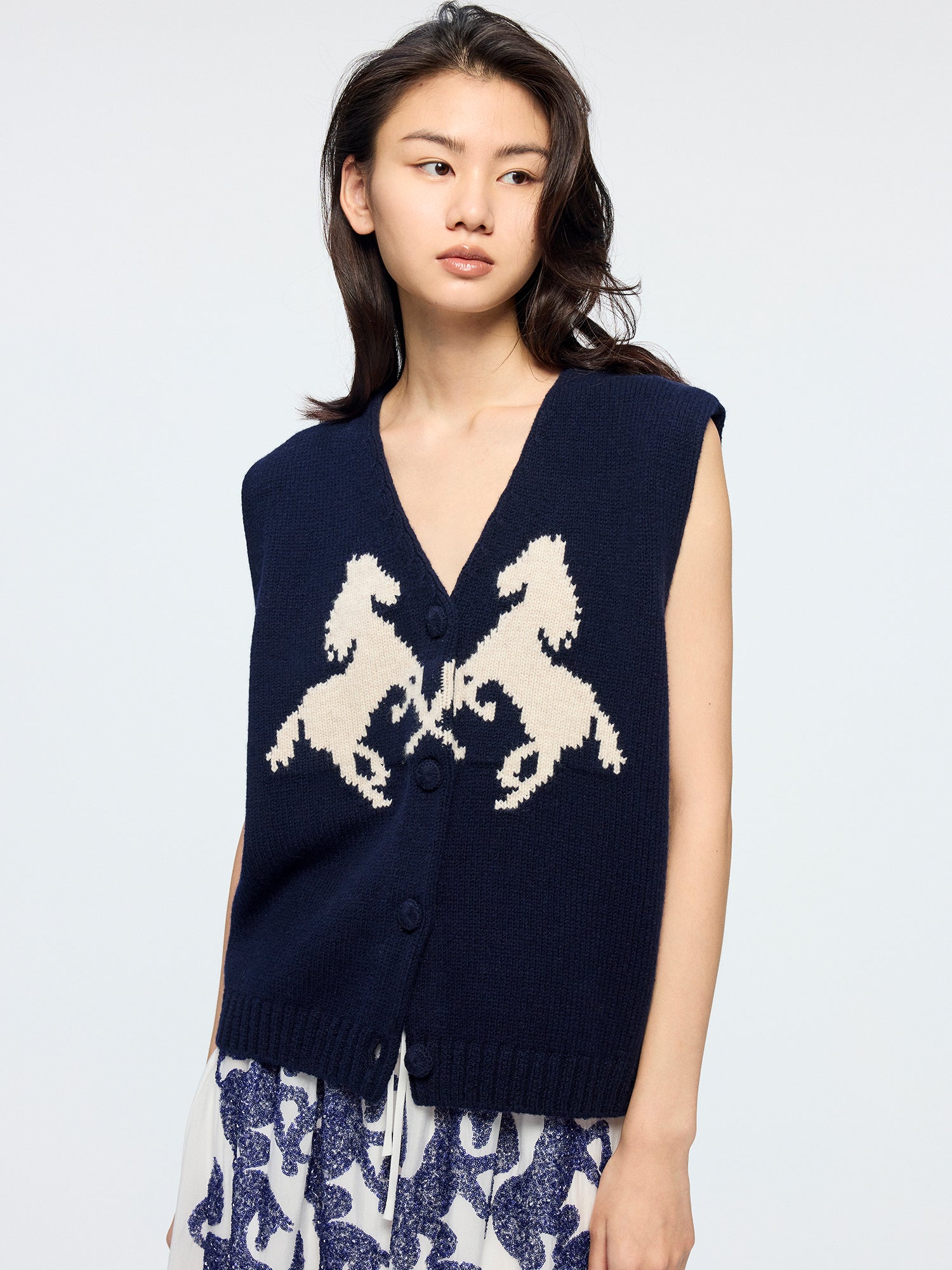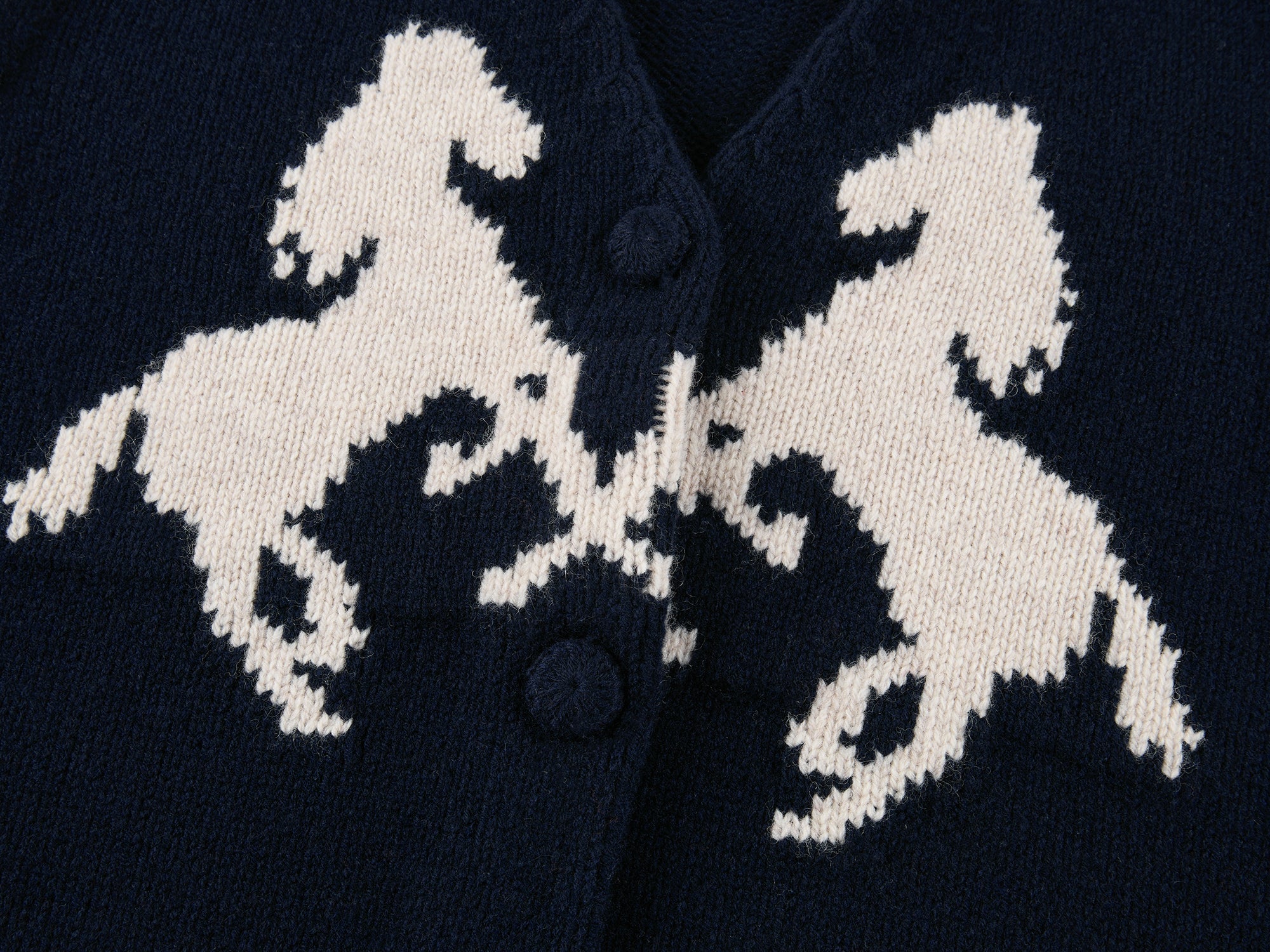 Jacquard craftsmanship presents symmetrically arranged vintage horses--minimalist yet modern.