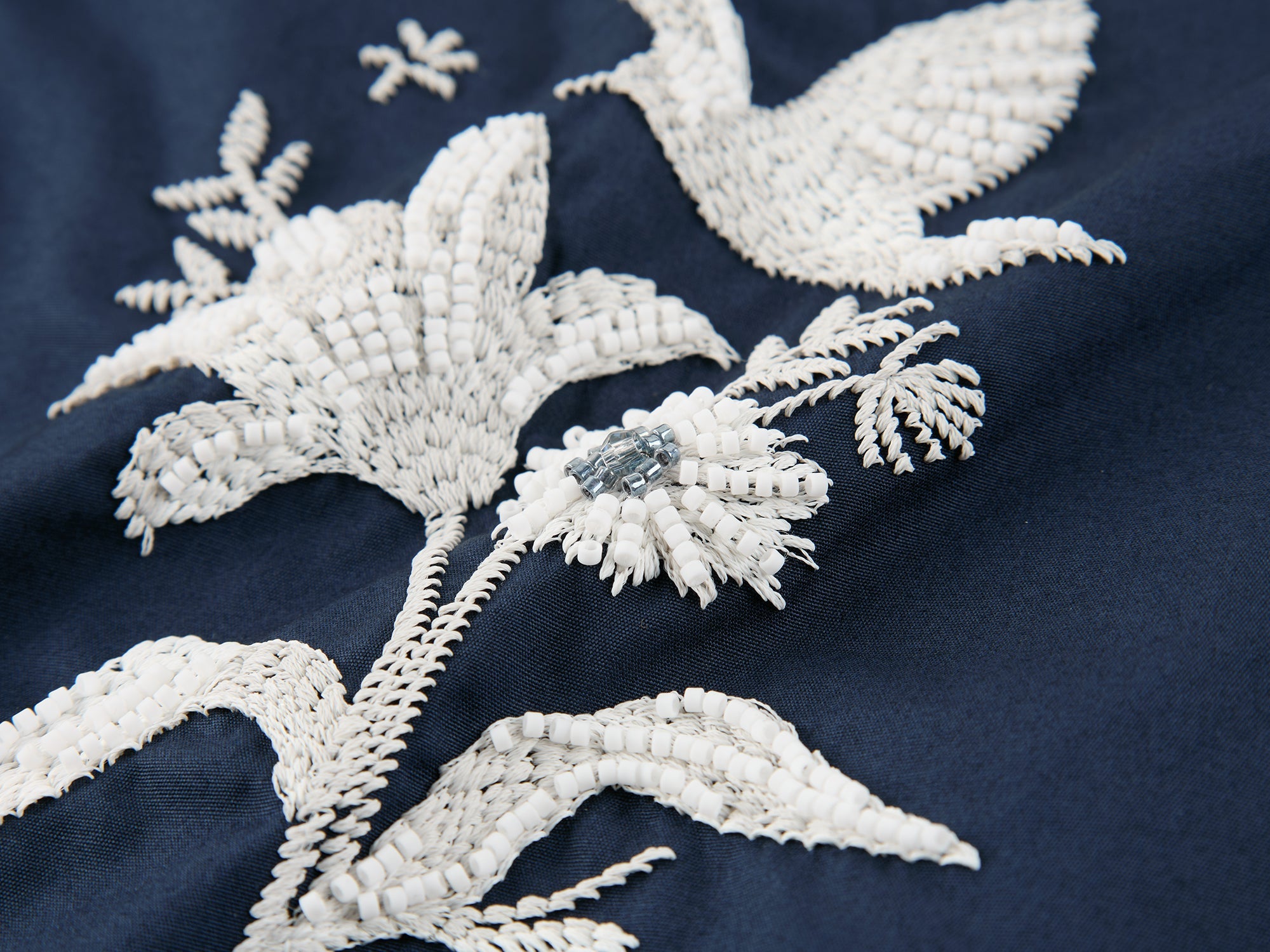 Mysterious birds in flowers presented via bead embroidery overlay, maximizing fantasy and refinement.