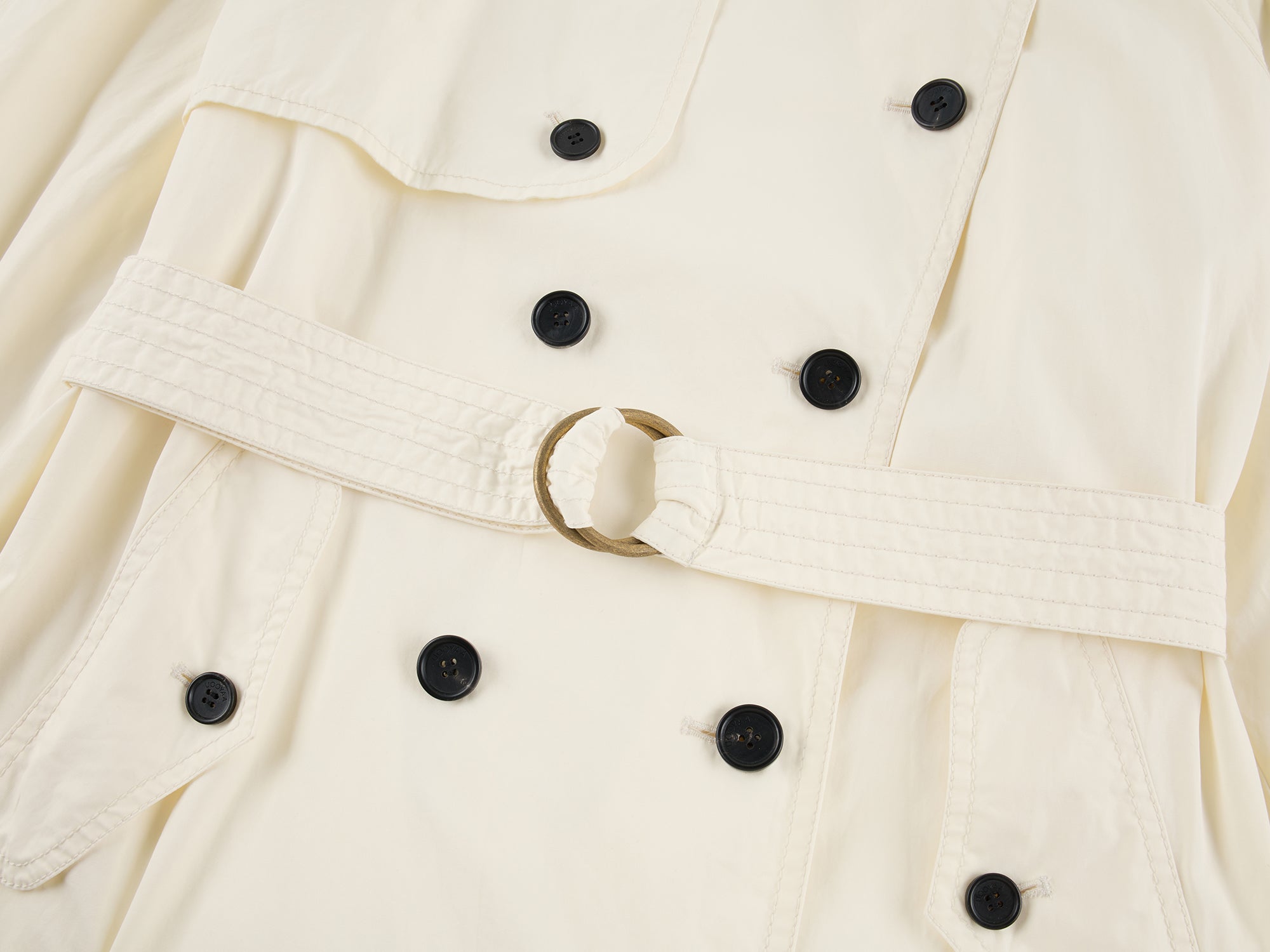 Double stitching details on a classic Westminster trench with thick round horn buttons and antique gold buckle.