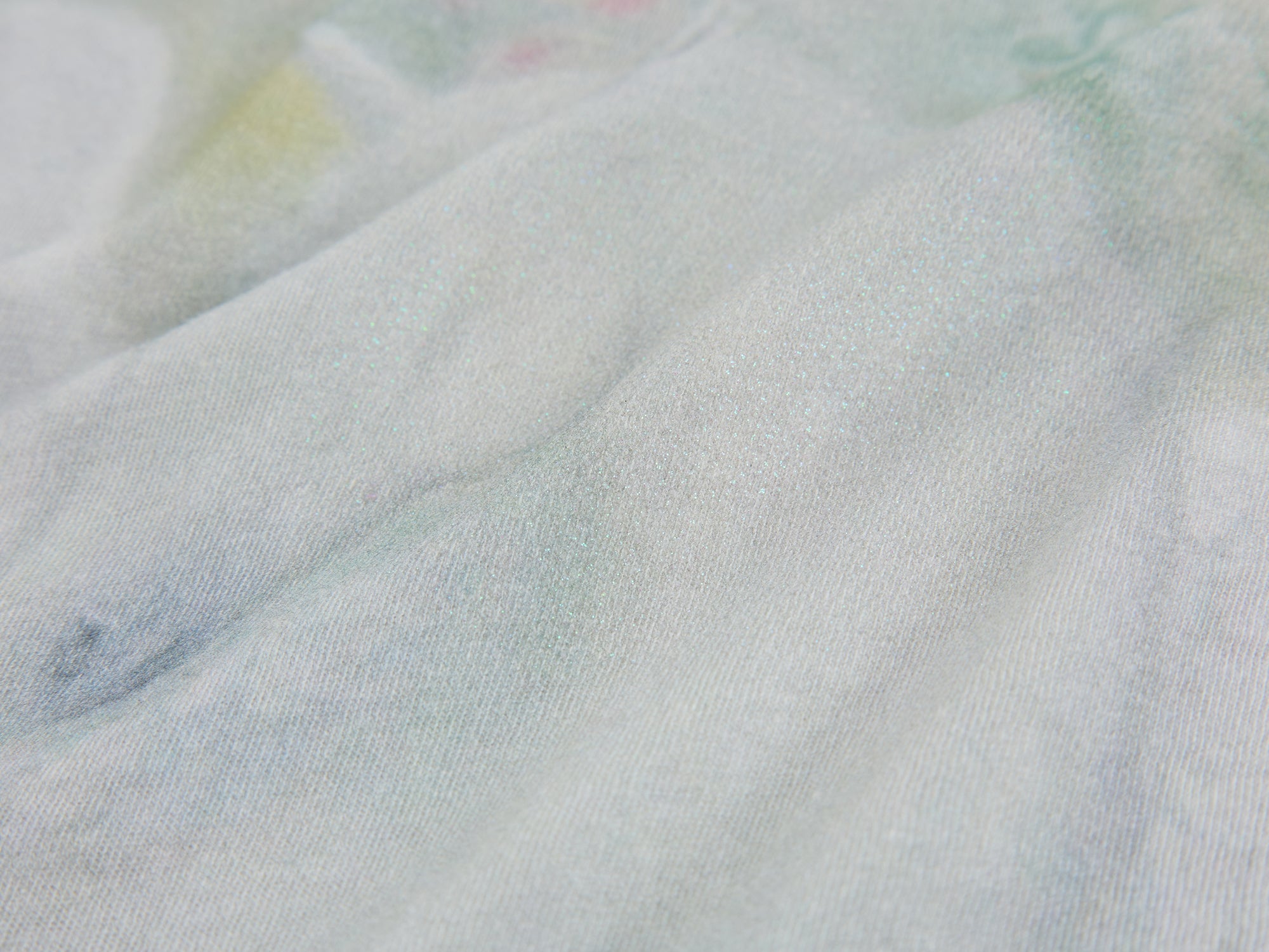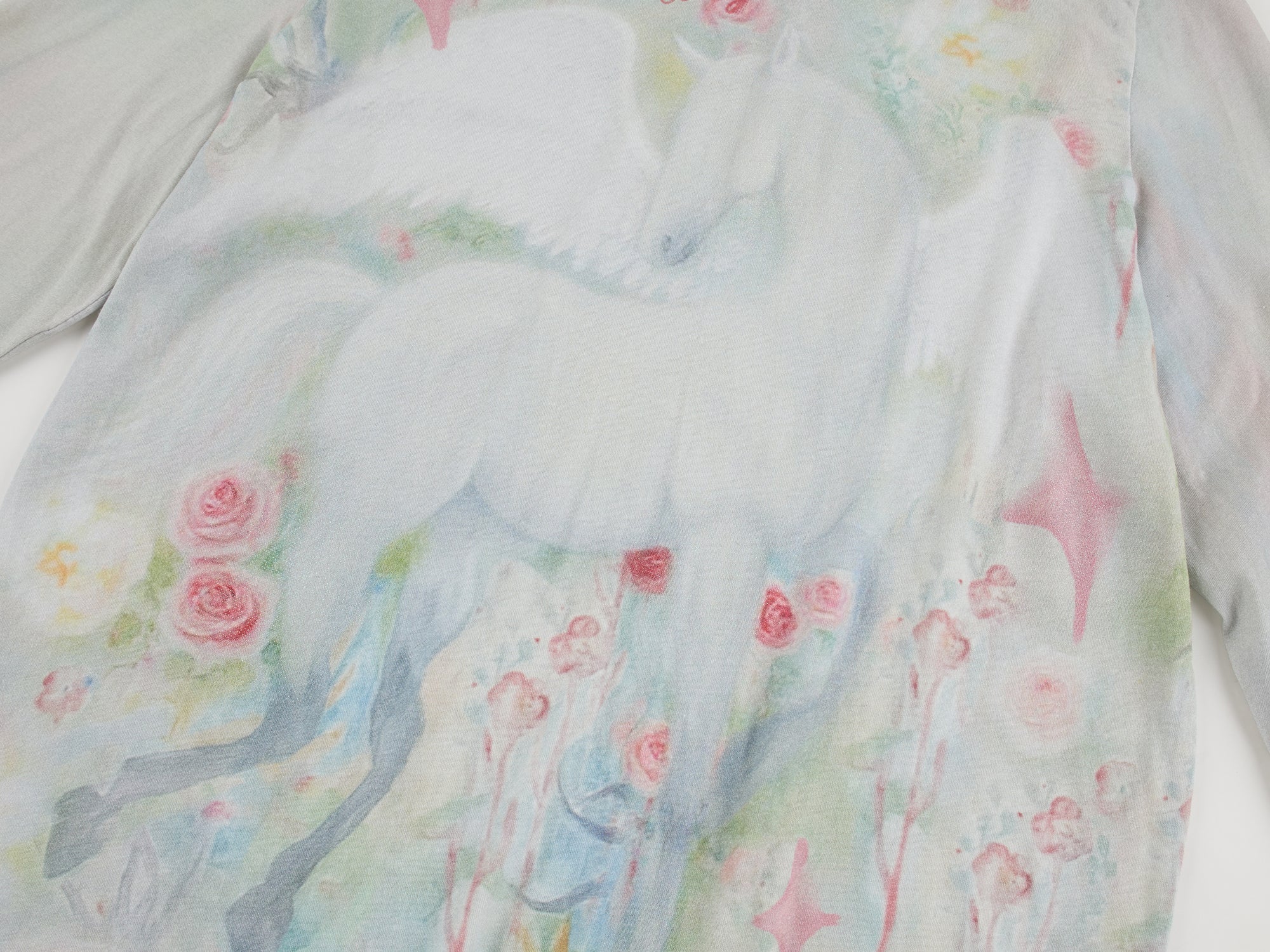 Painted-texture Pegasus from a magic garden with localized glitter print creates a dreamy feel.
