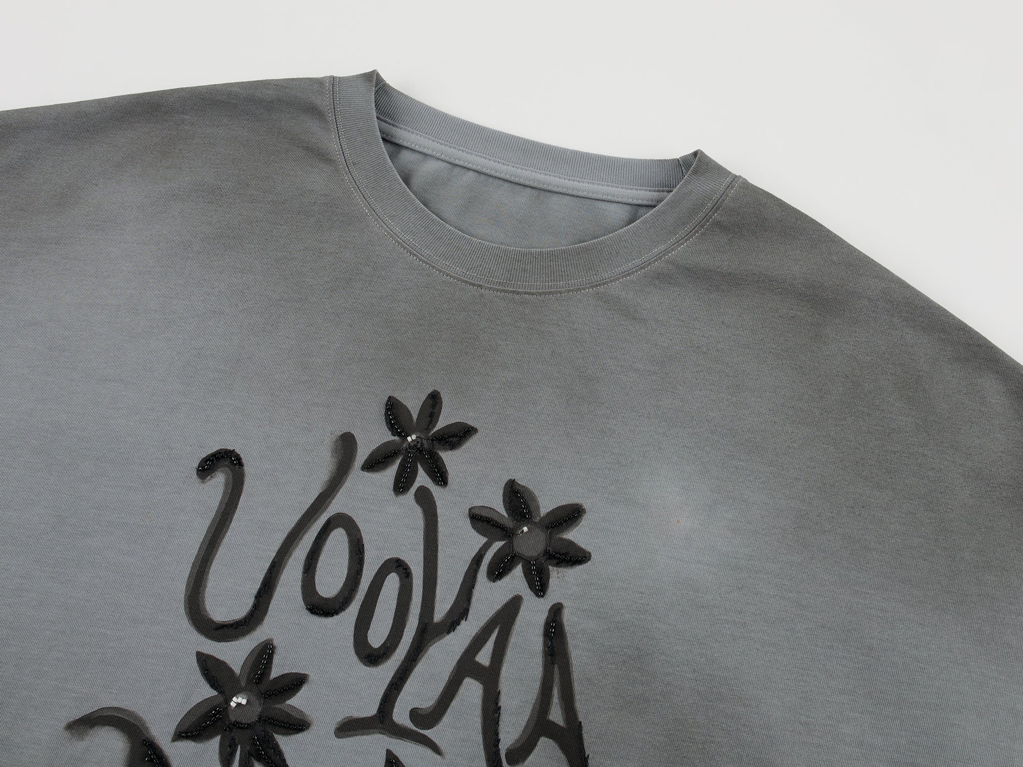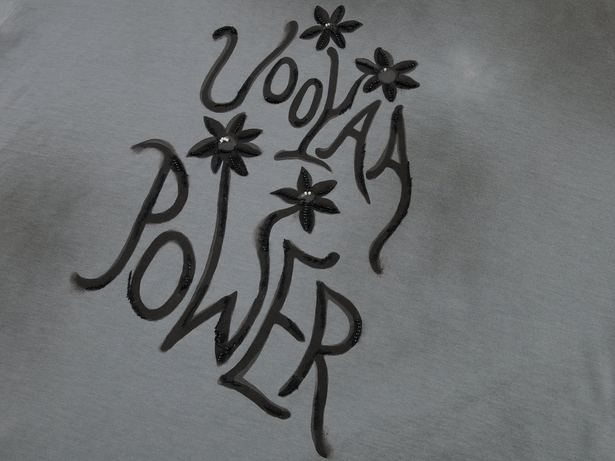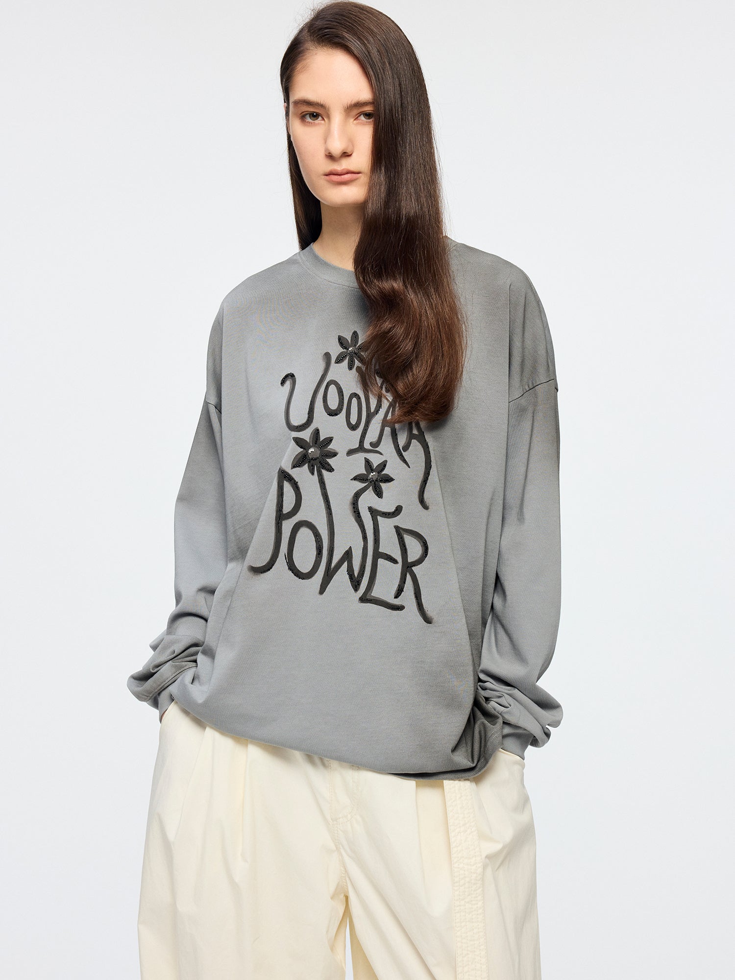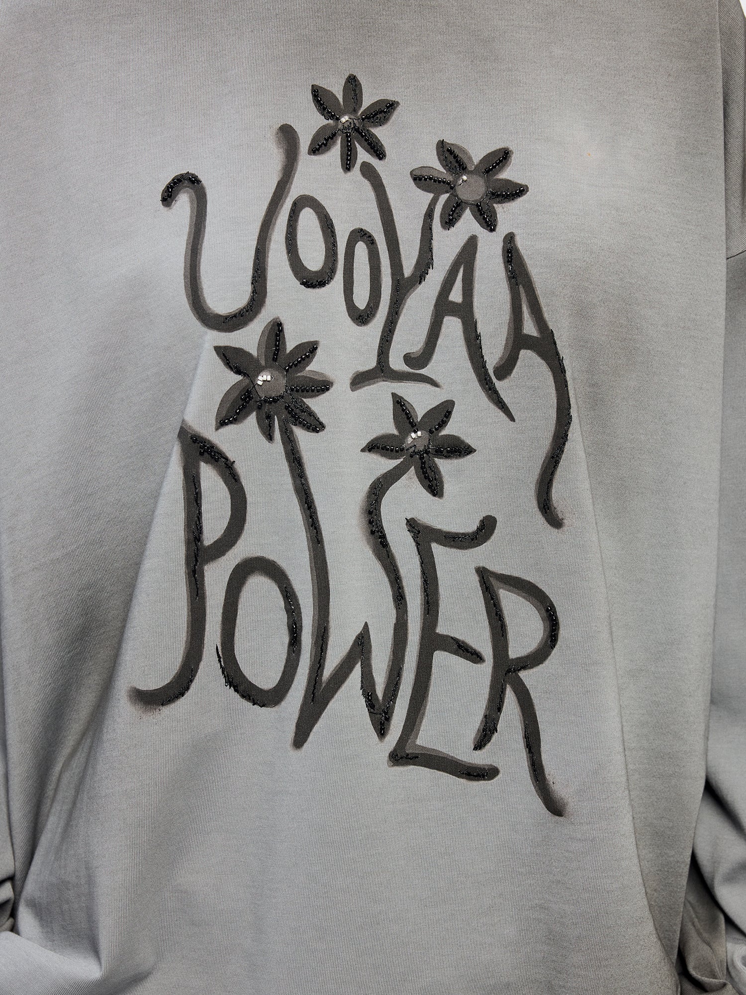 UOOYAA POWER combined with fantasy flower print, localized irregular distressed spraying, and bead embroidery for a casual, artistic look.