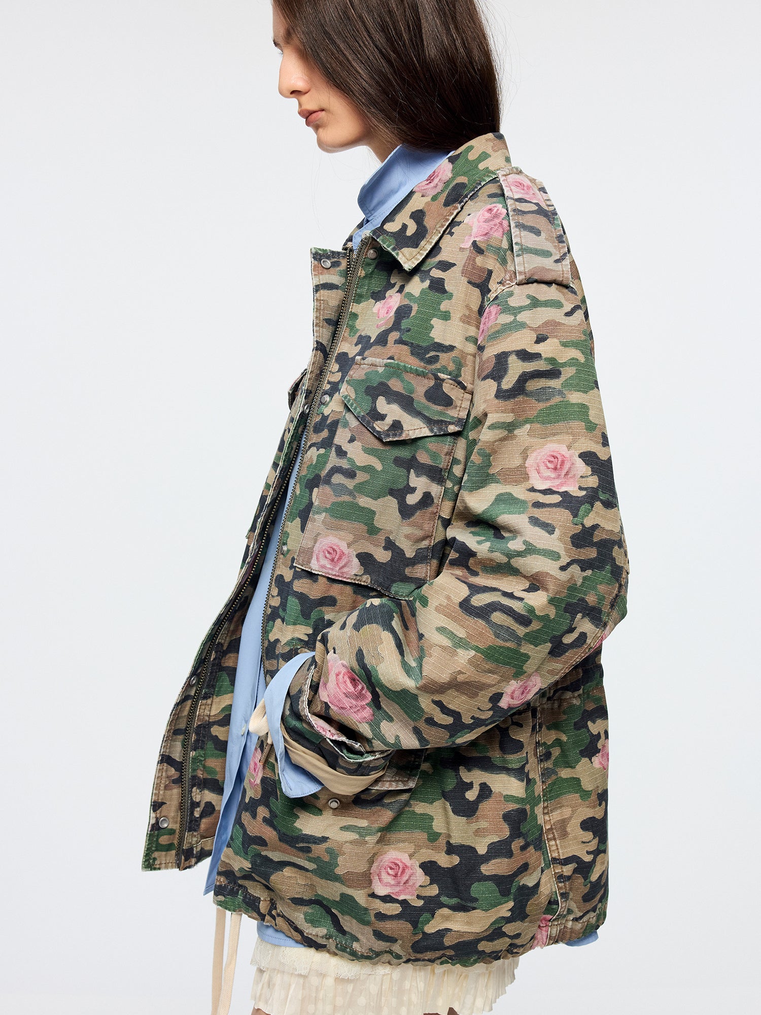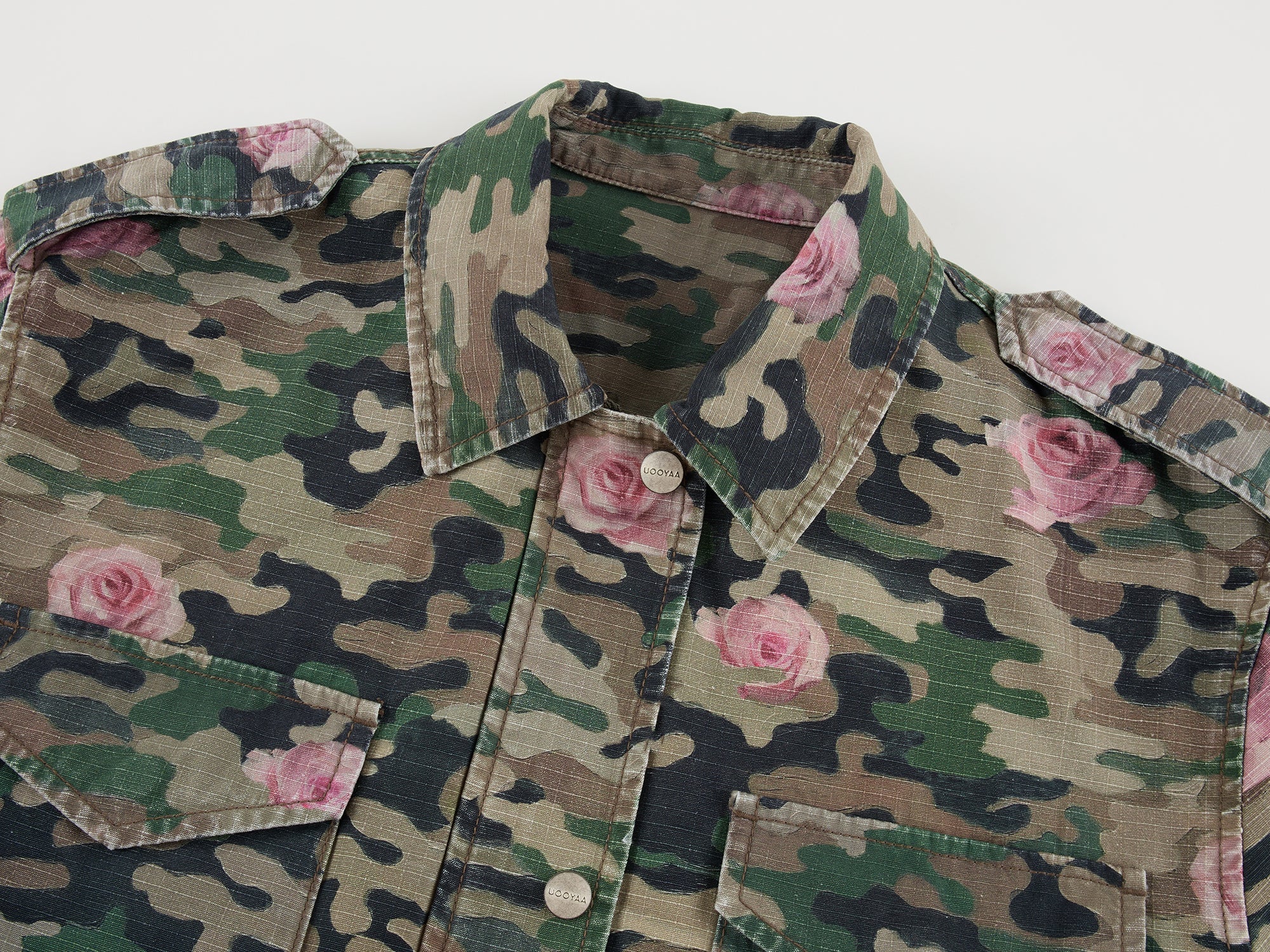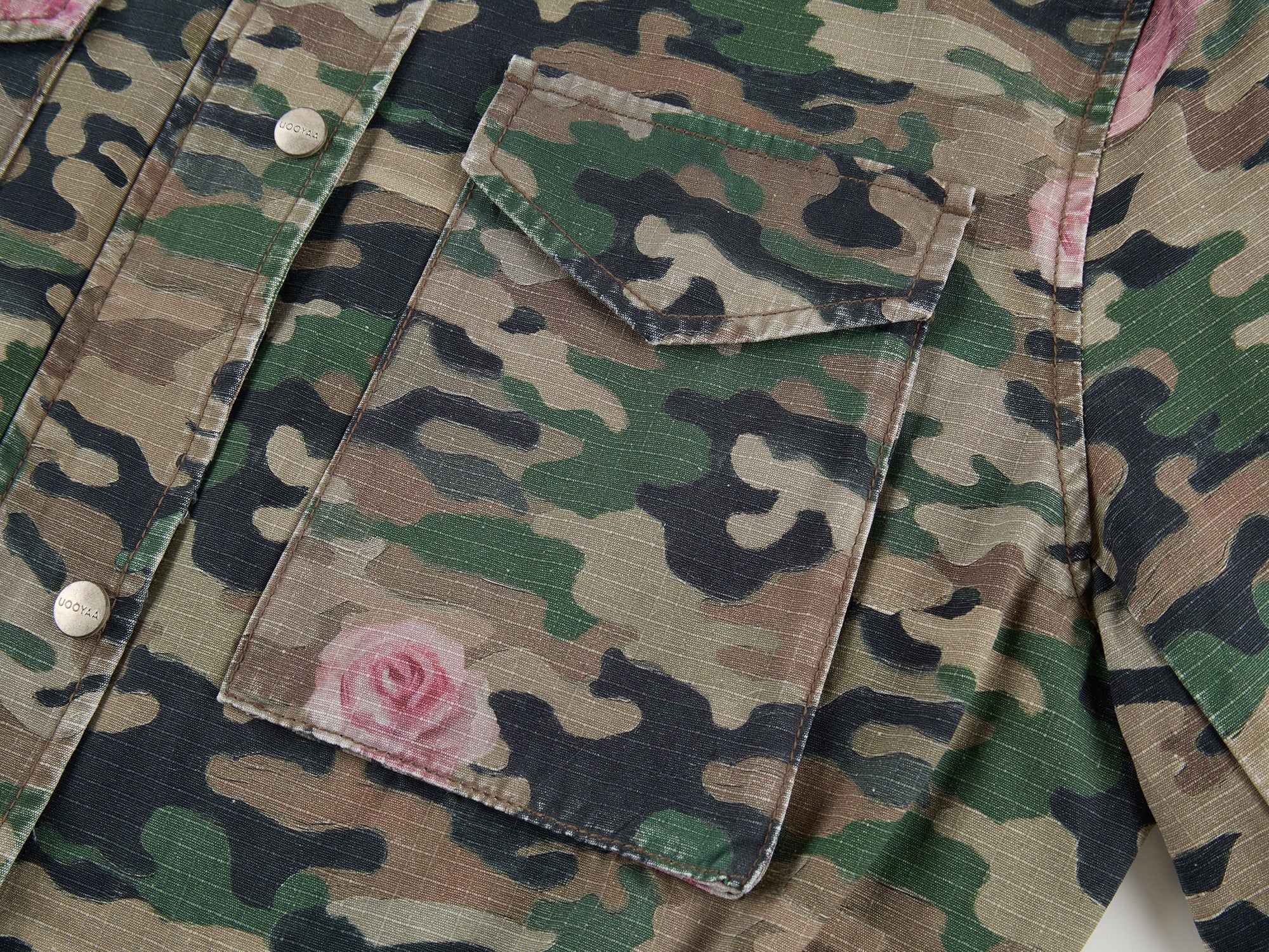 Oil painting texture expresses surreal rose camouflage, giving the M43 jacket a whimsical, romantic style.