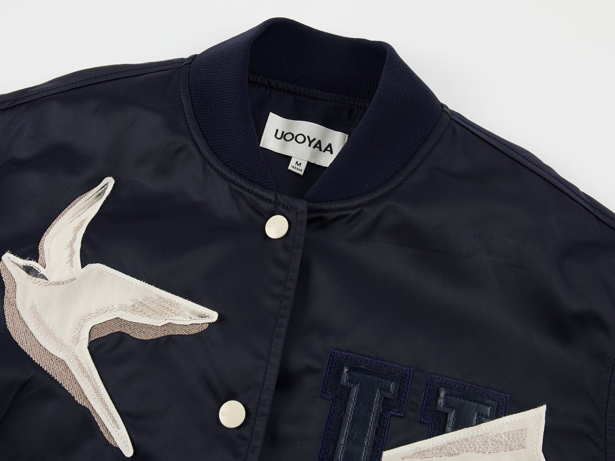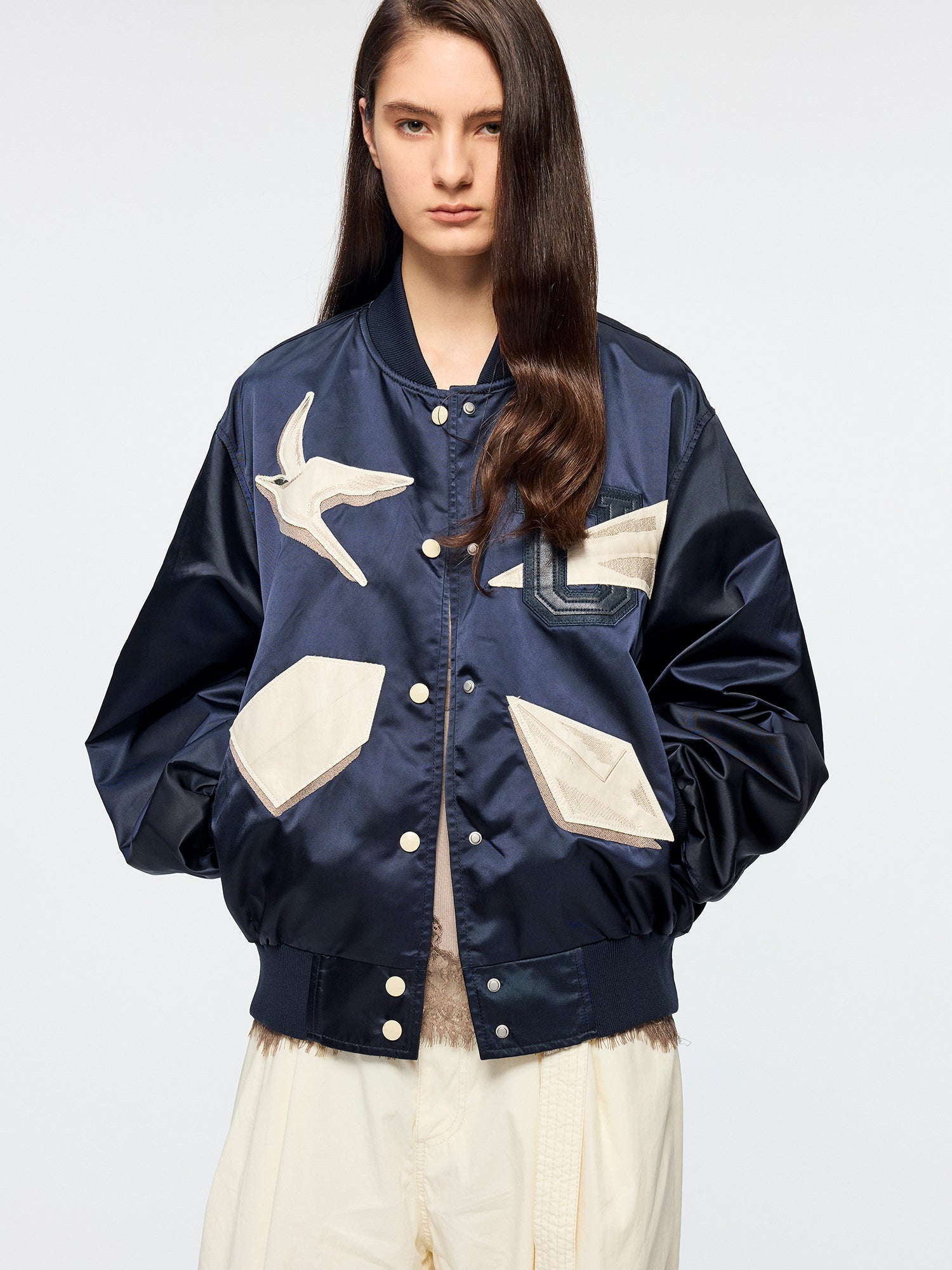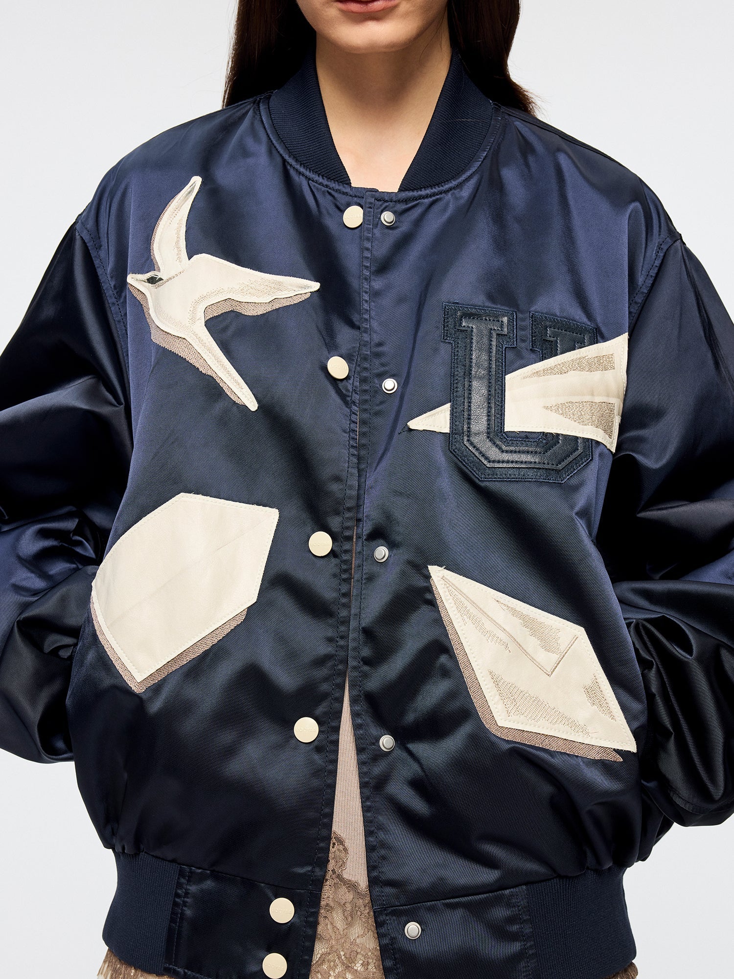 PU leather applique embroidery presents surreal origami birds and paper plane folding process, giving the classic baseball jacket a whimsical, refined touch.