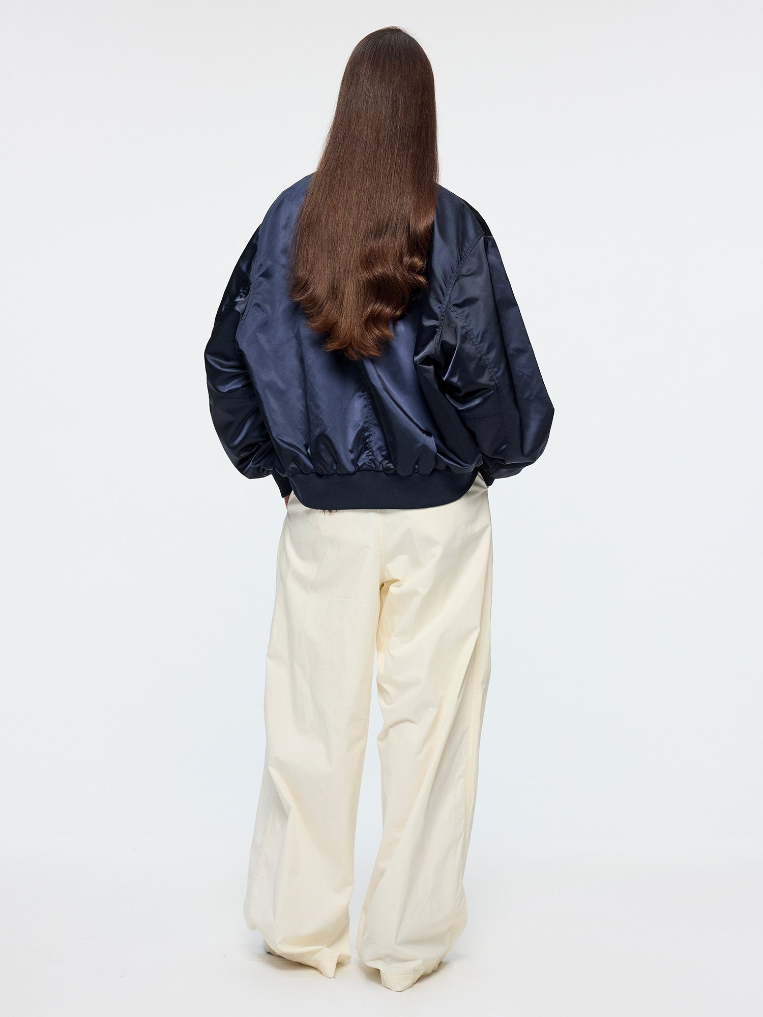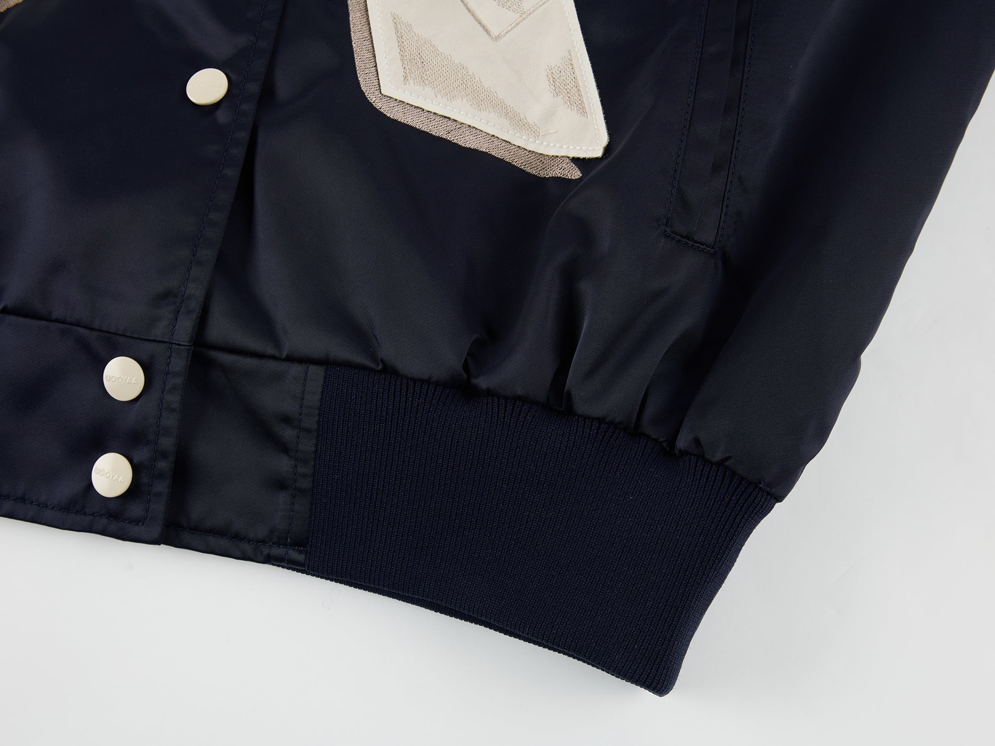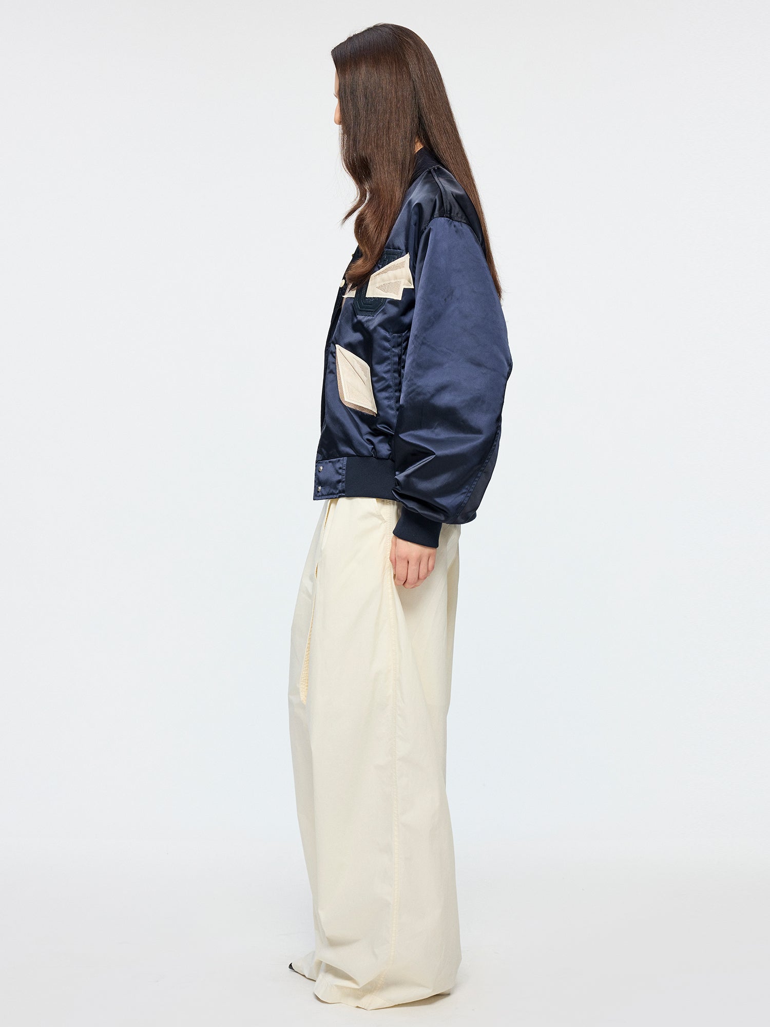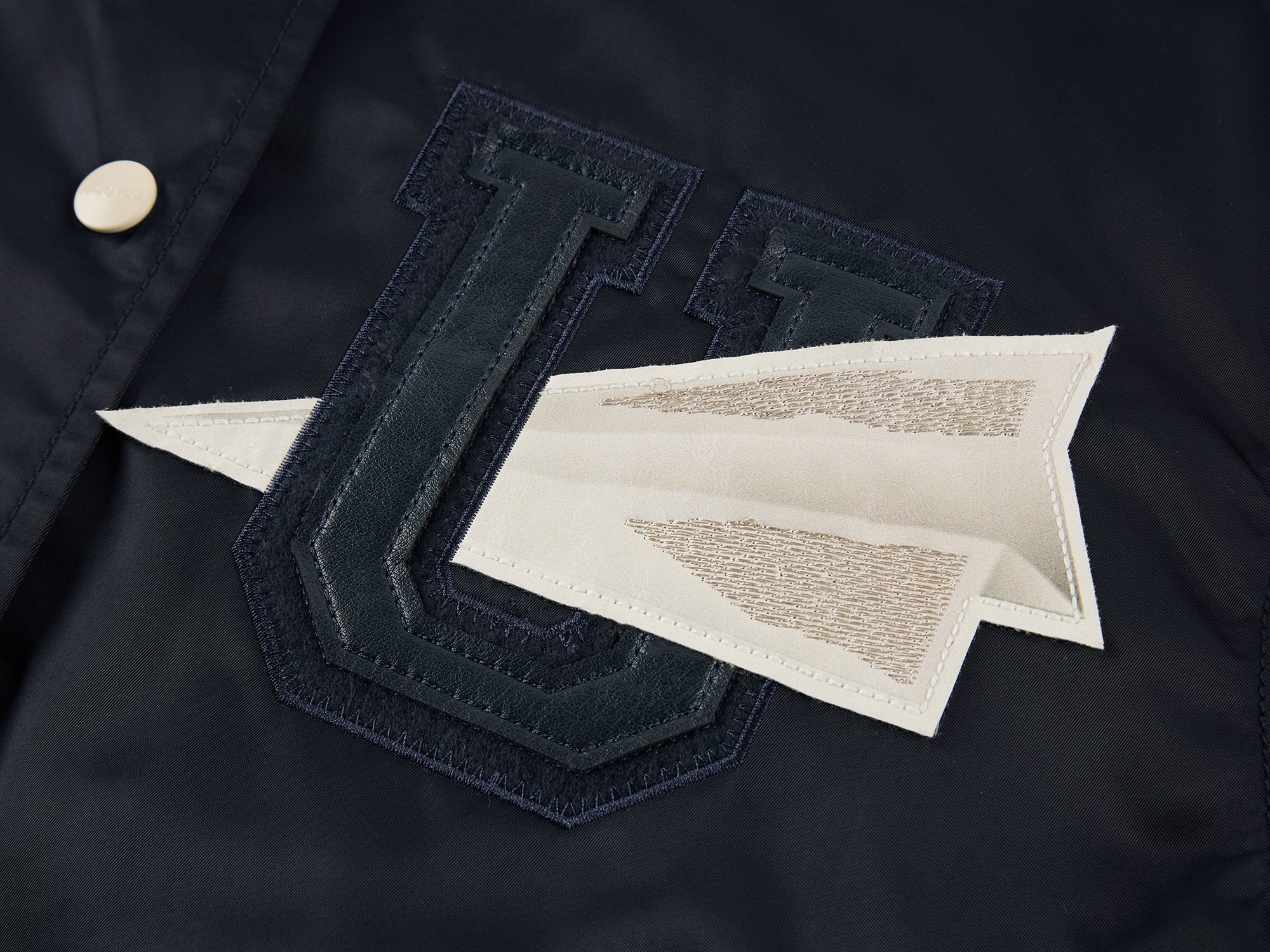 PU leather applique embroidery presents surreal origami birds and paper plane folding process, giving the classic baseball jacket a whimsical, refined touch.