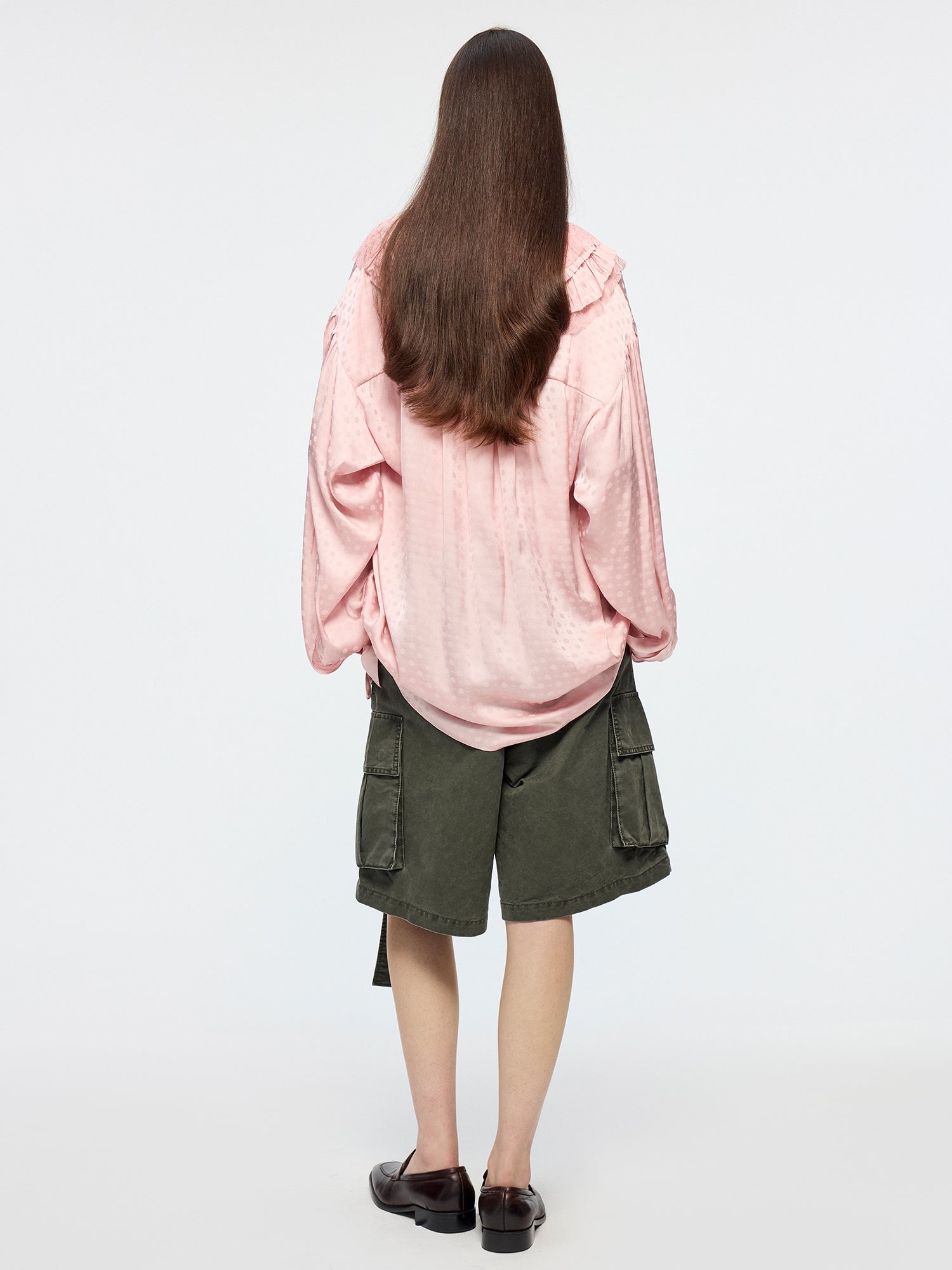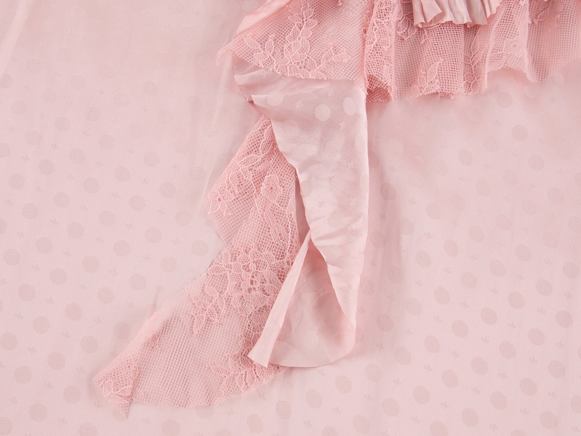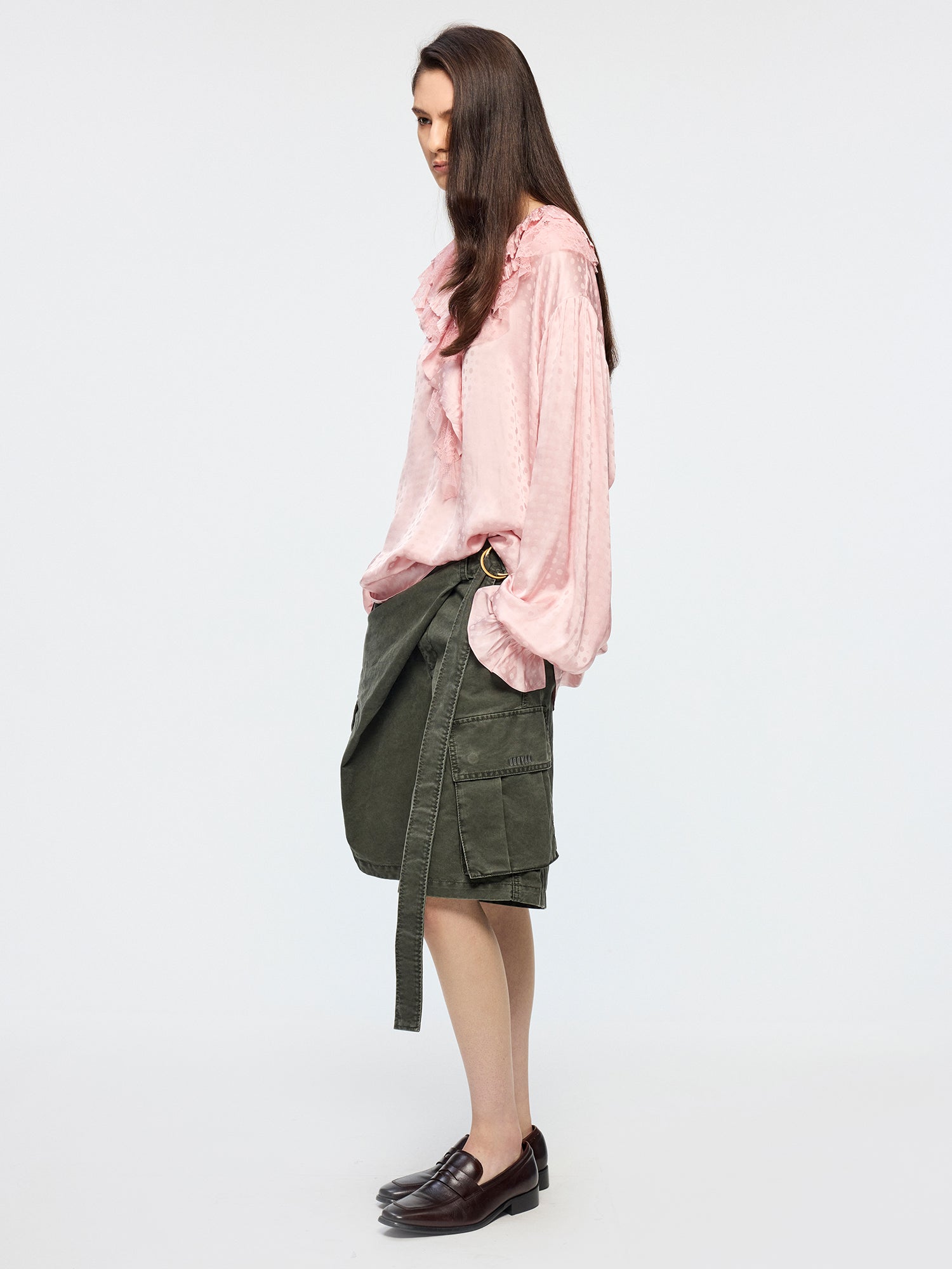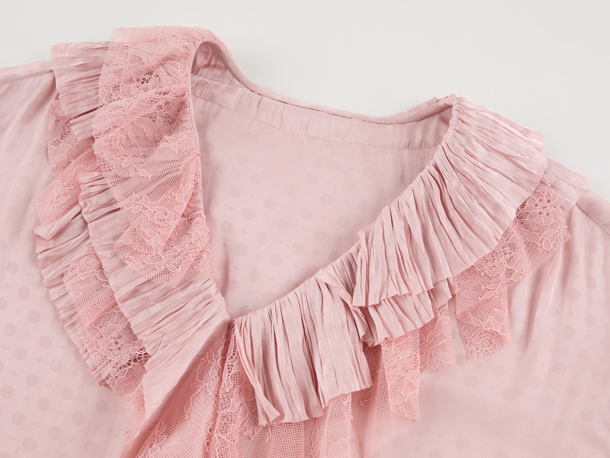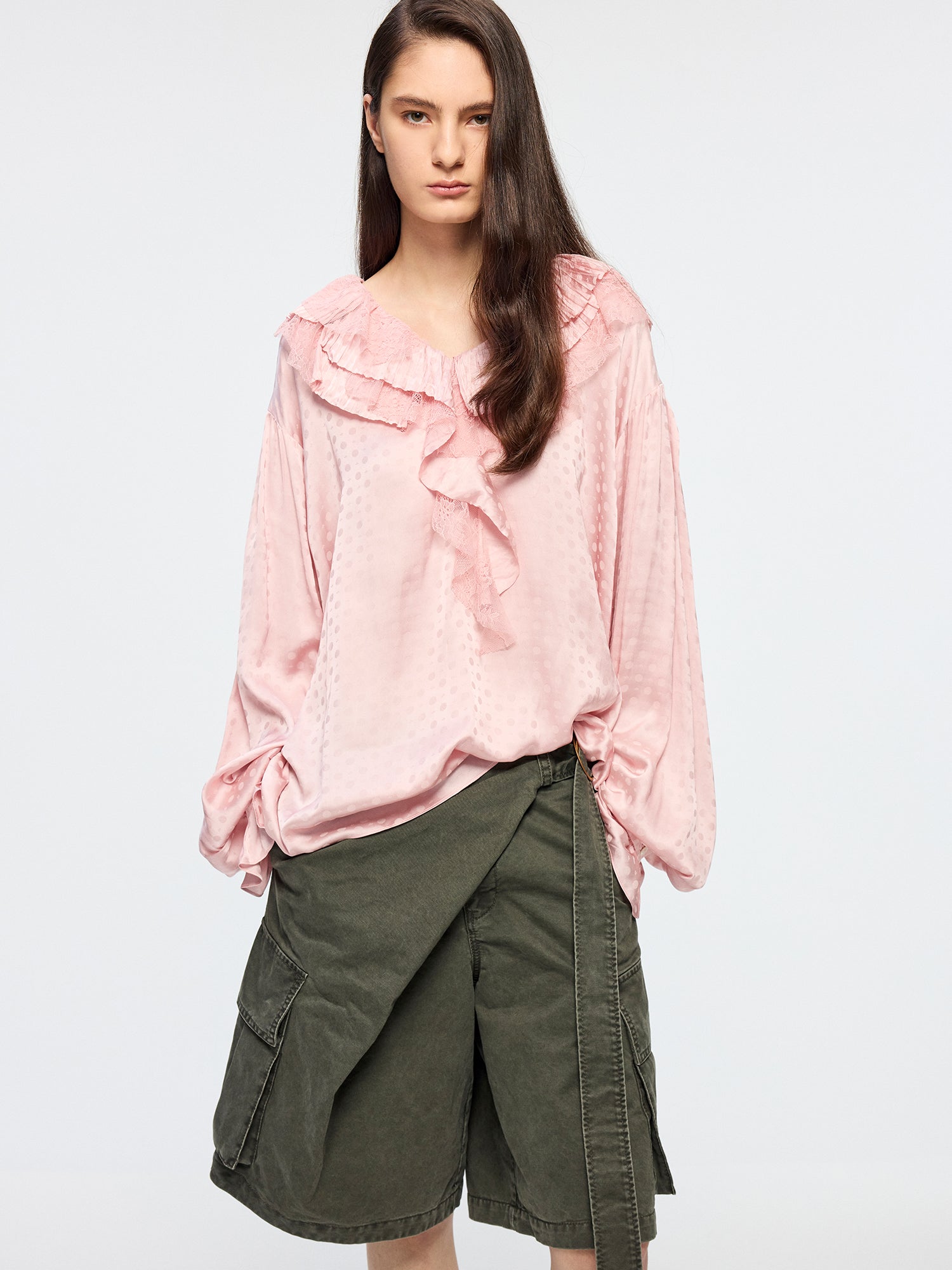 V-neck ruffle shirt features irregular layering of lace and jacquard fabrics in a relaxed fit.