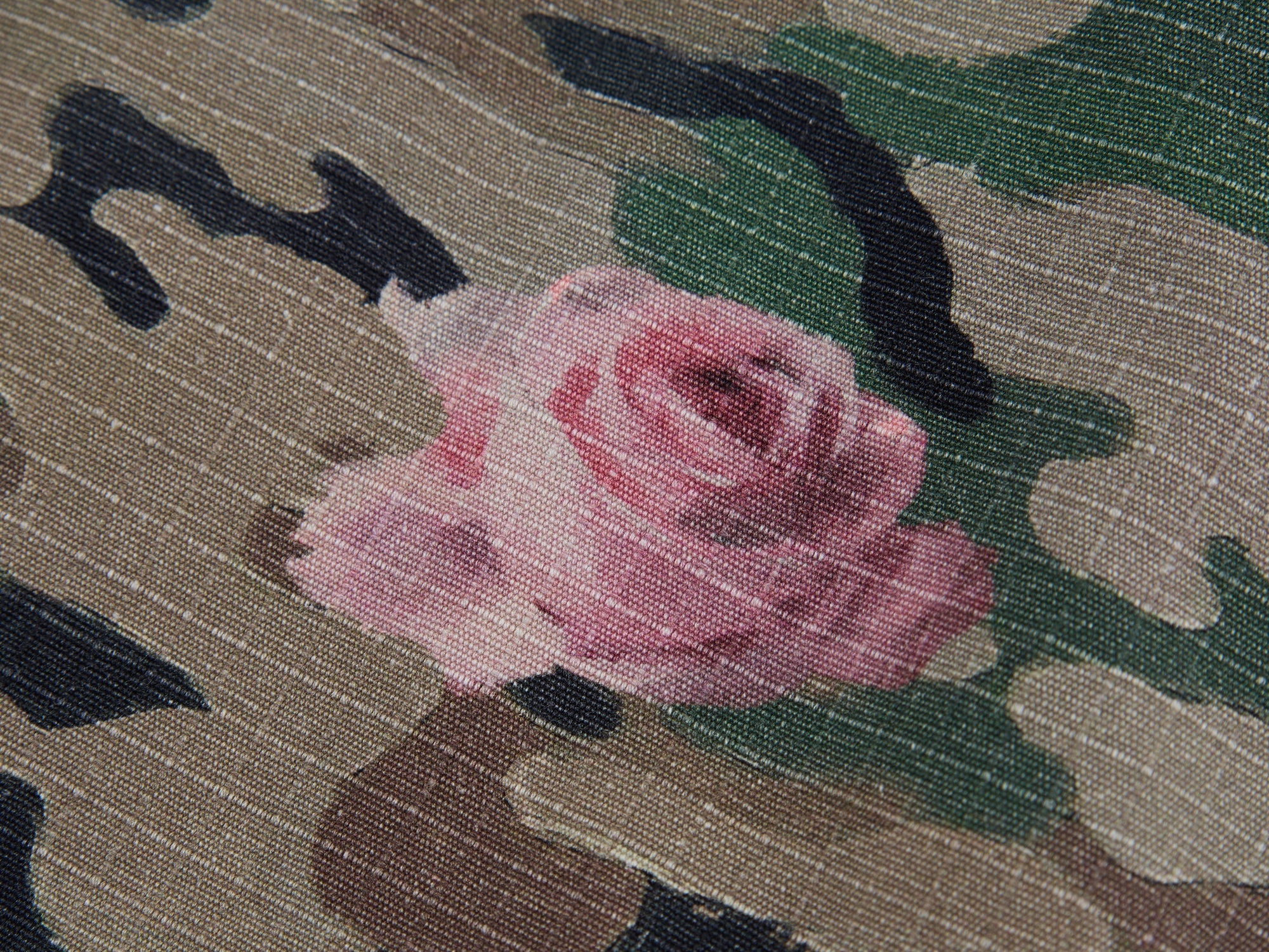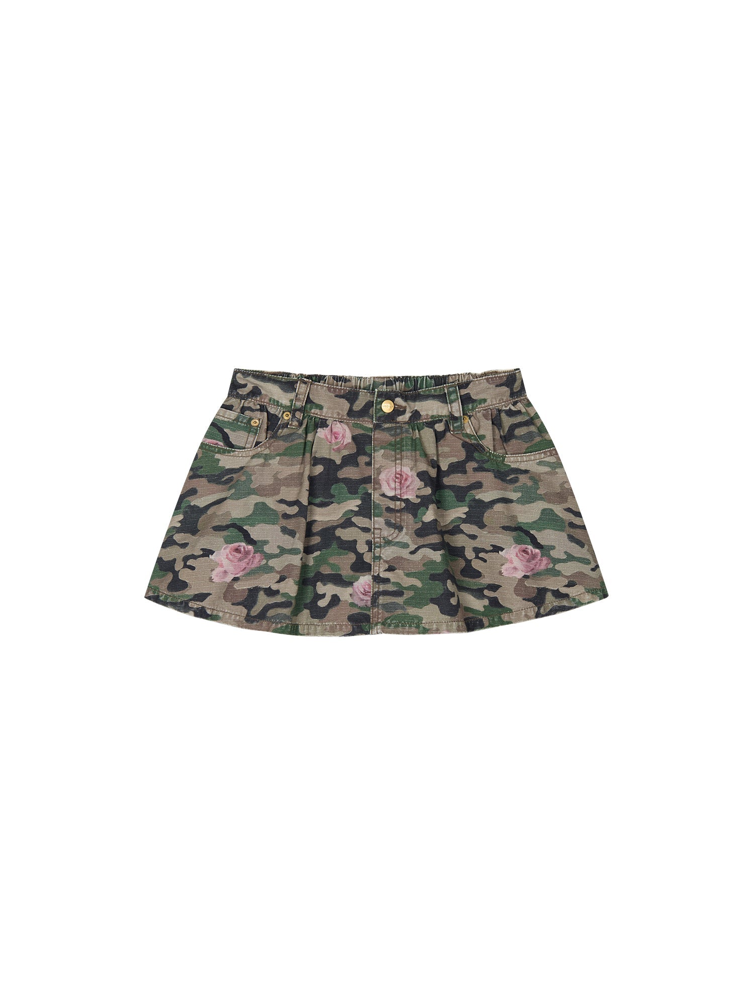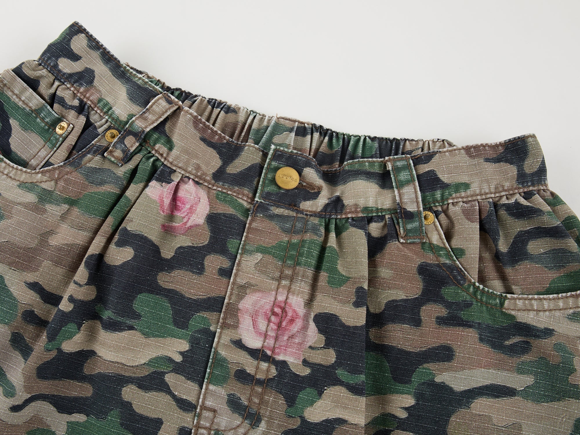 Oil painting texture expresses surreal rose camouflage, giving the youthful five-pocket mini skirt a whimsical, romantic style.