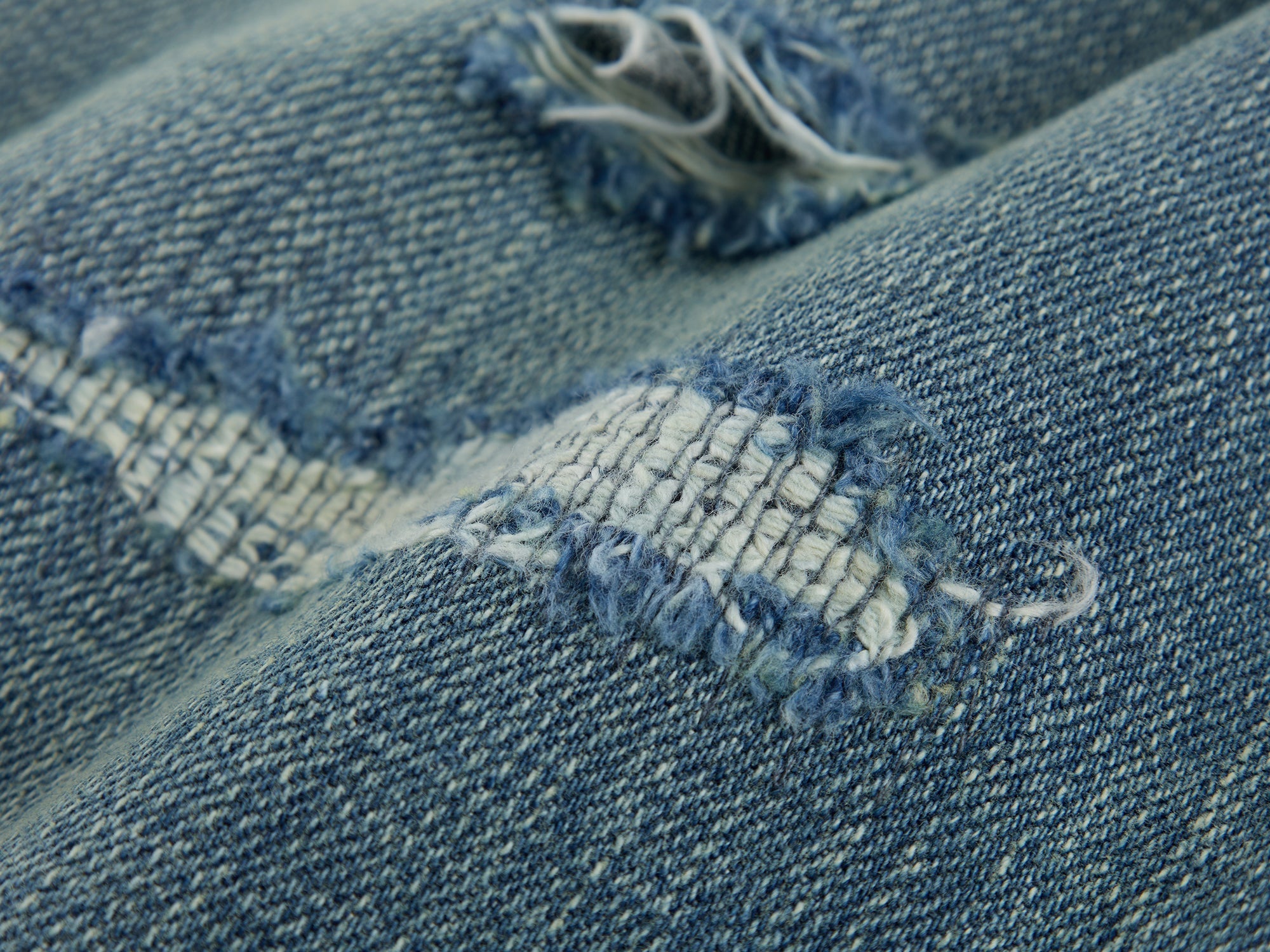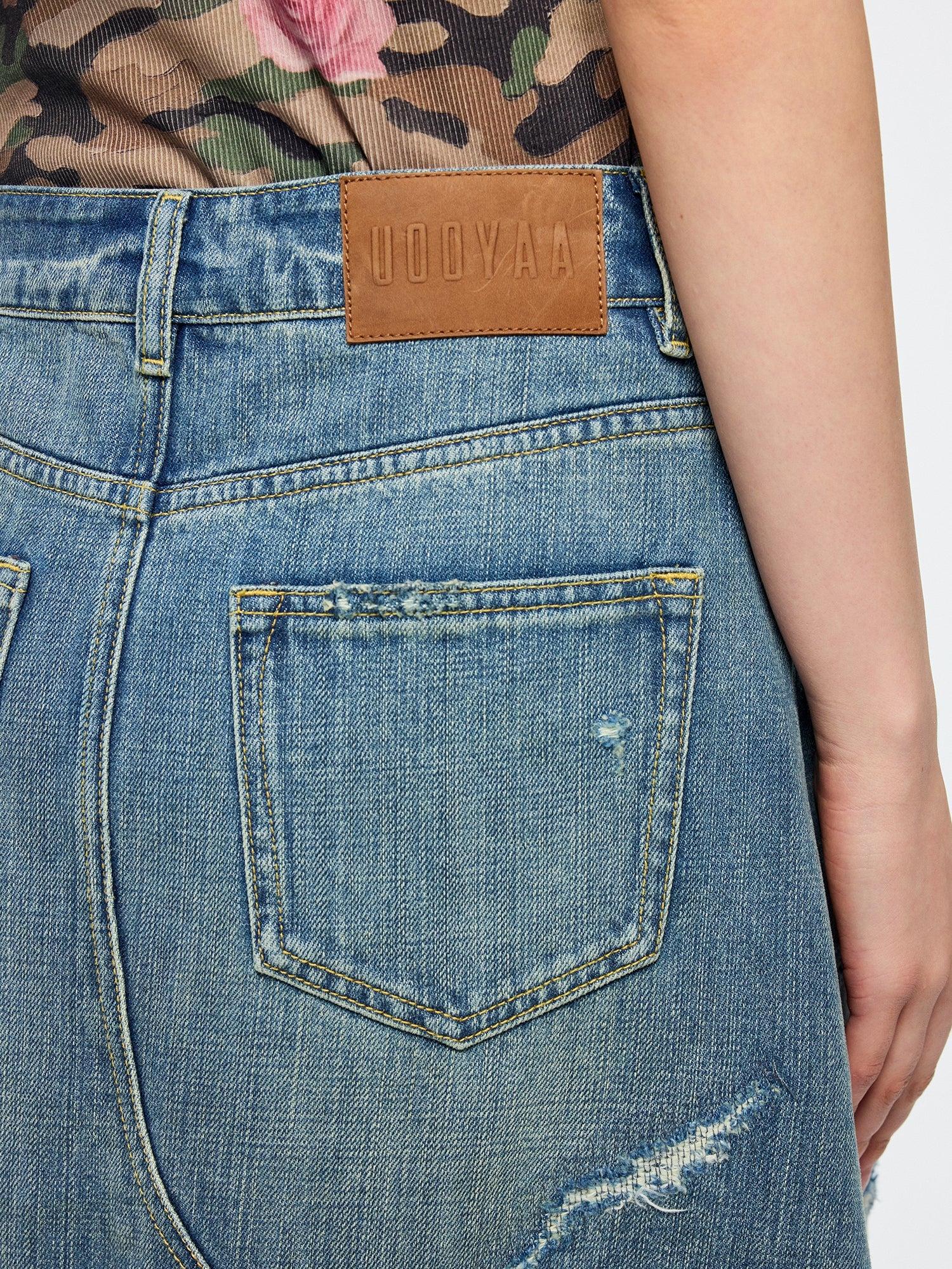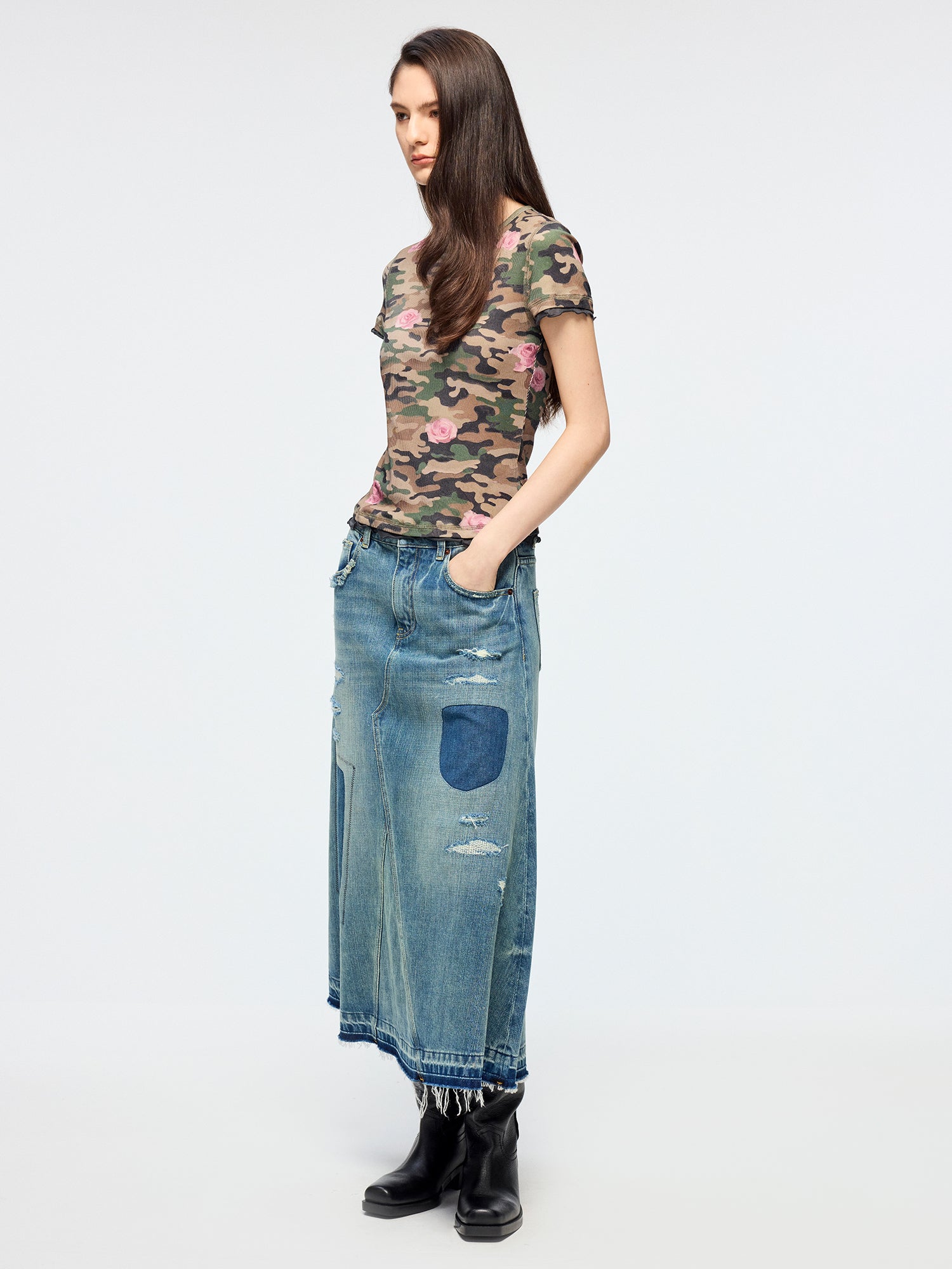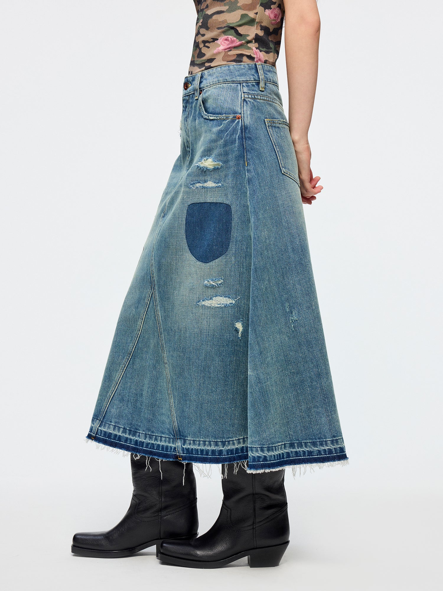 Distressed patchwork denim skirt
