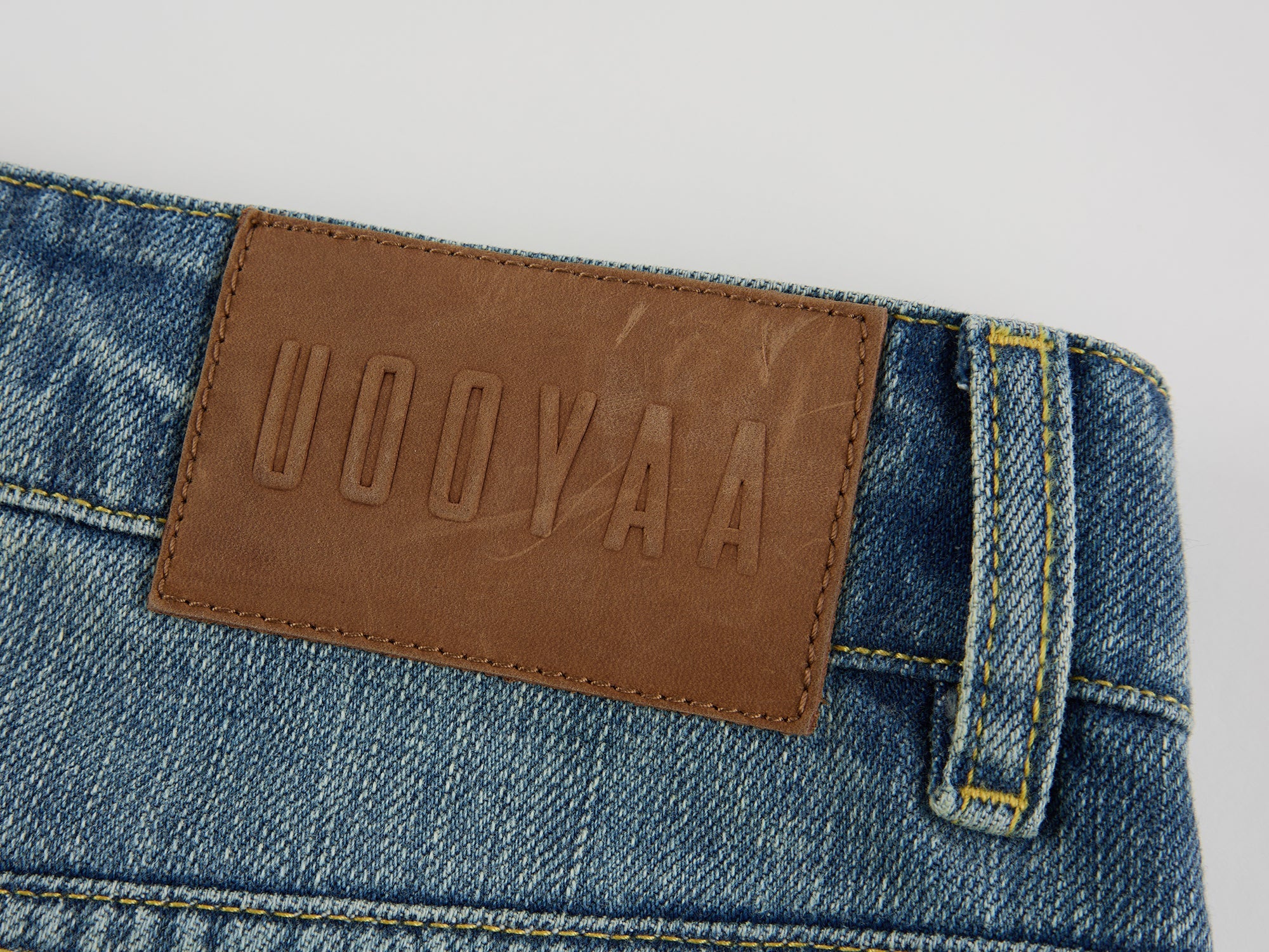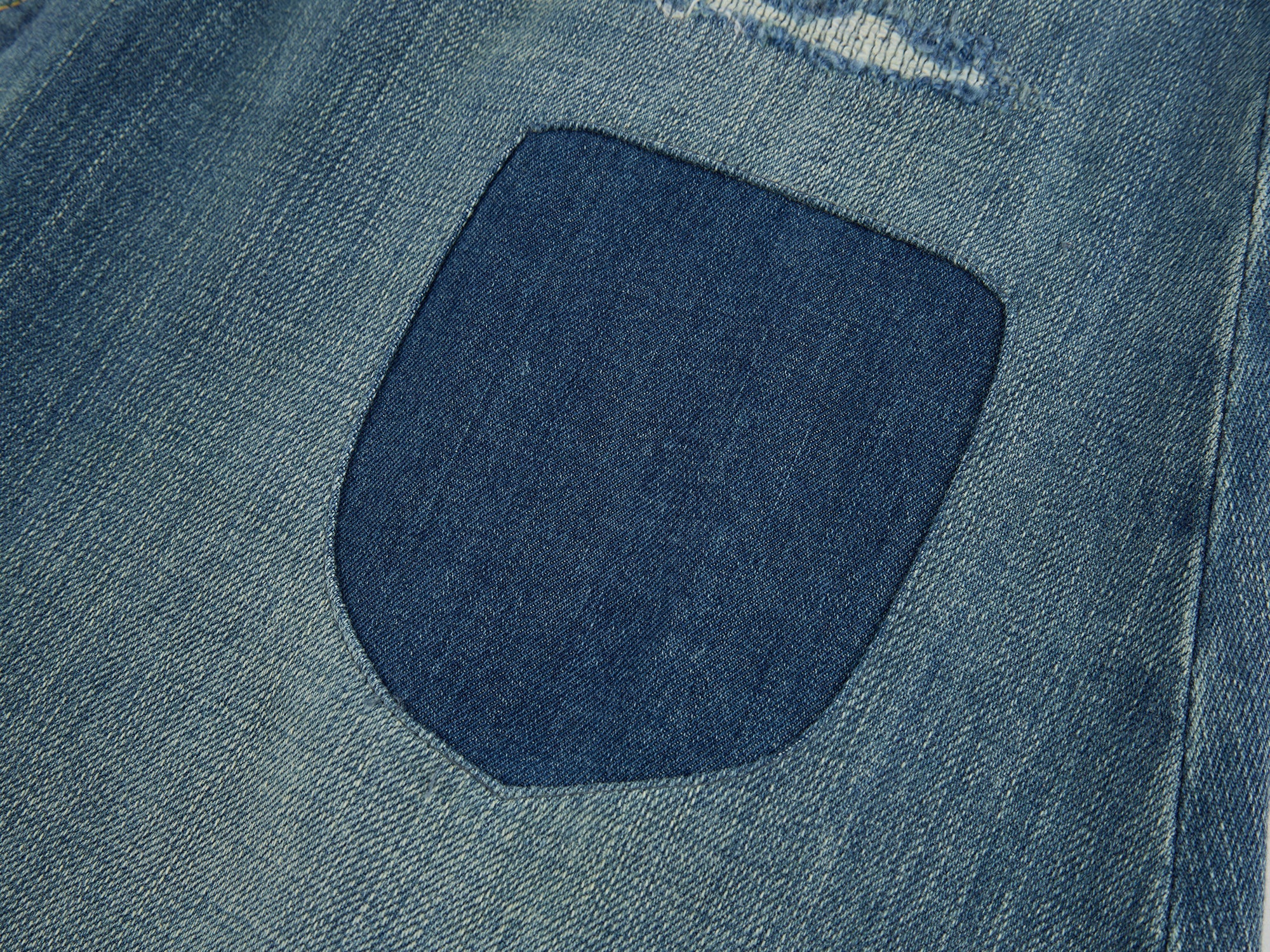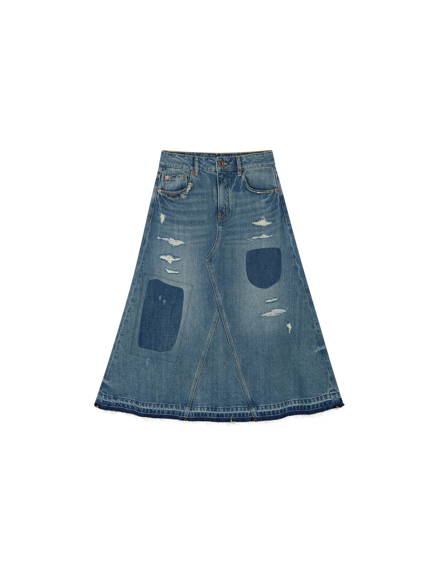 Hand-made remake distressing and shield-shaped patches on a washed five-pocket denim skirt add vintage casual style.