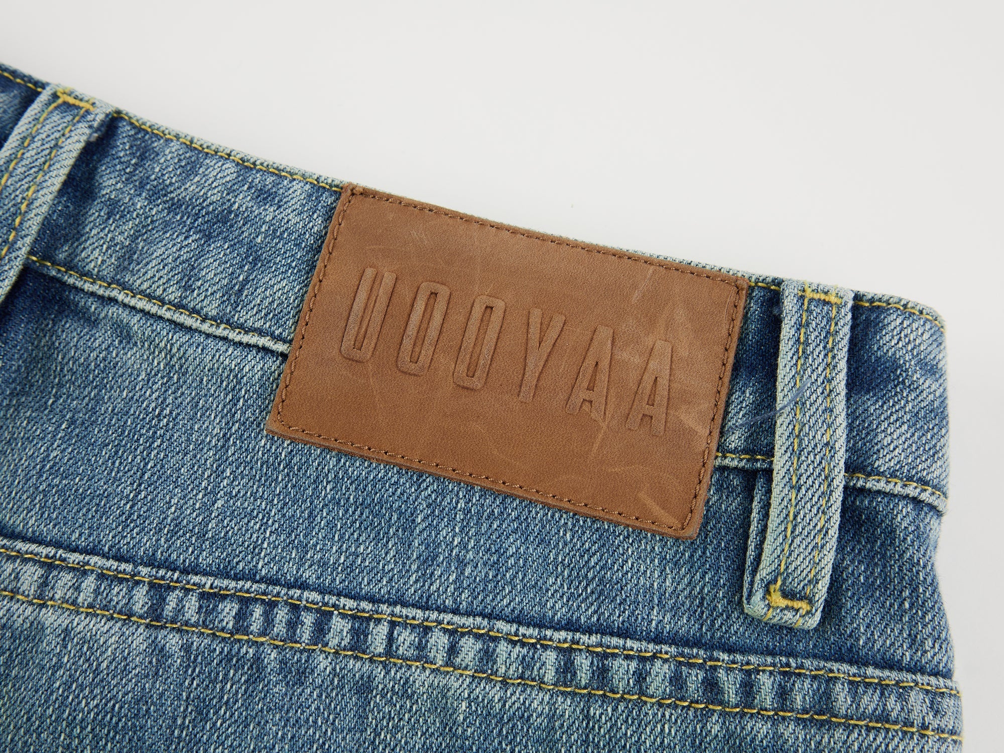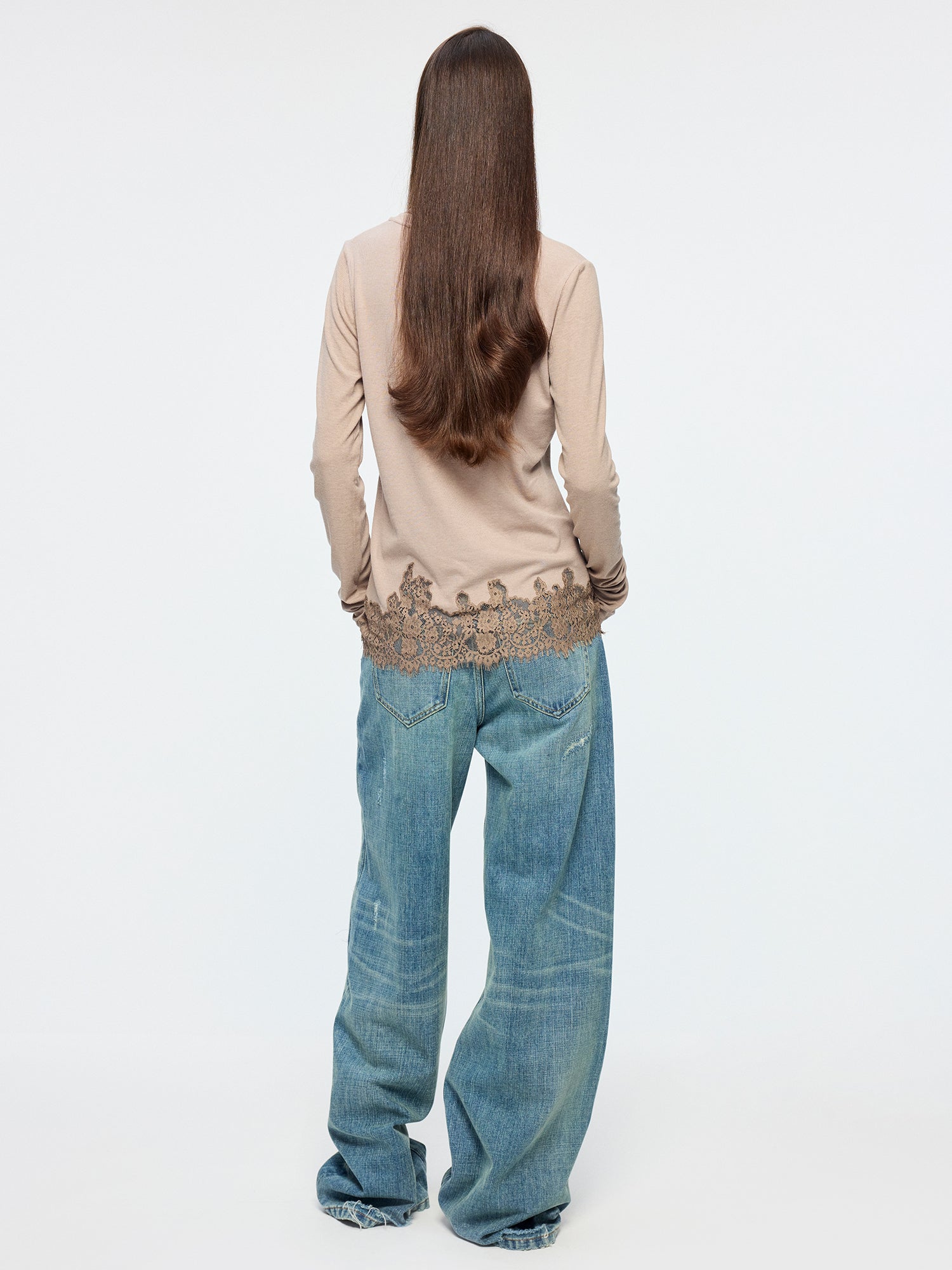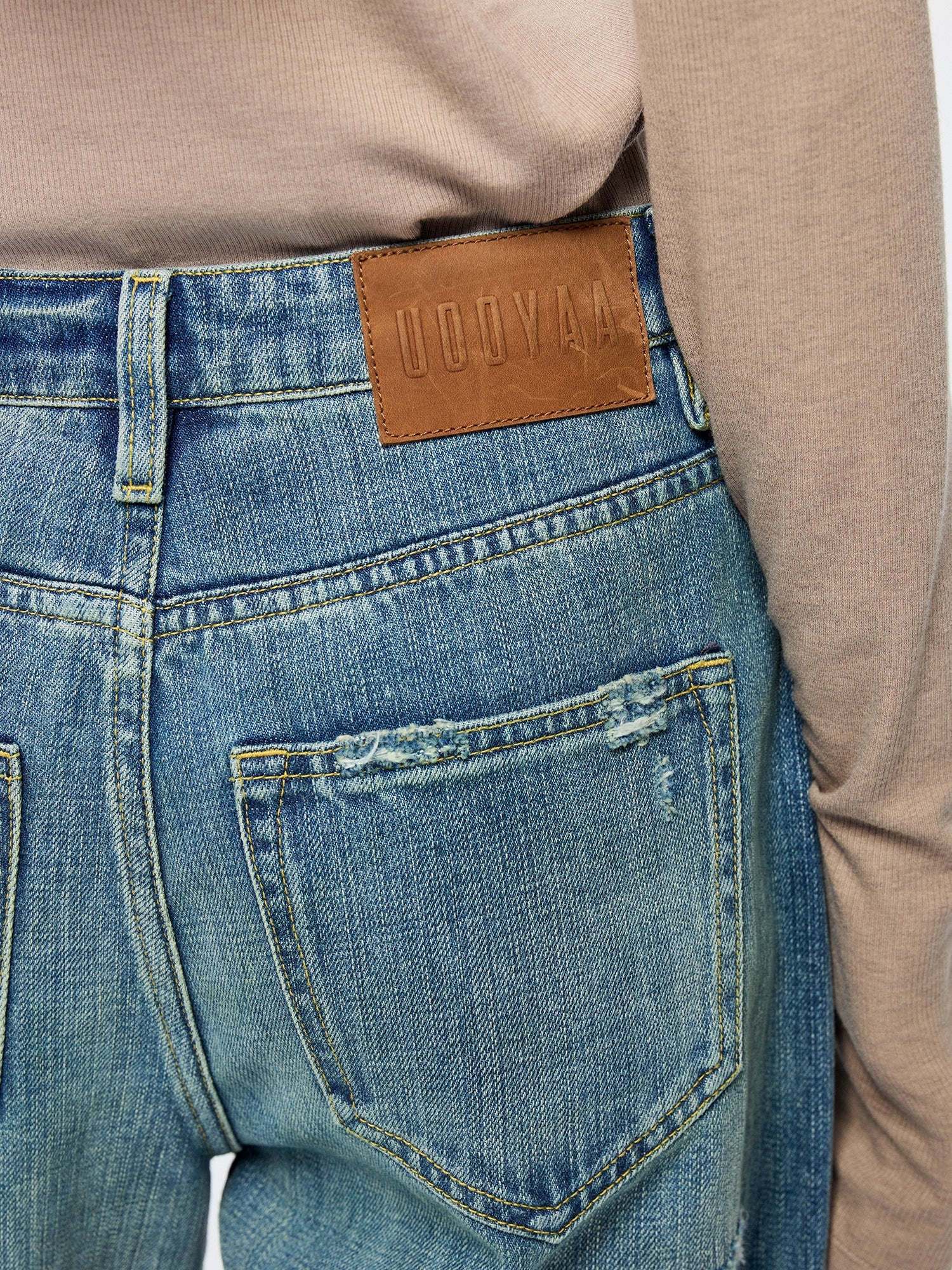 Hand-made remake distressing and shield-shaped patches on washed five-pocket jeans add vintage casual style.