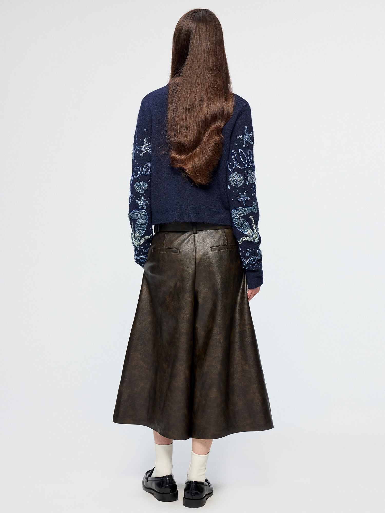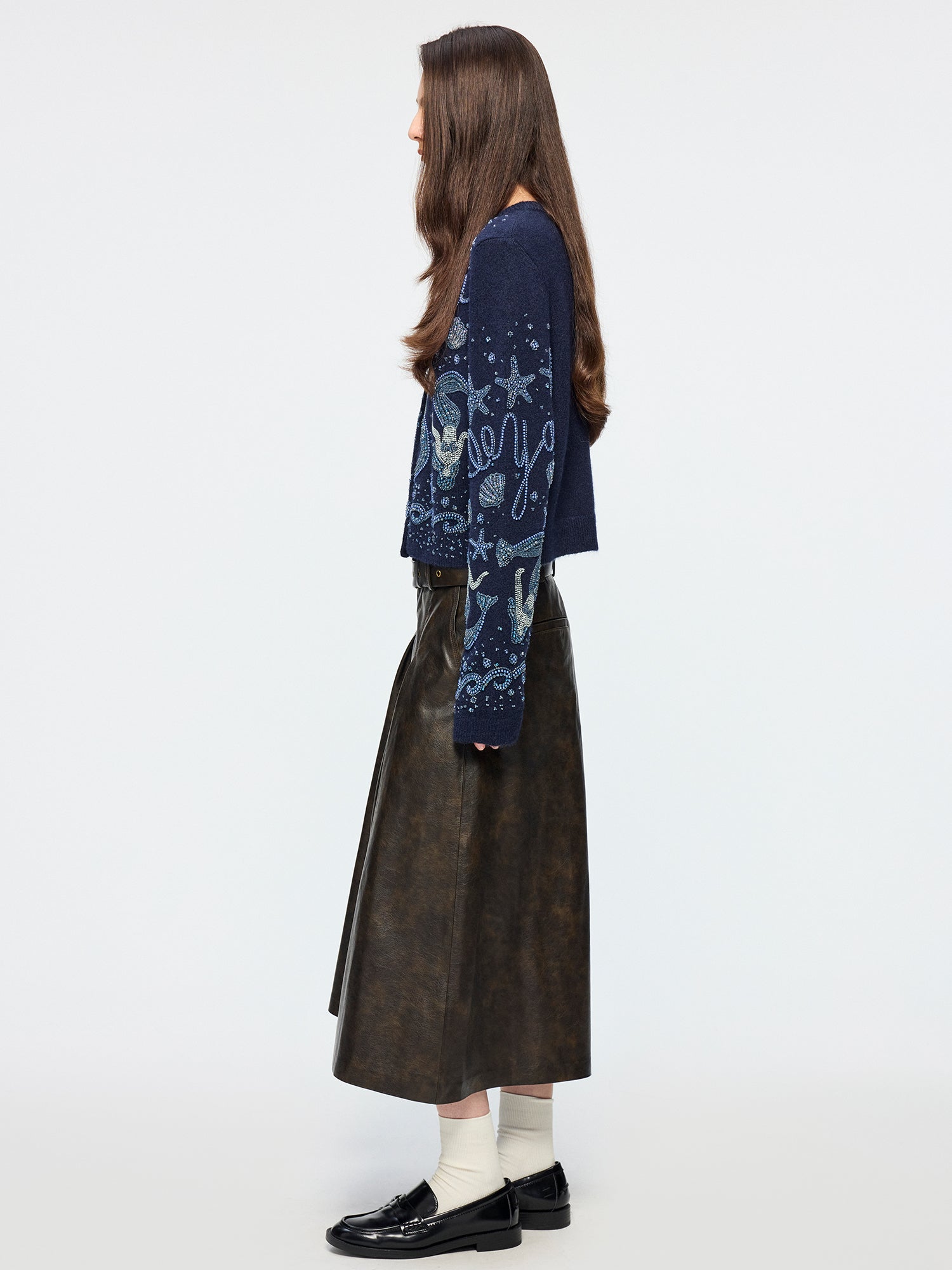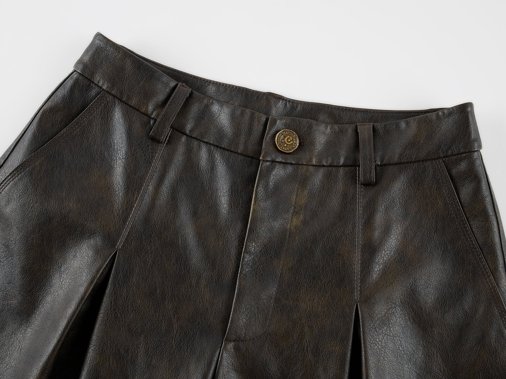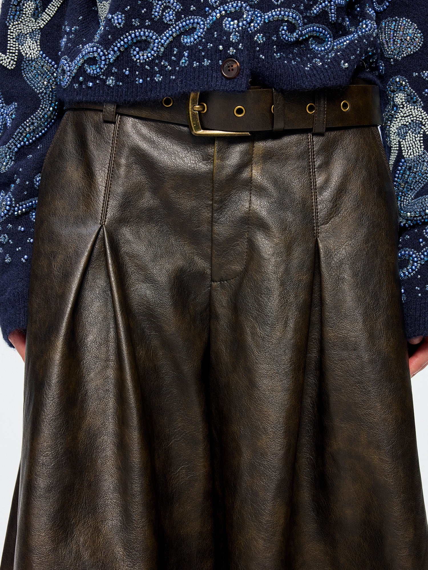 Cropped wide-leg silhouette features a pleated waist, rubbed PU fabric, and an antique gold belt for a vintage urban look.
