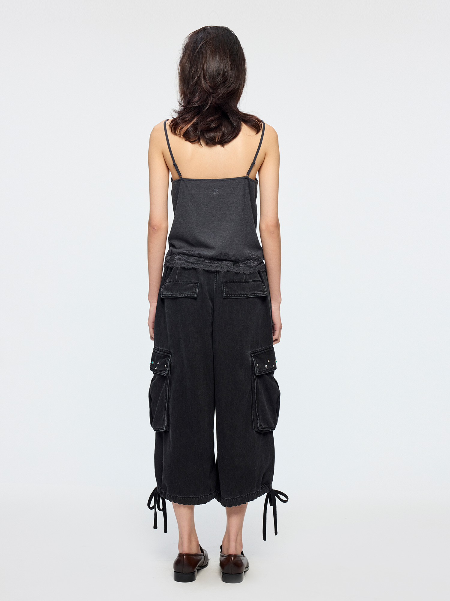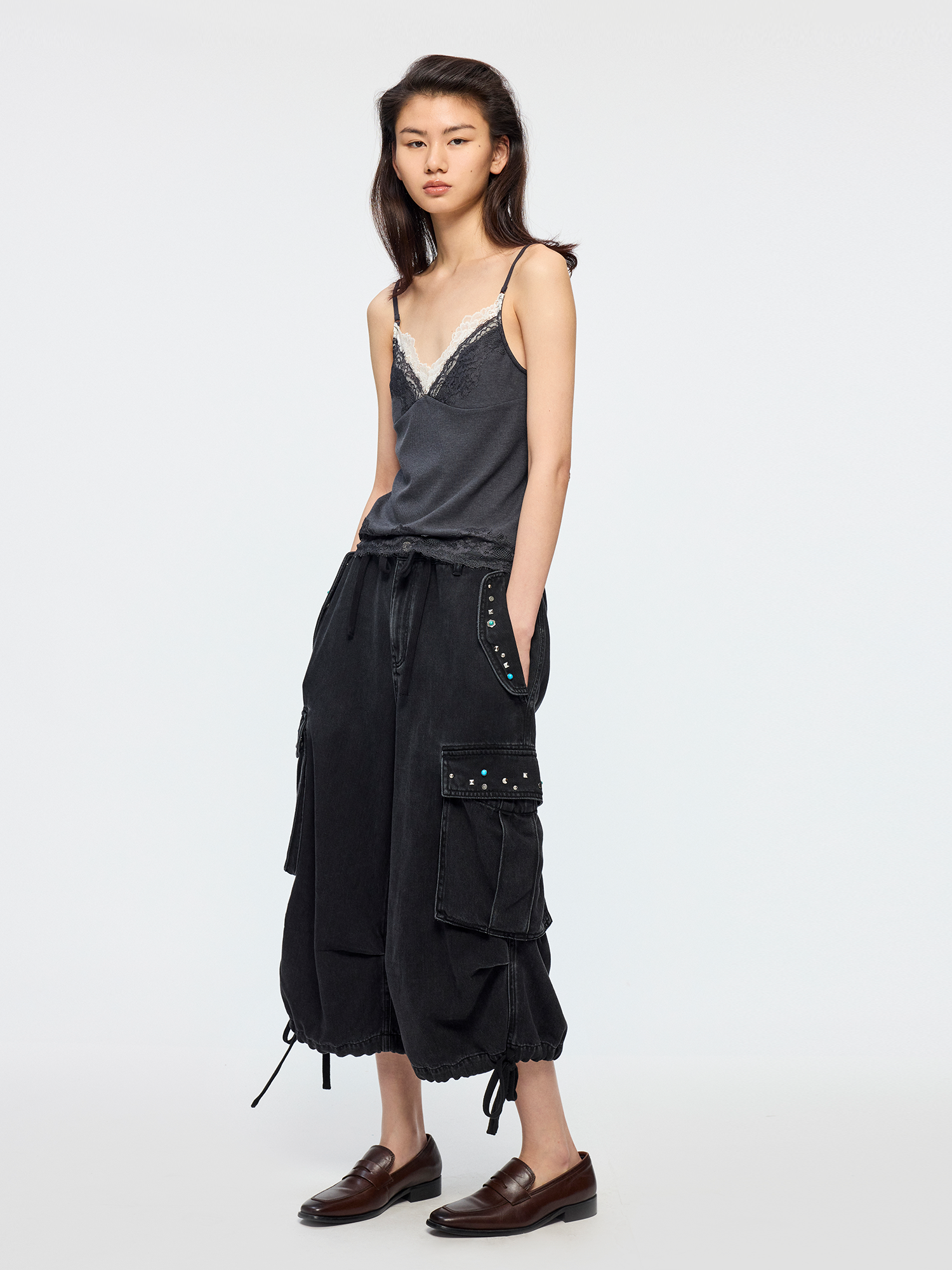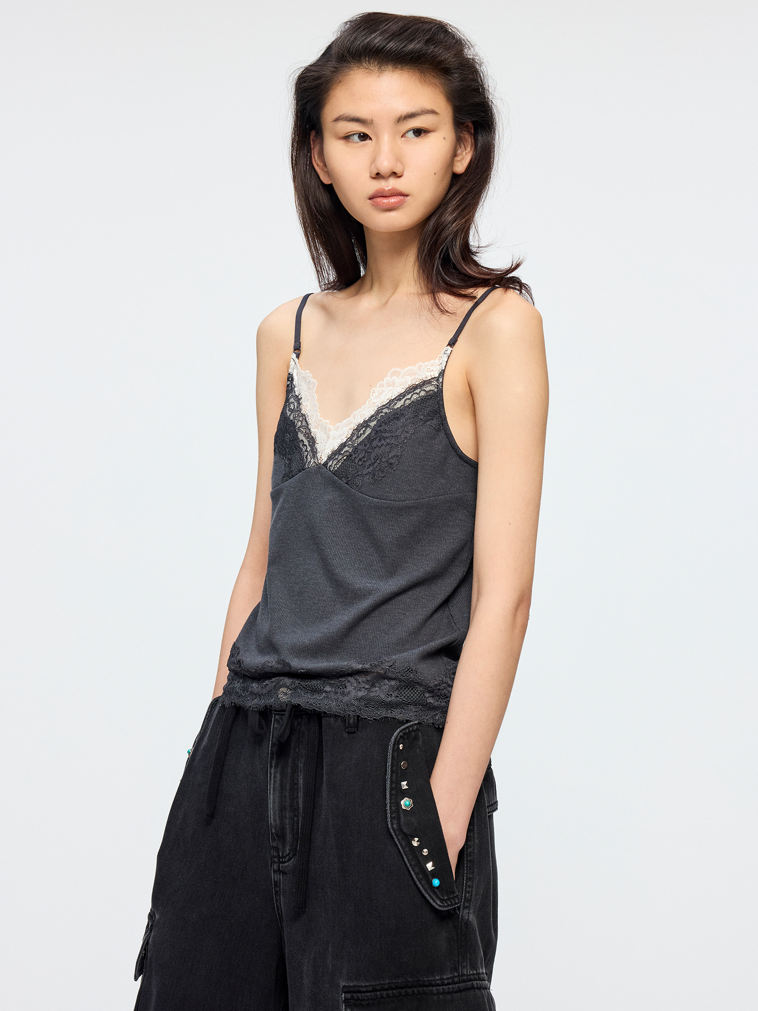 Mock-layer camisole design creates a casual layered look. Irregular hand-guided lace embroidery adds romantic spontaneity.