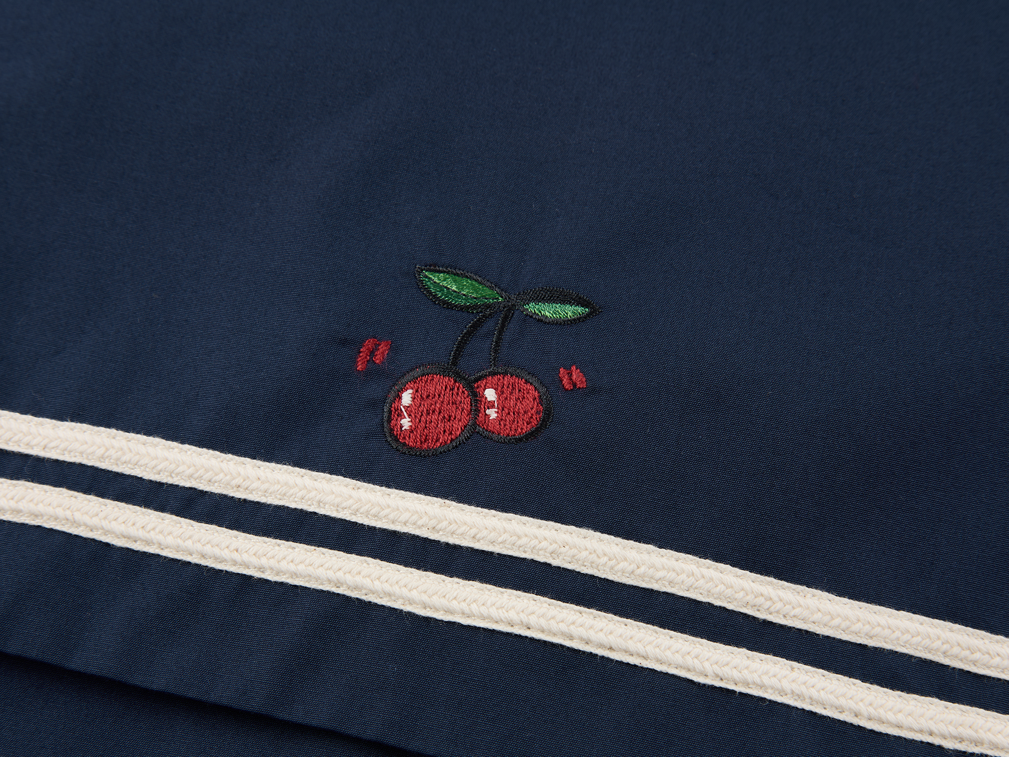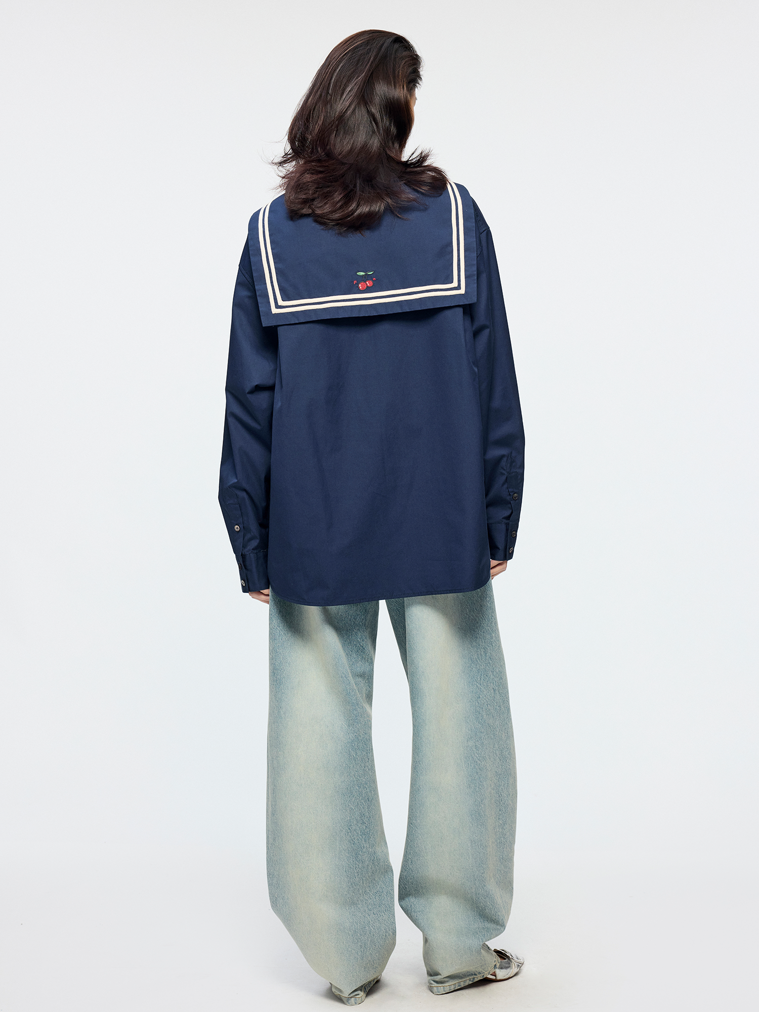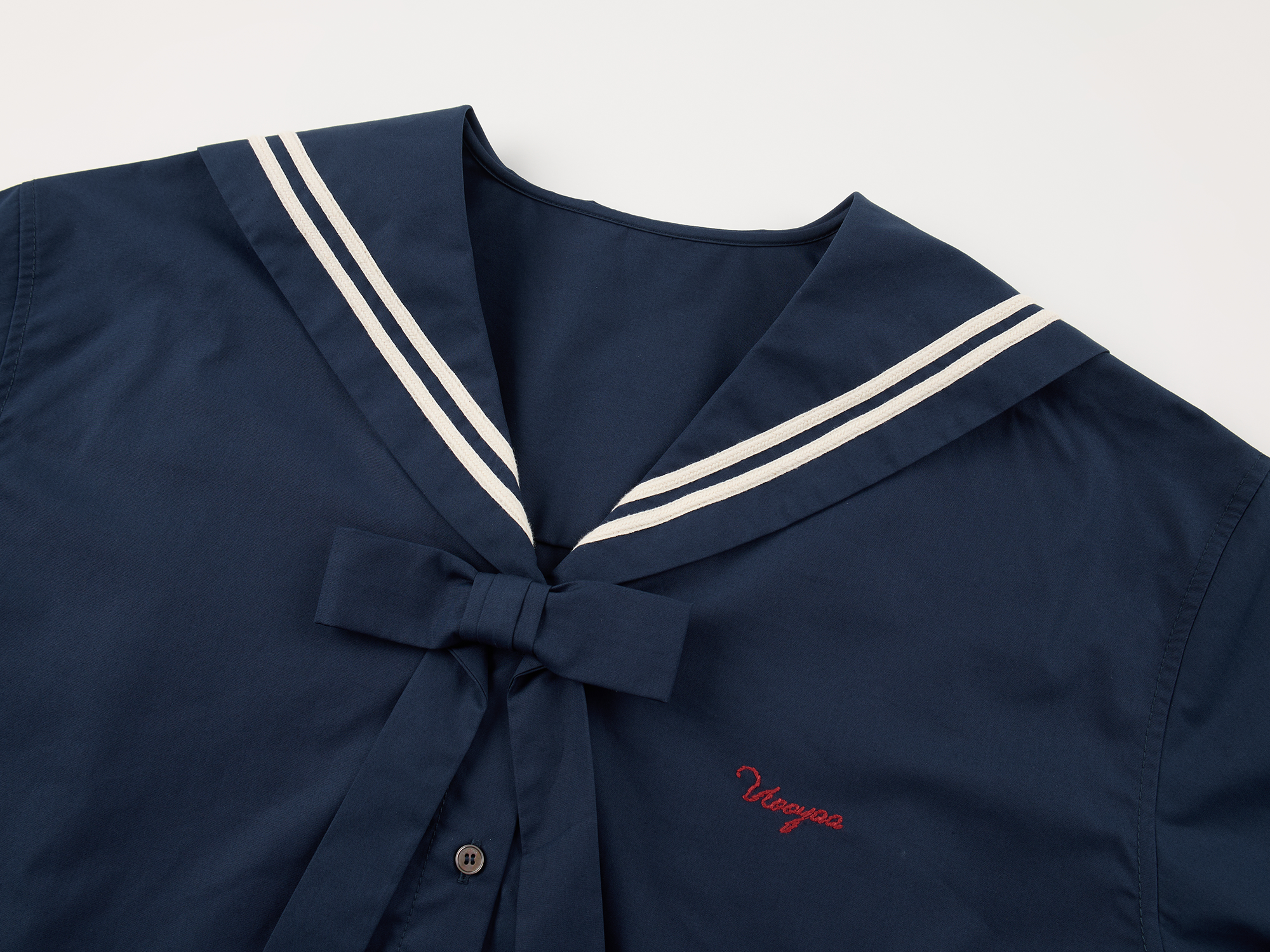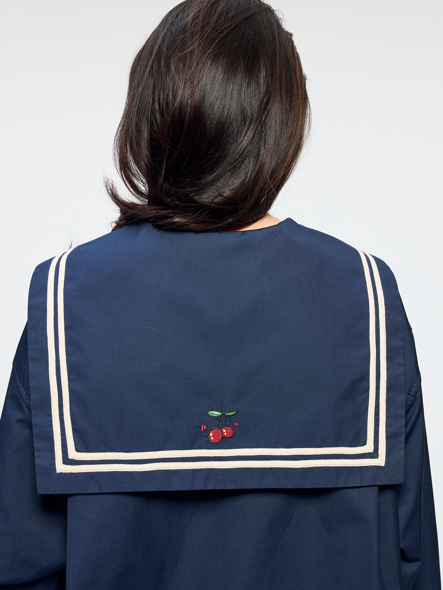 Classic sailor collar element featuring embroidered Dynamic Cherry on the back. Detachable 3D bow adds youthful playfulness.