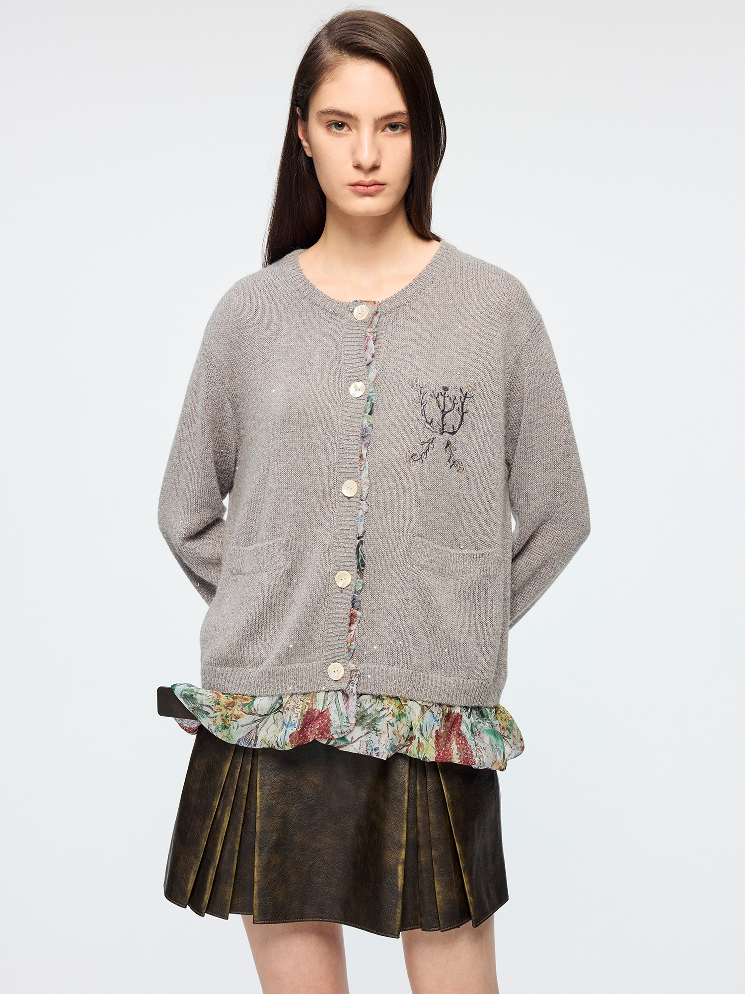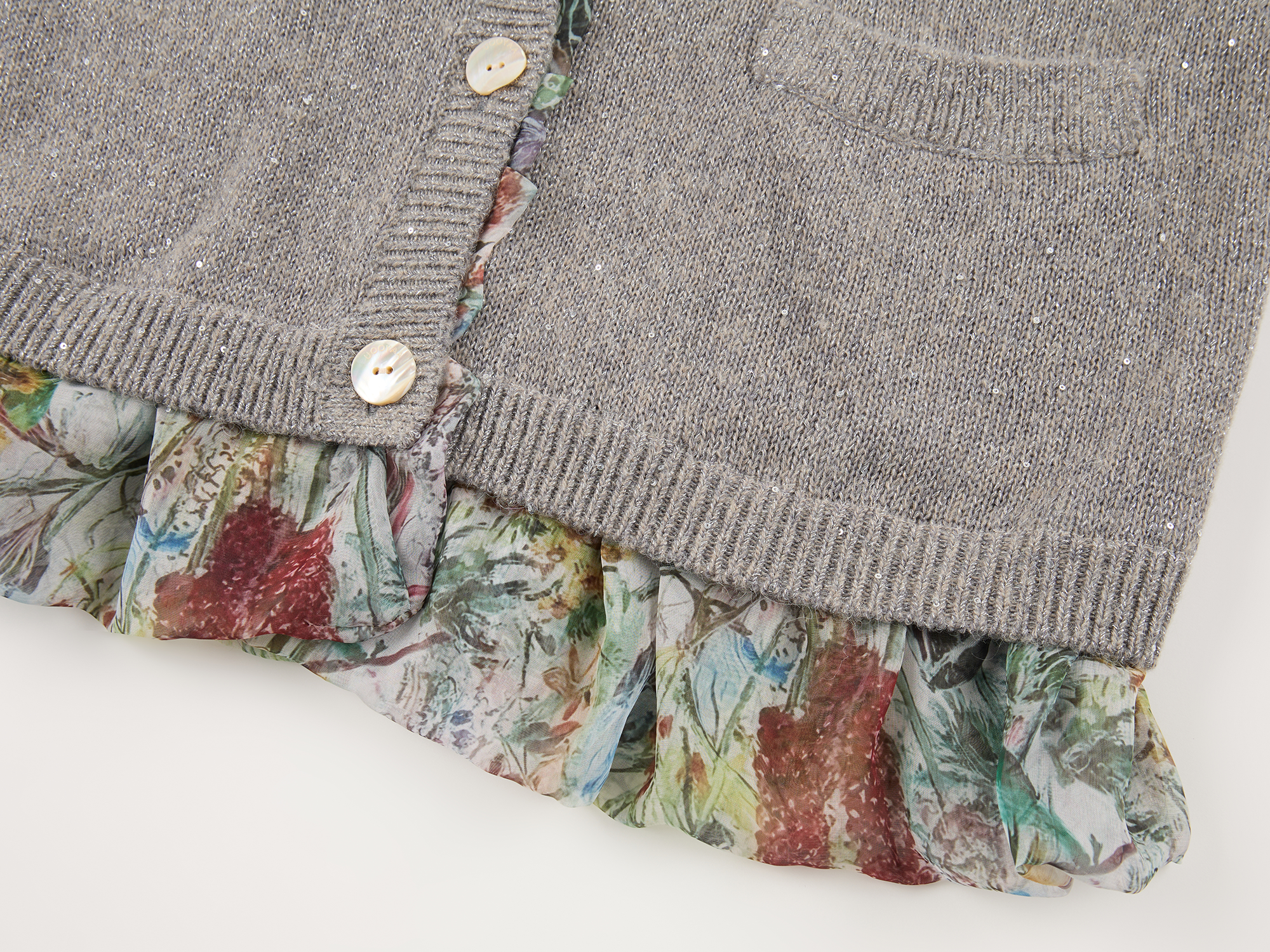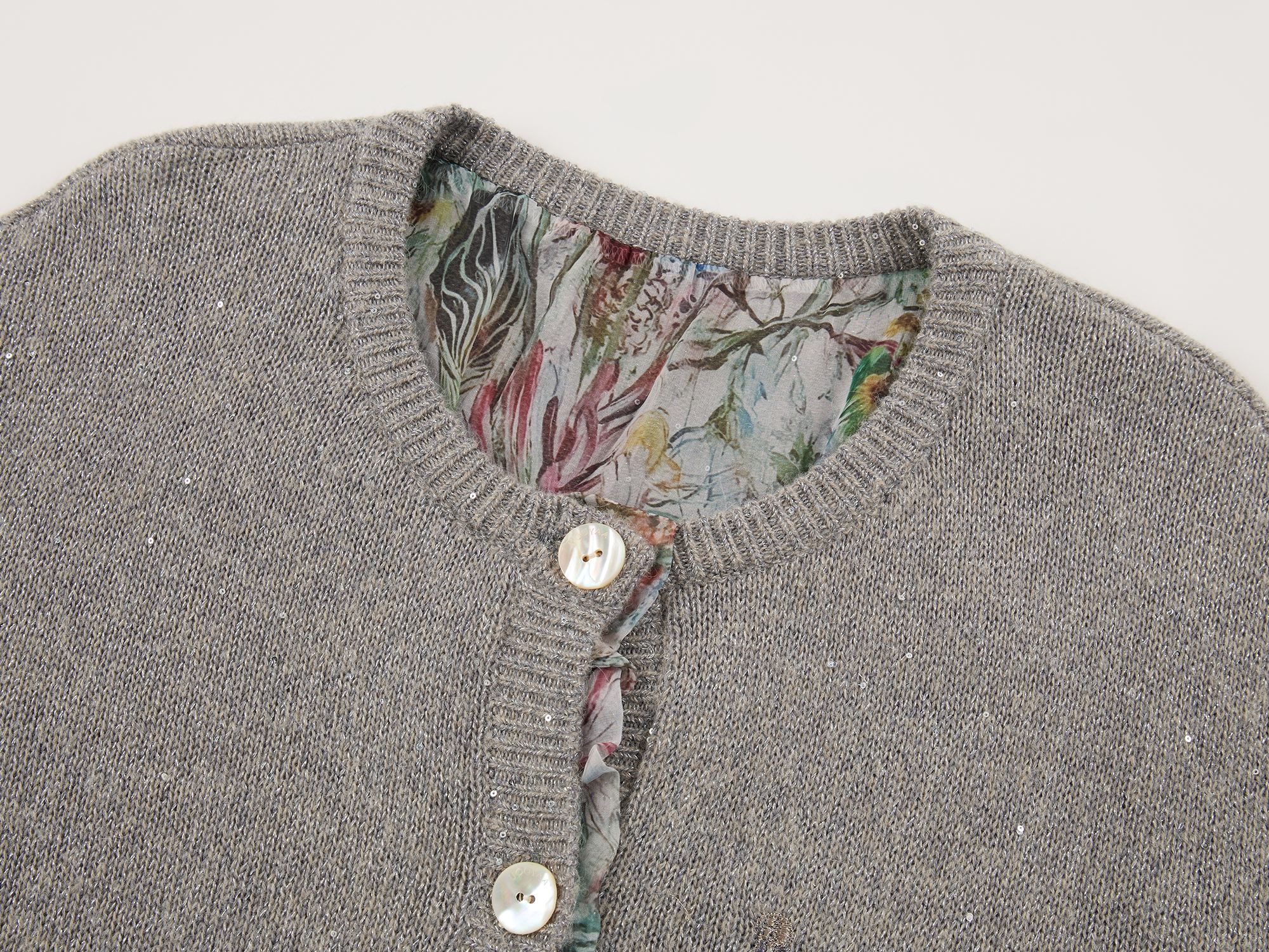 Enlarged floral print lining is designed to be exposed. Sequin yarn accents elevate luxury; fit is joyful and casual.