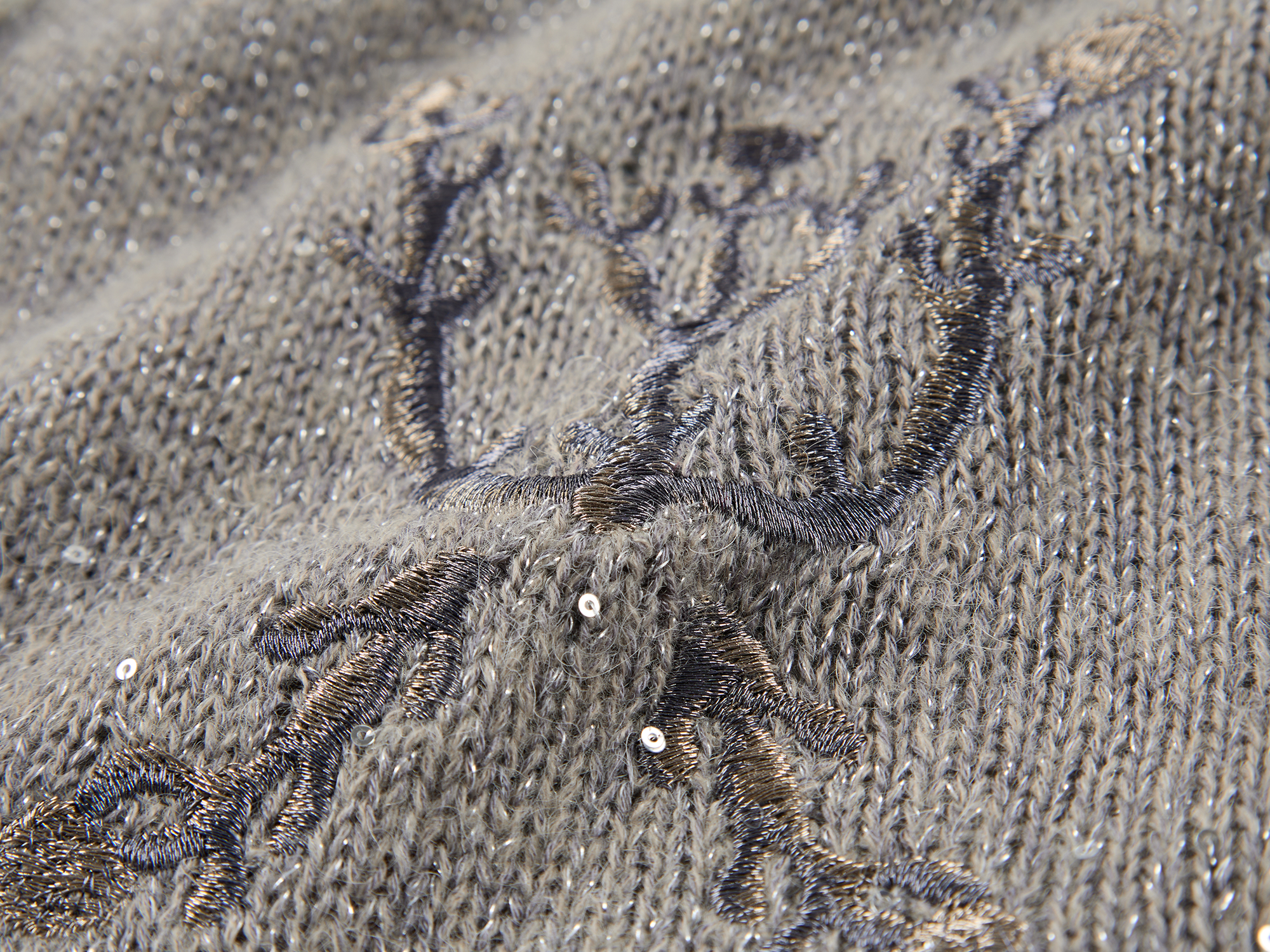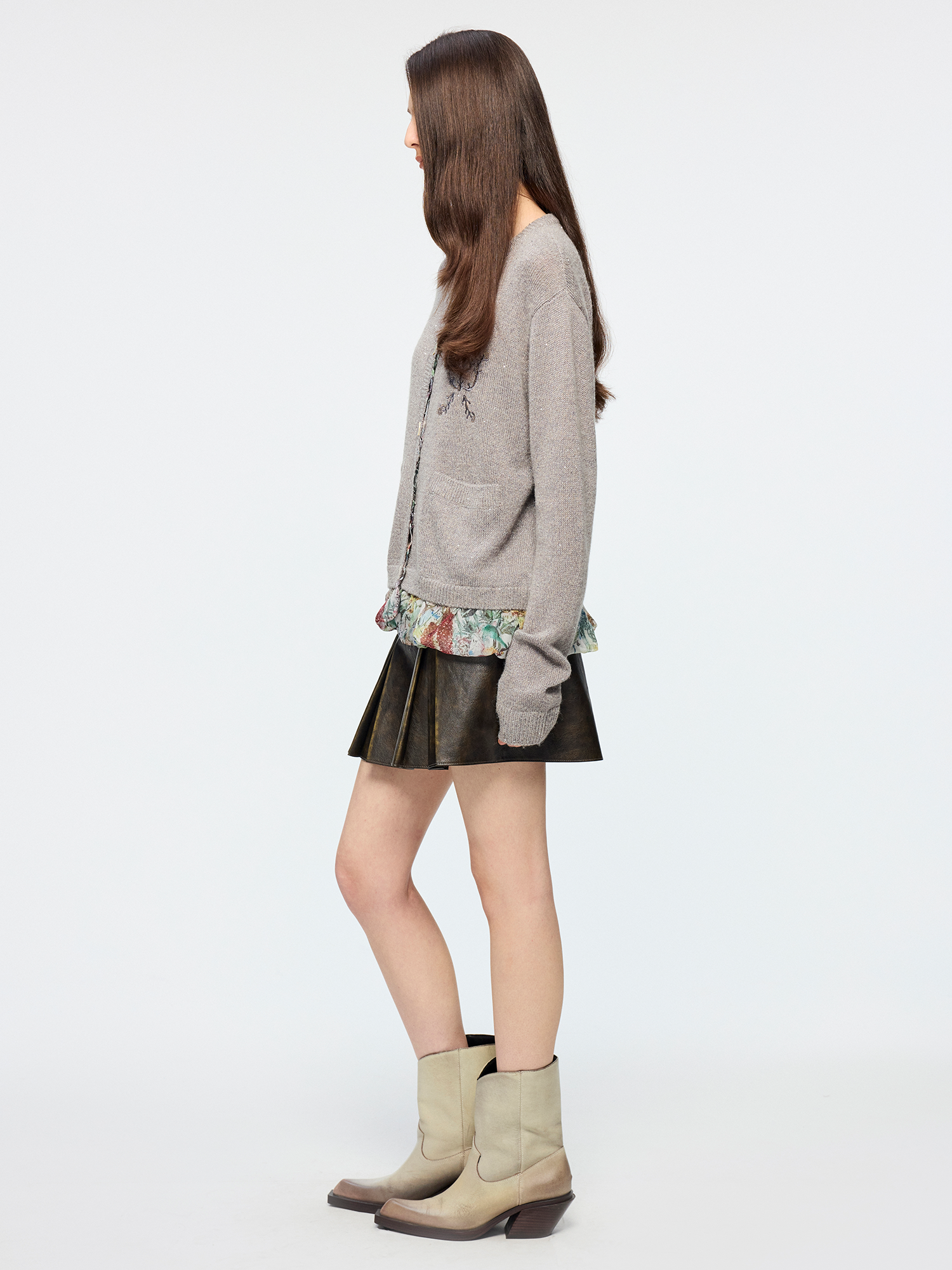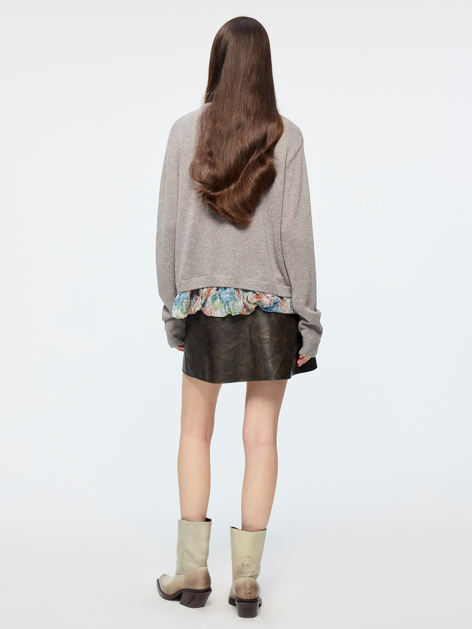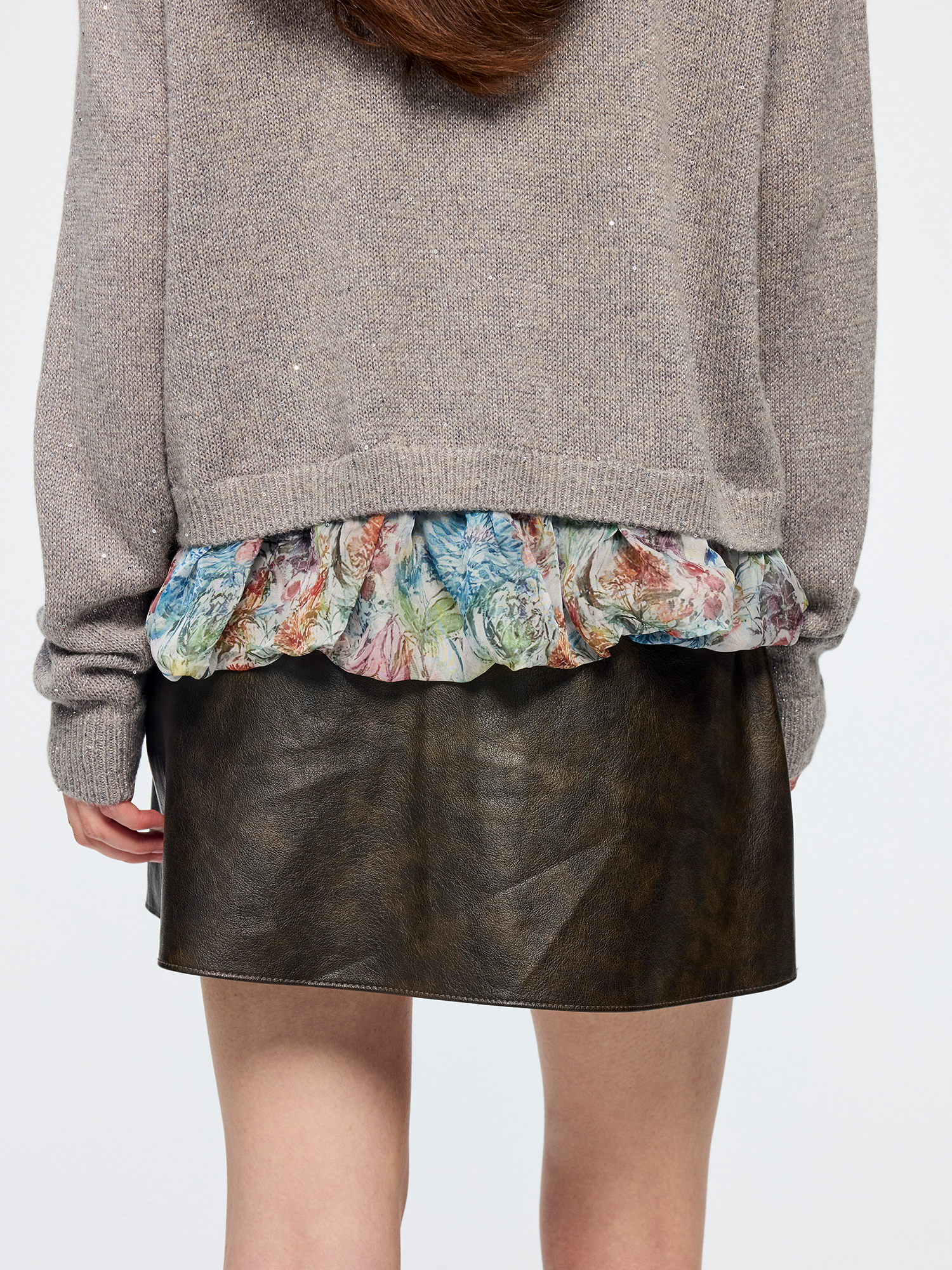 Enlarged floral print lining is designed to be exposed. Sequin yarn accents elevate luxury; fit is joyful and casual.