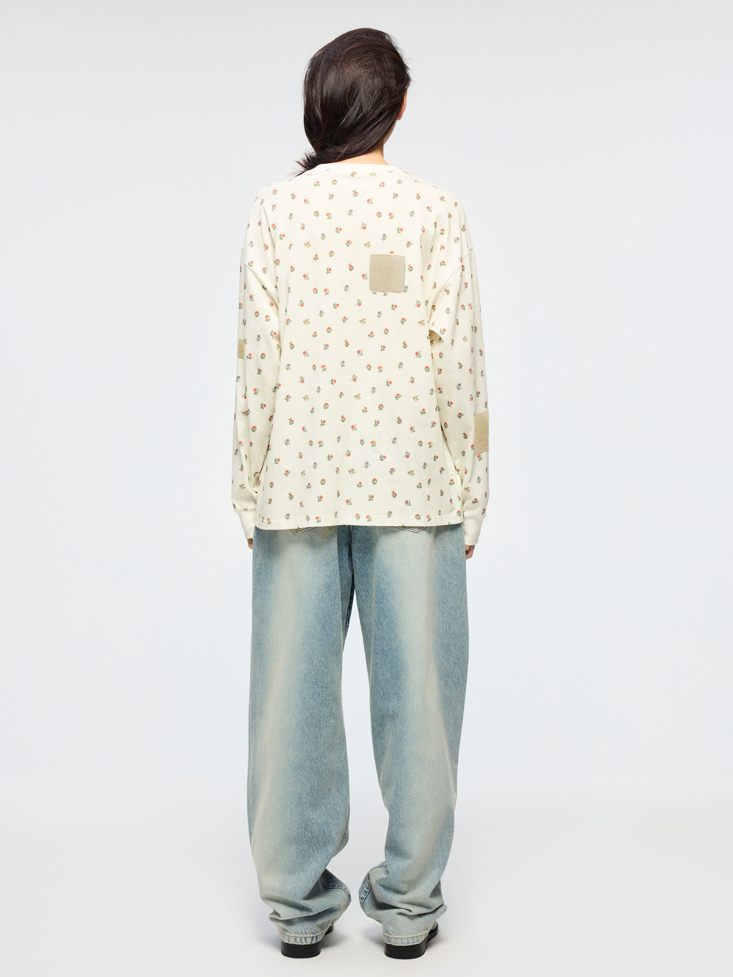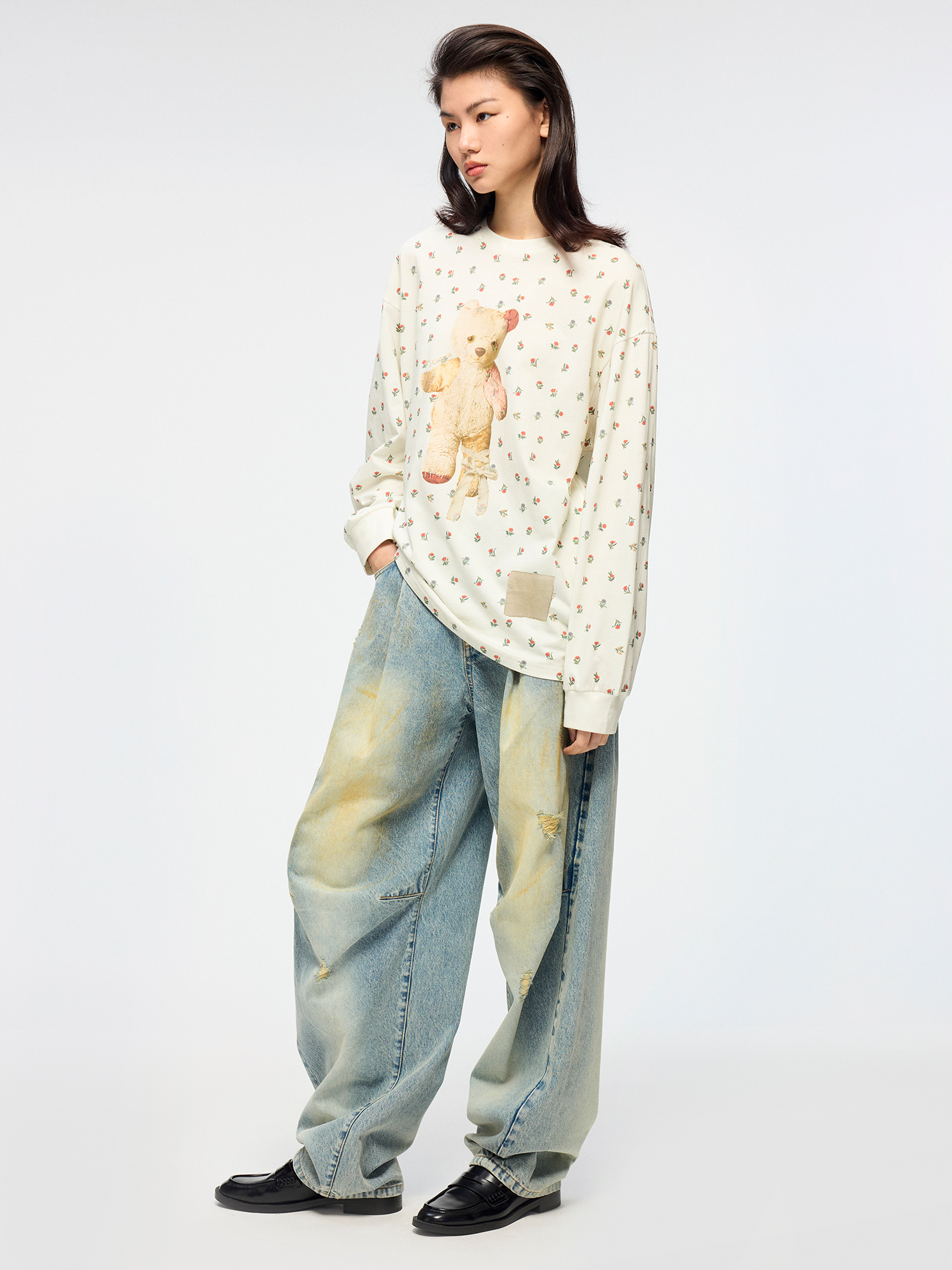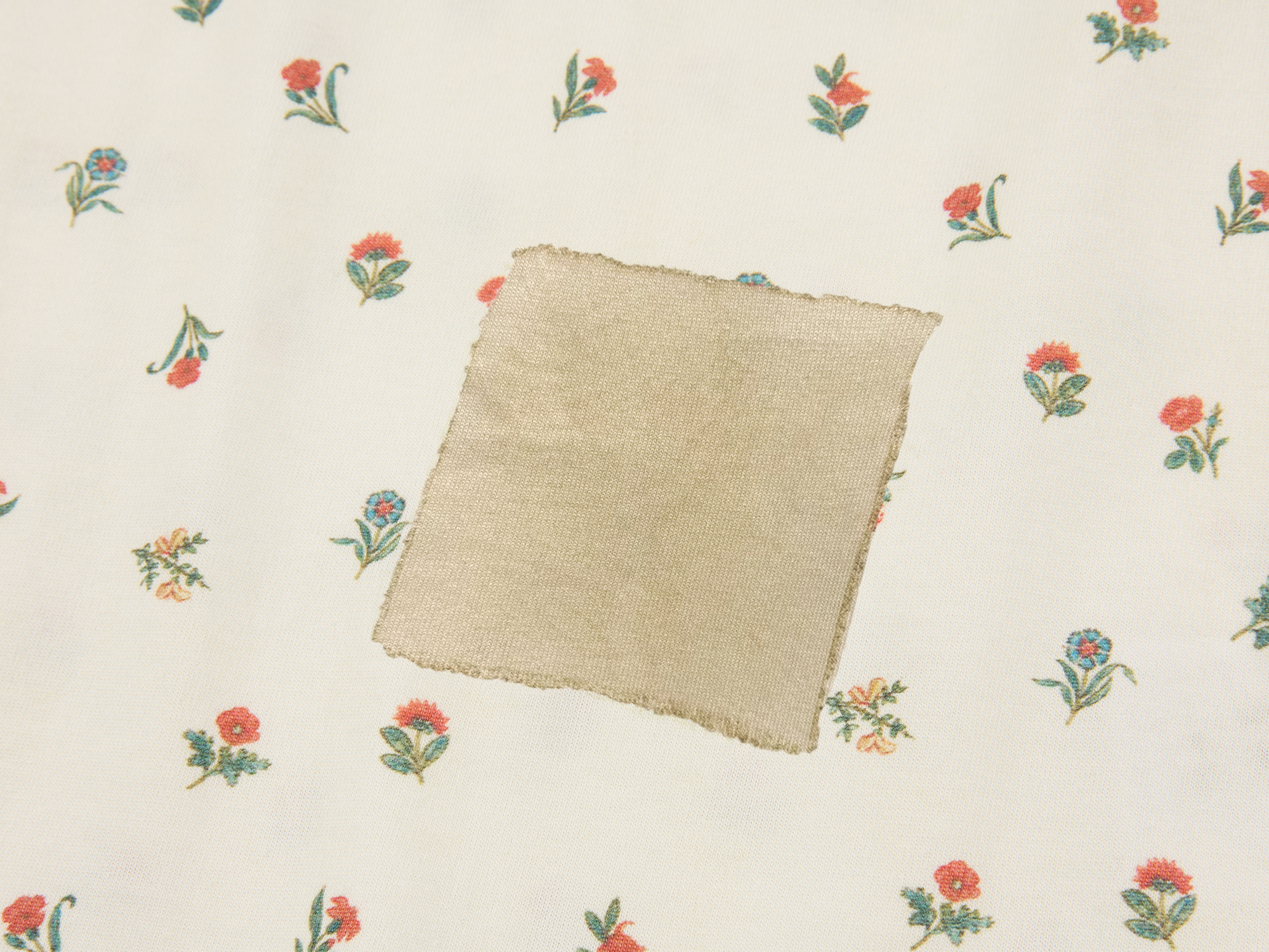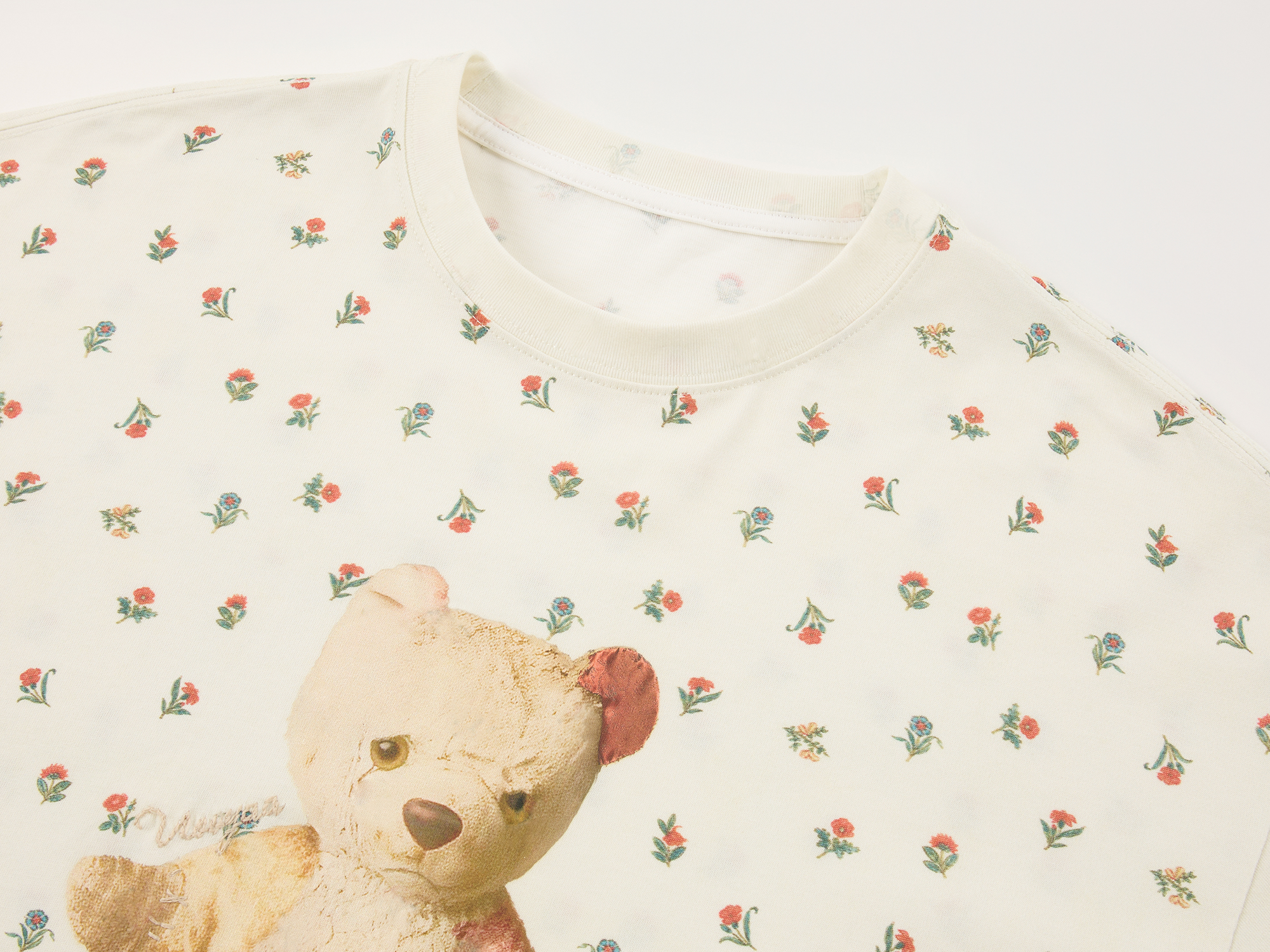 Old toy evoking childhood memories created with distressed flocking and mending stitches. Allover floral print conveys warm nostalgia.