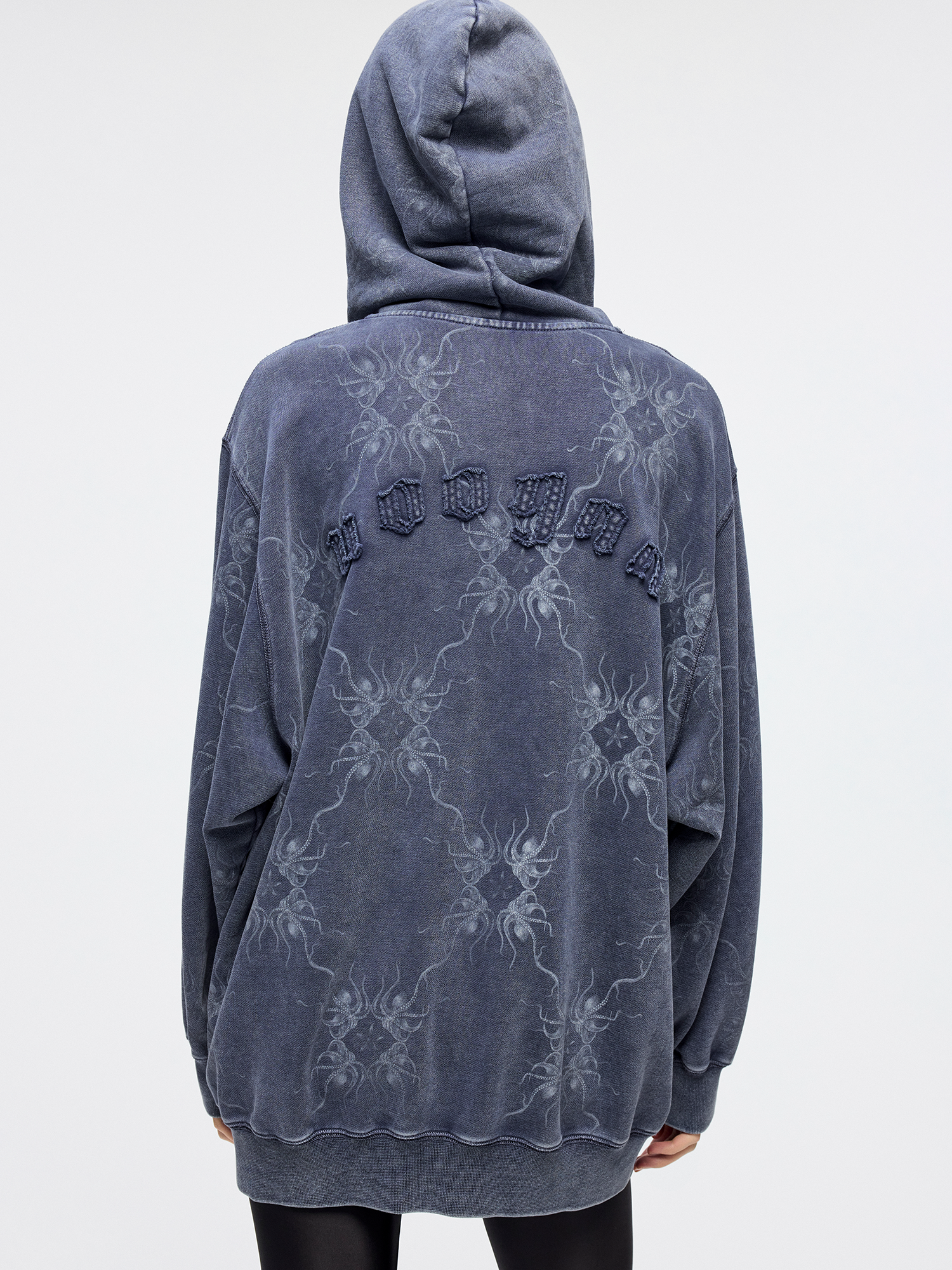 Fantasy undersea octopus blends with vintage patterns. Back features Gothic logo raw-edge appliqu¨¦¡ªwhimsical and casual.