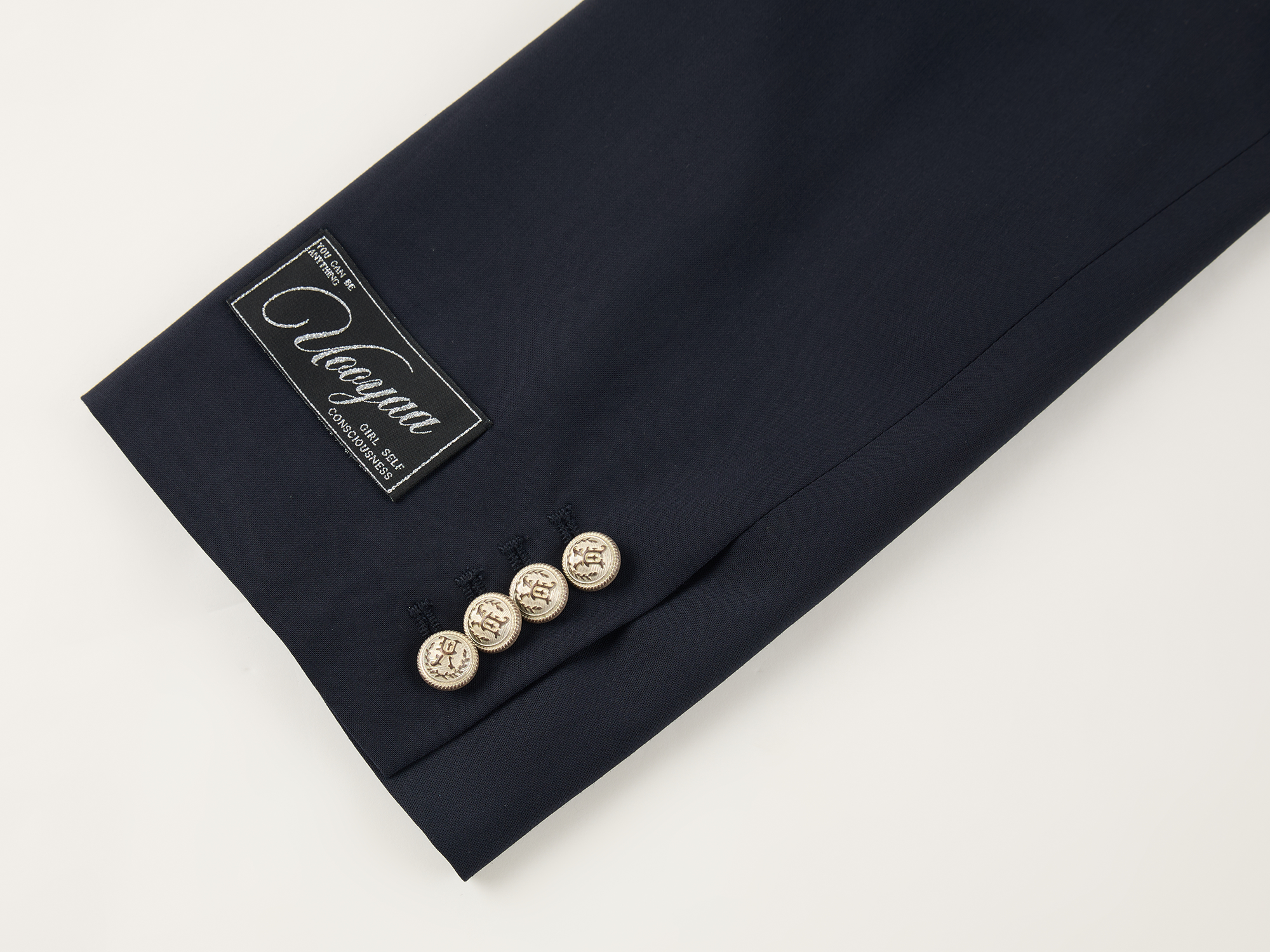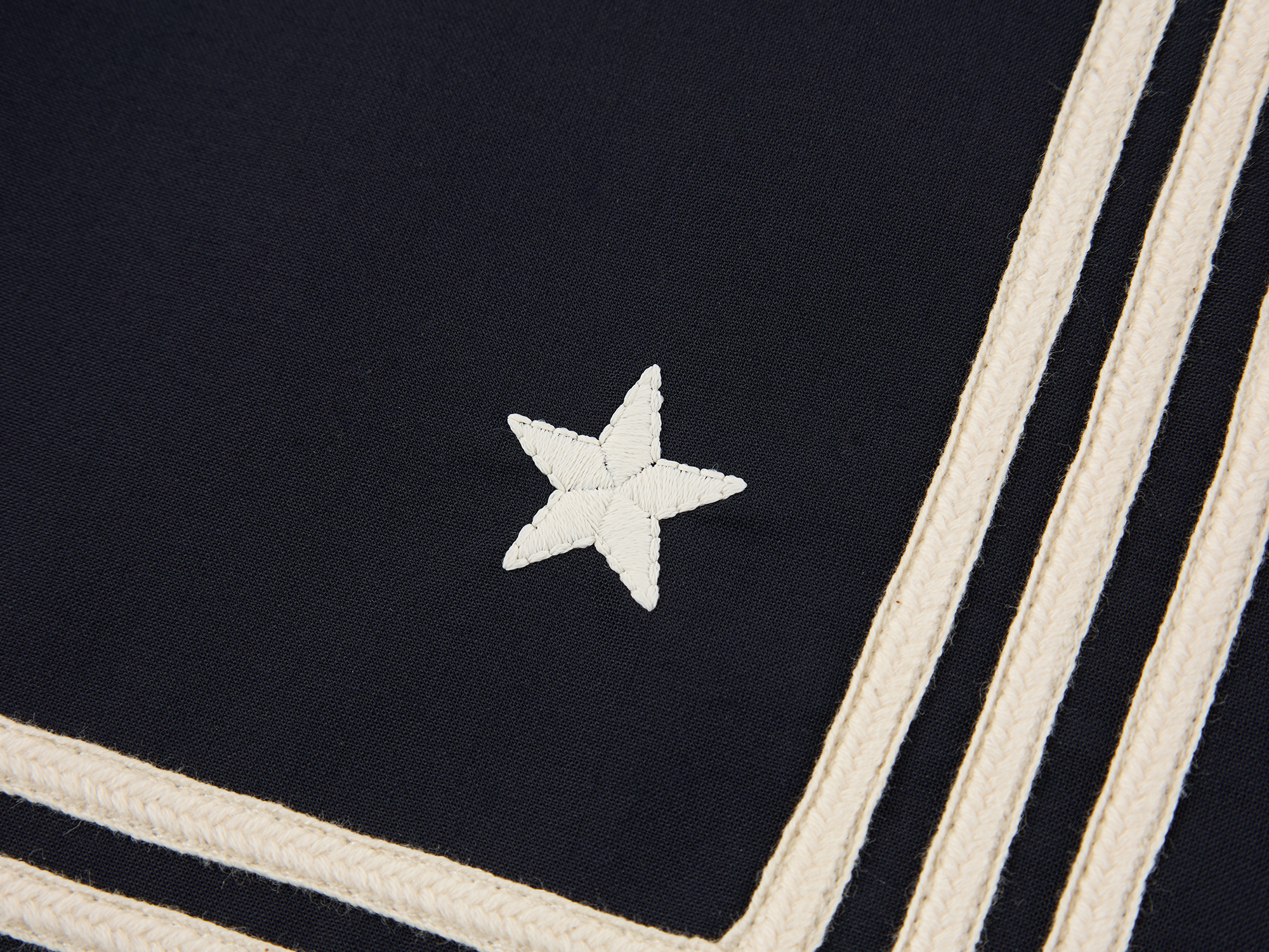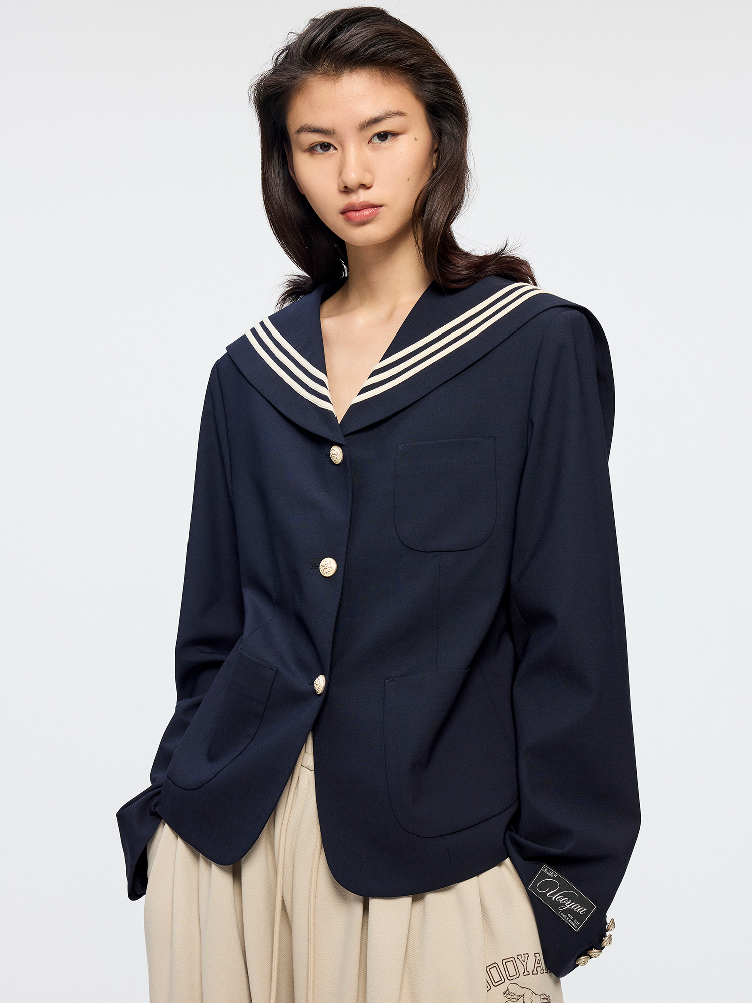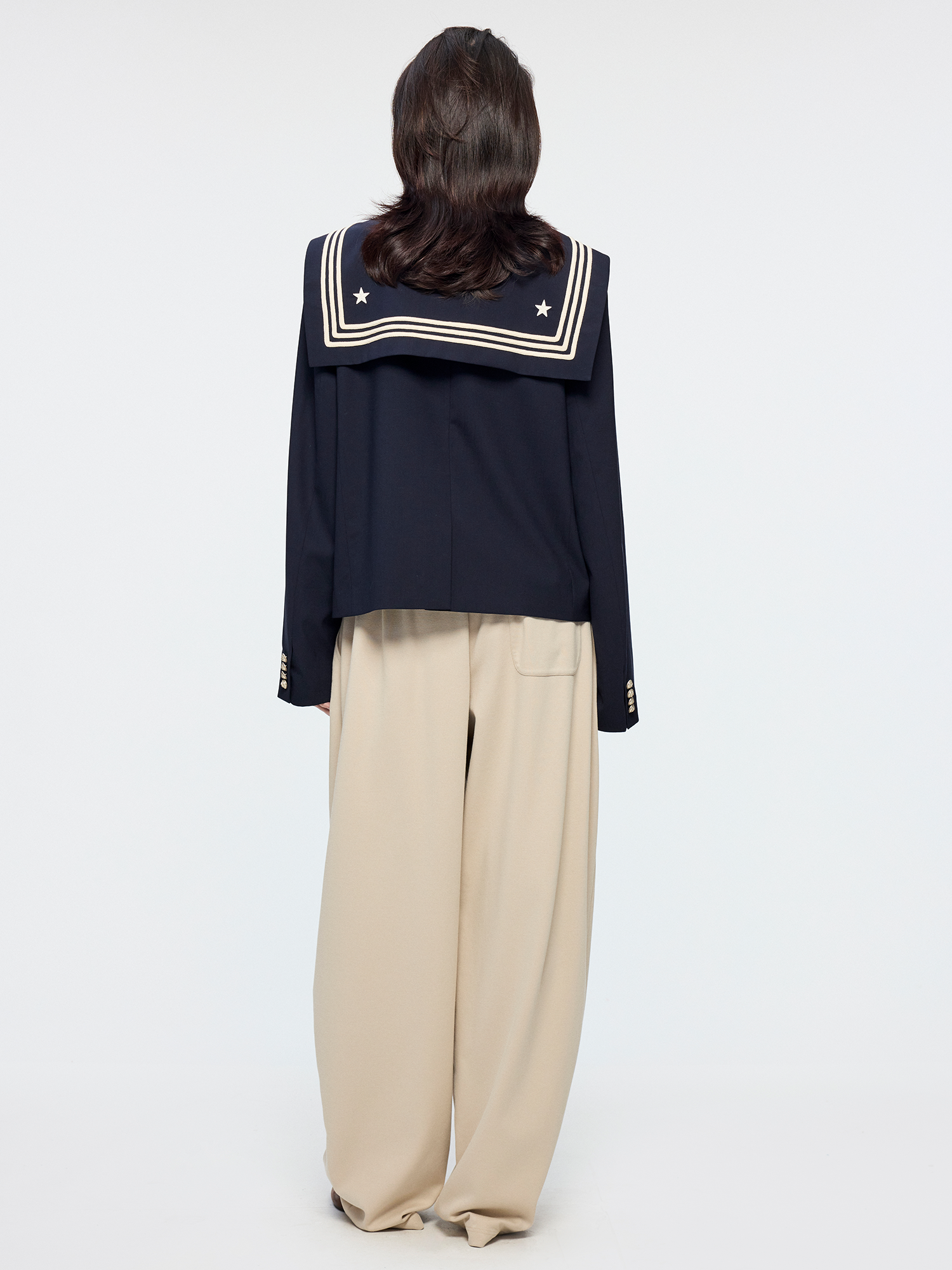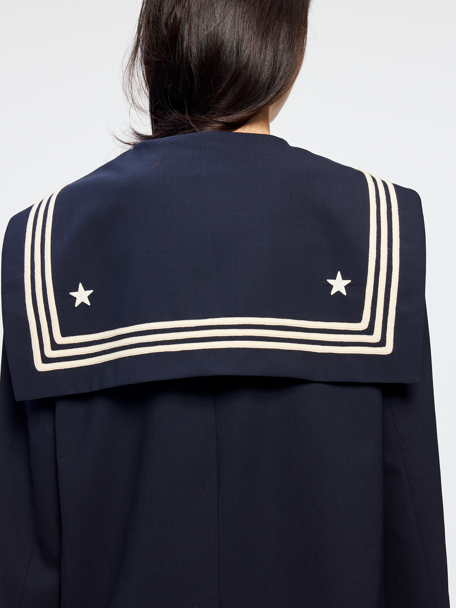 Classic sailor collar blazer features refined tape details and star embroidered badges. Cropped fit highlights youthful energy.