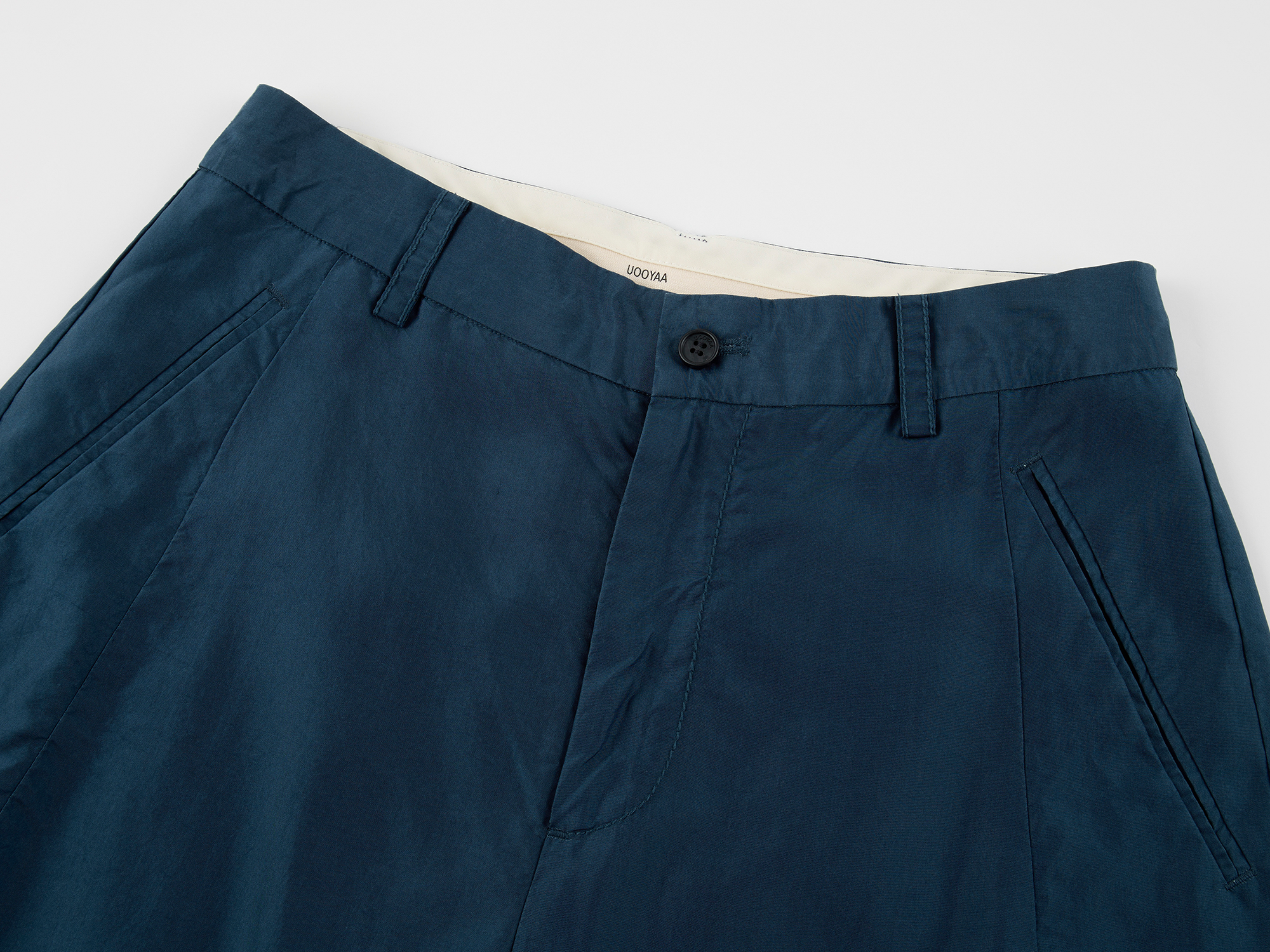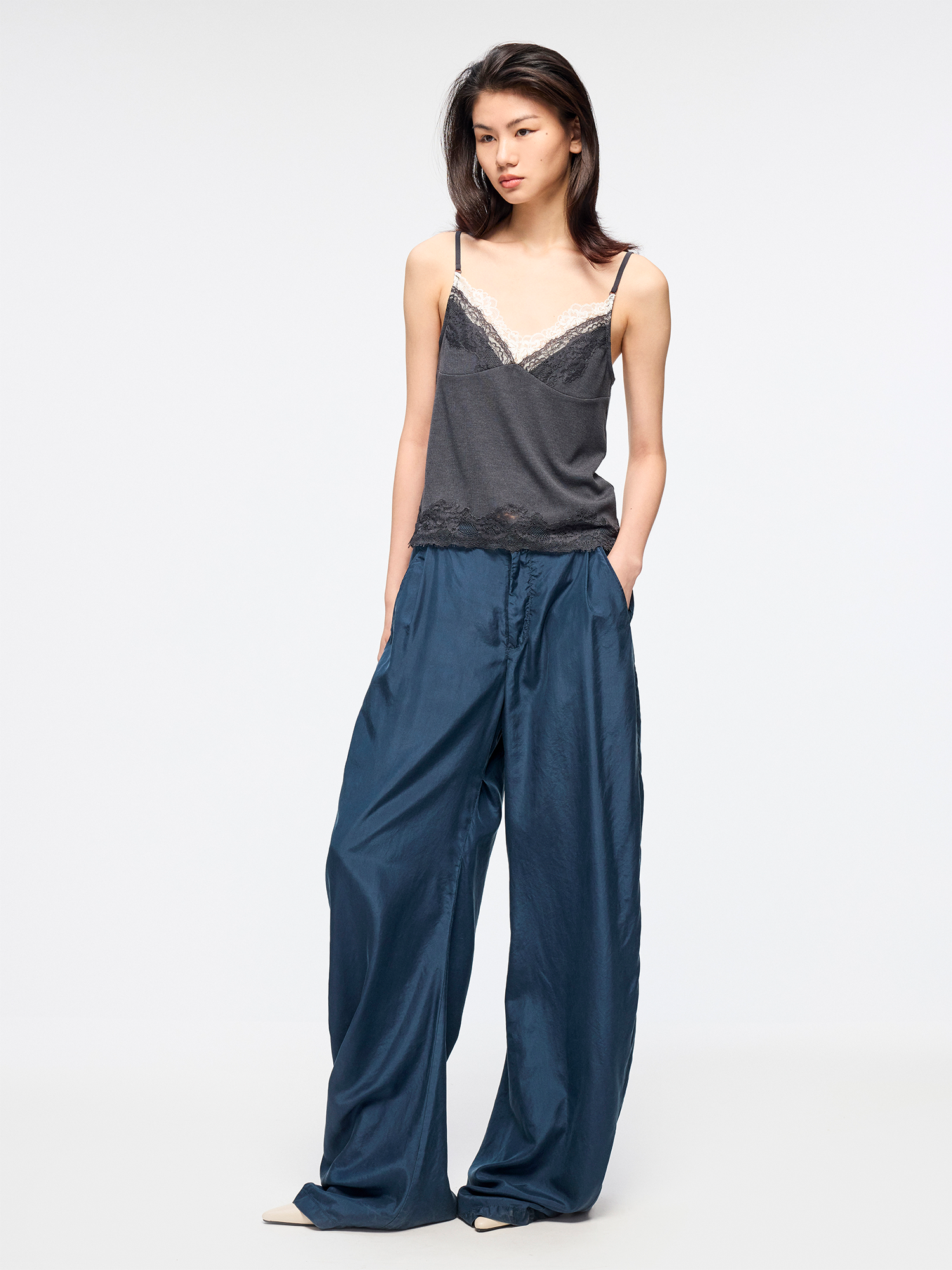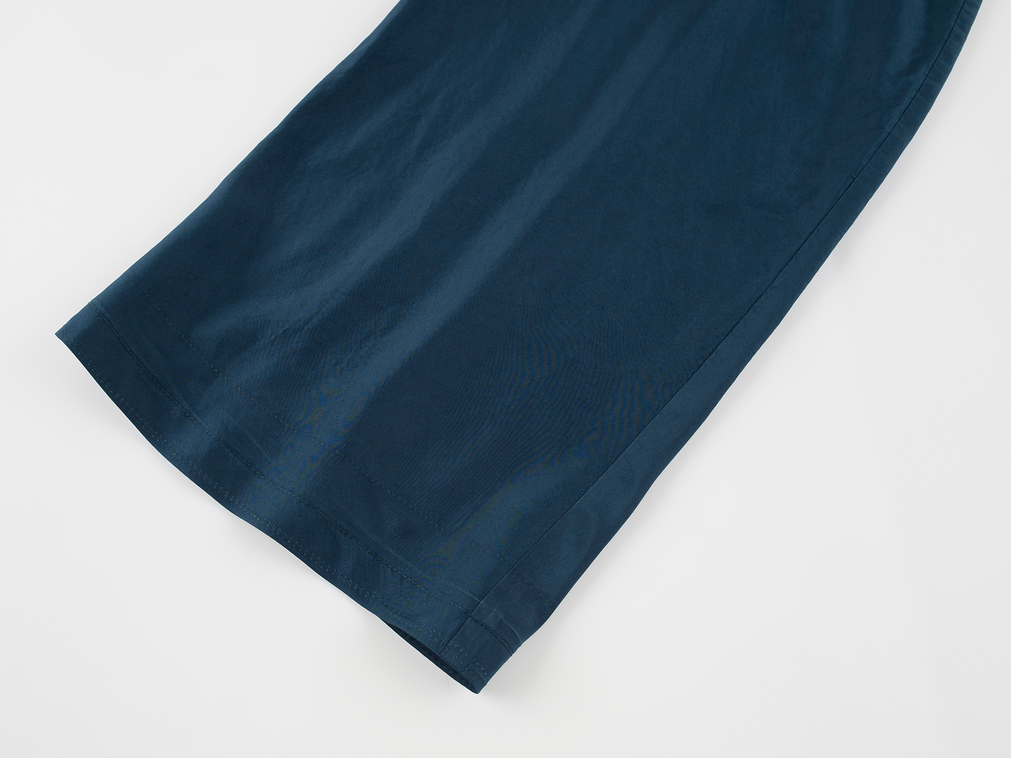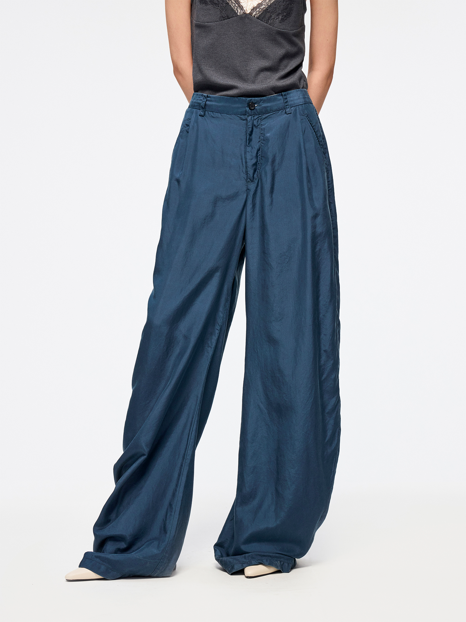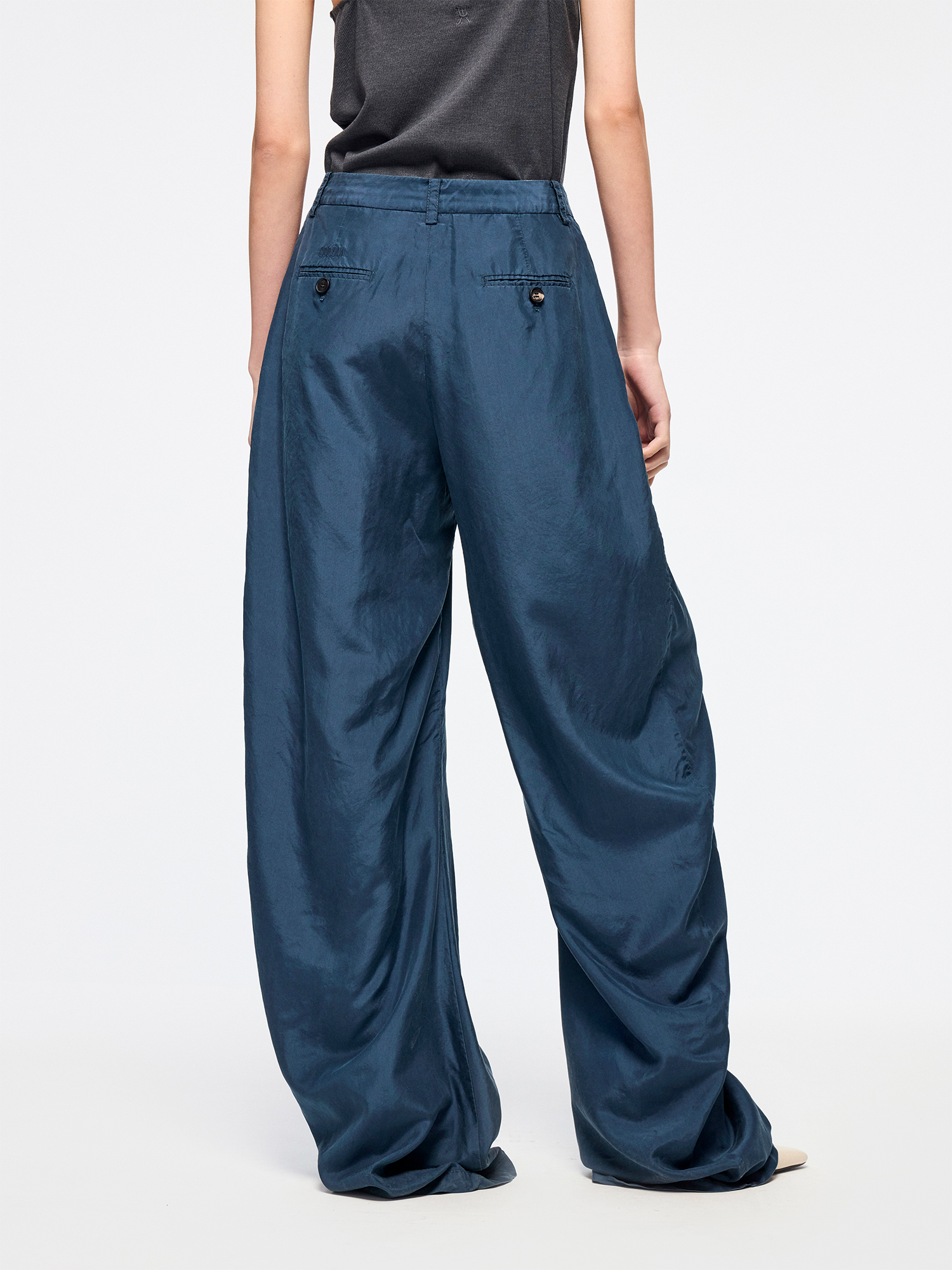 Silk taffeta curved-leg trousers offer fine texture and comfort. Soft luster adds a luxurious atmosphere for instant relaxation.