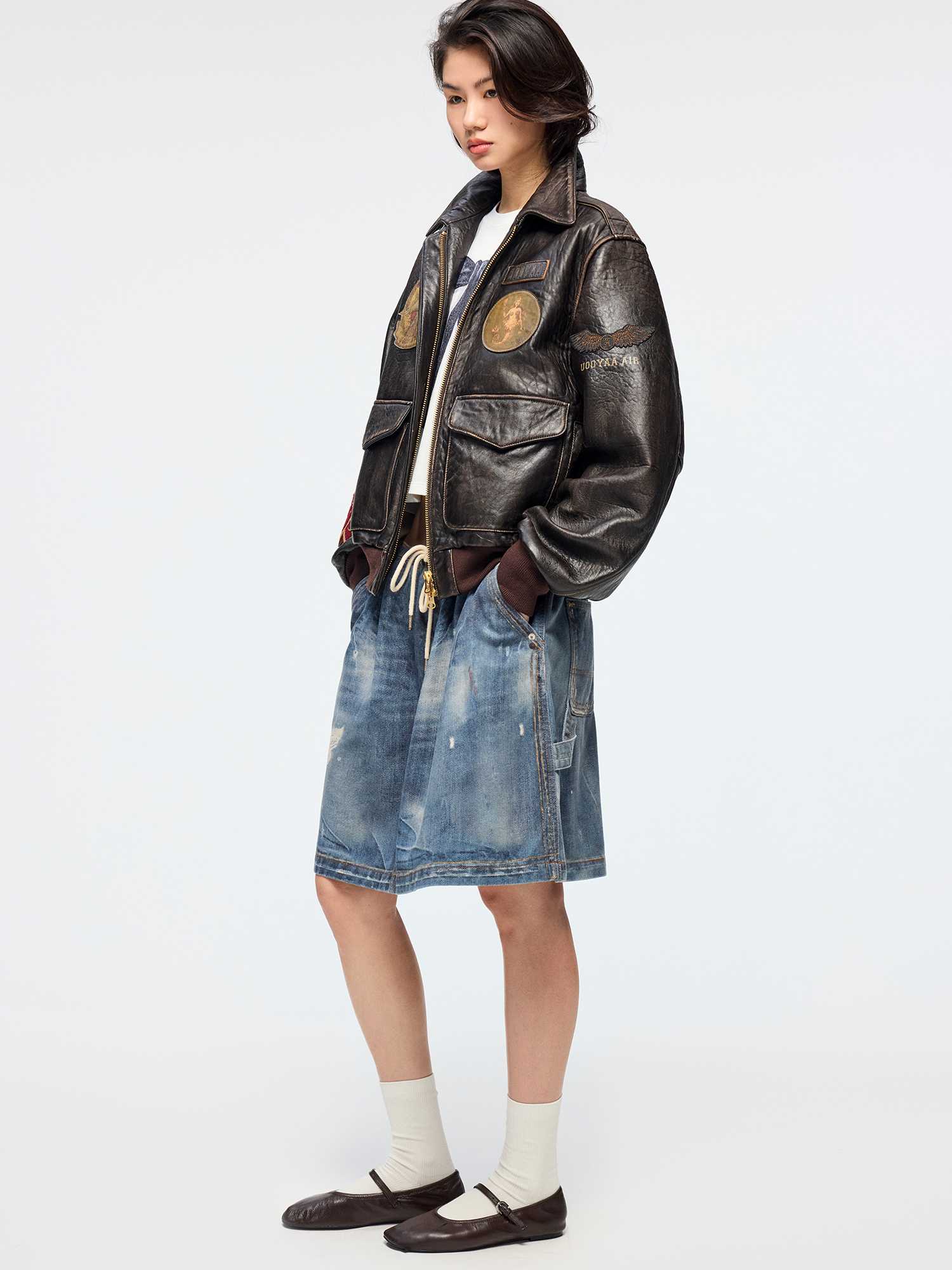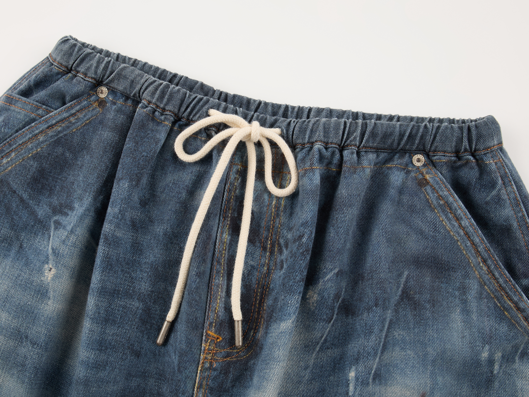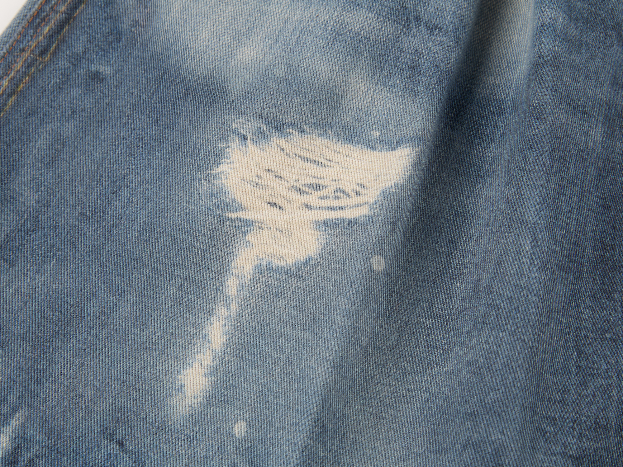 Realistic denim details (wash, creases, stitching, leather patch) presented via trompe l'?il print¡ªsurreal and fun.