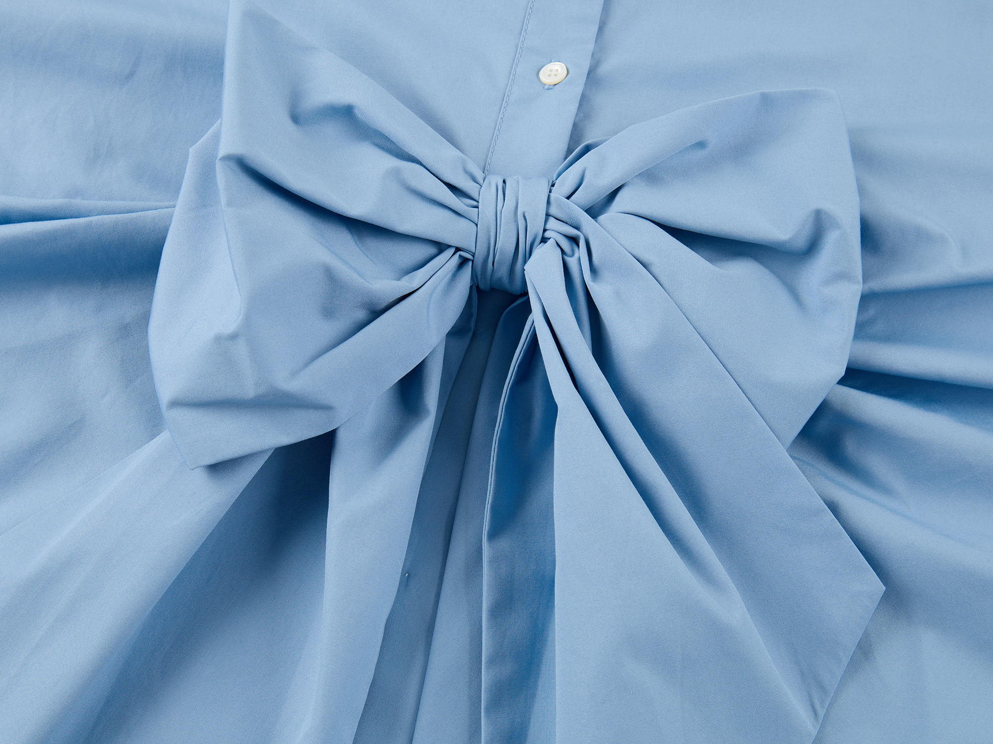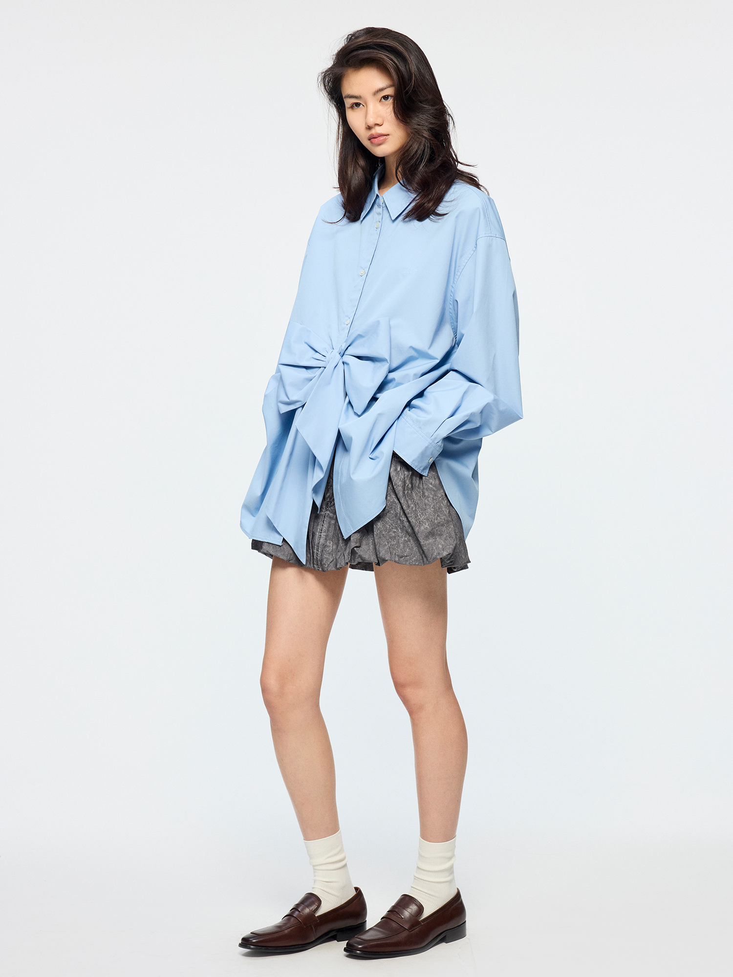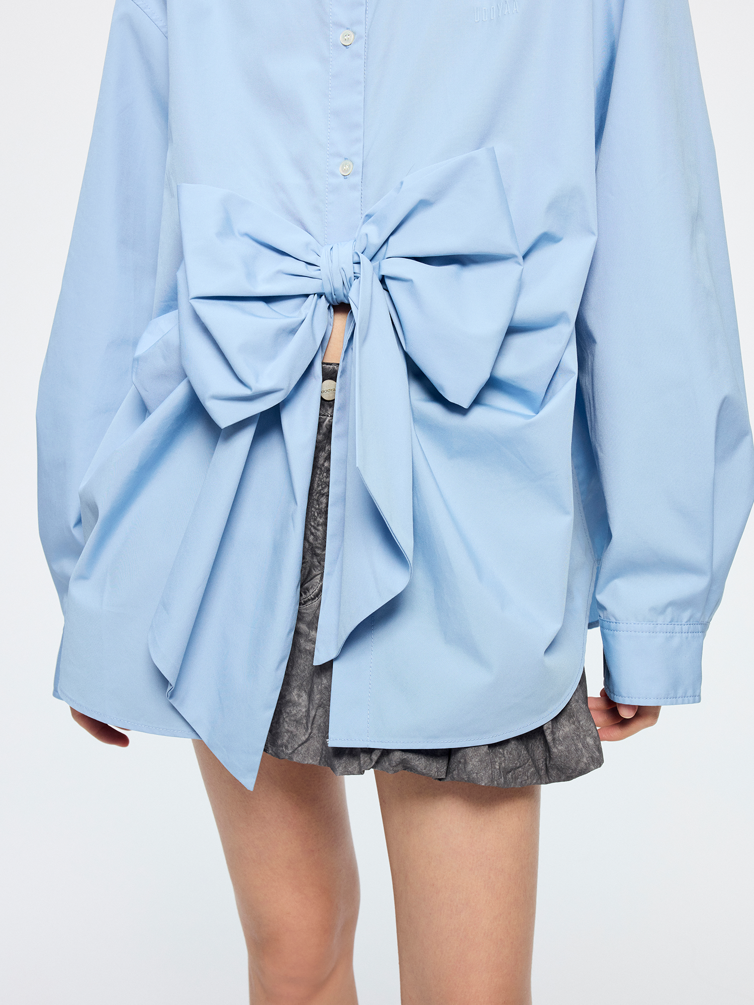 Reversible design reinterprets the classic men's shirt, accented with a bow tie structure at the hem?casual and romantic.