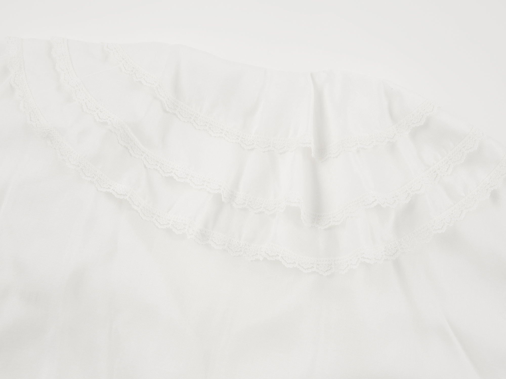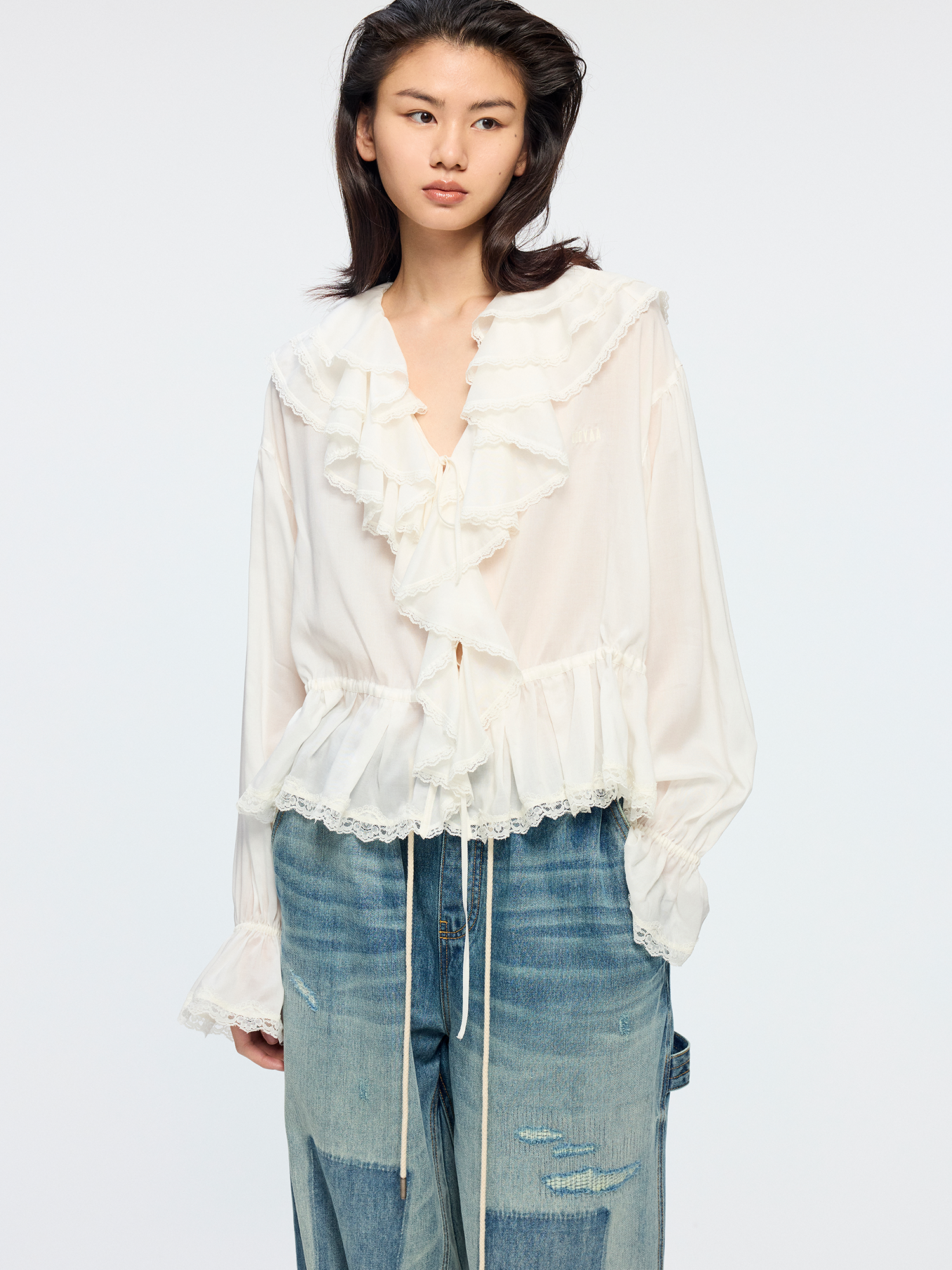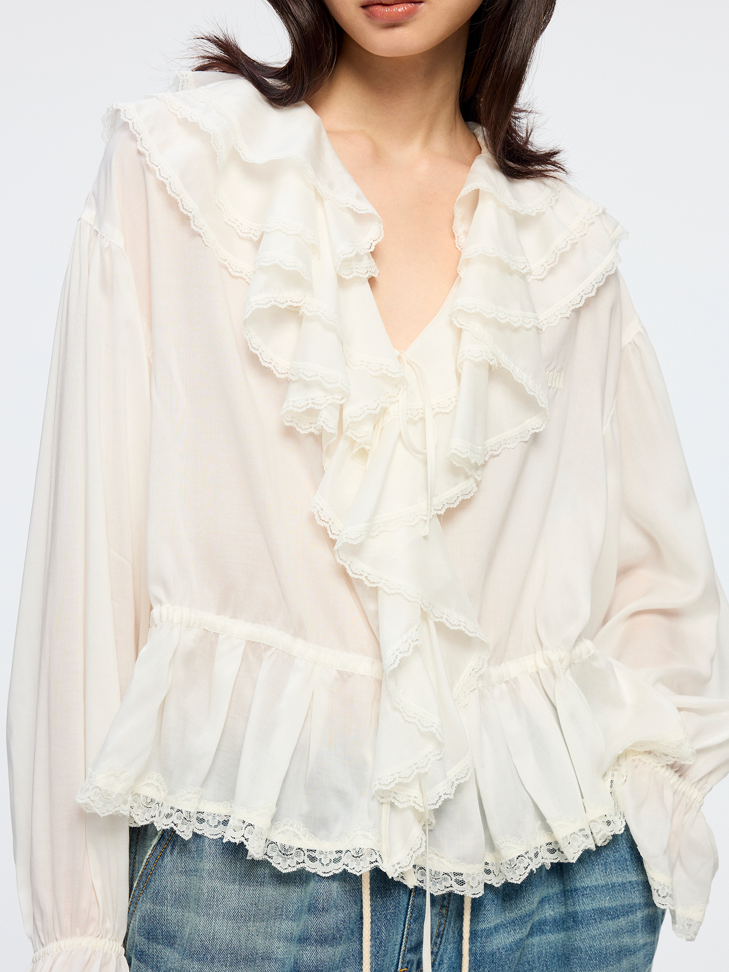 Relaxed fit shirt features layered, staggered ruffle collars?romantic and casual.