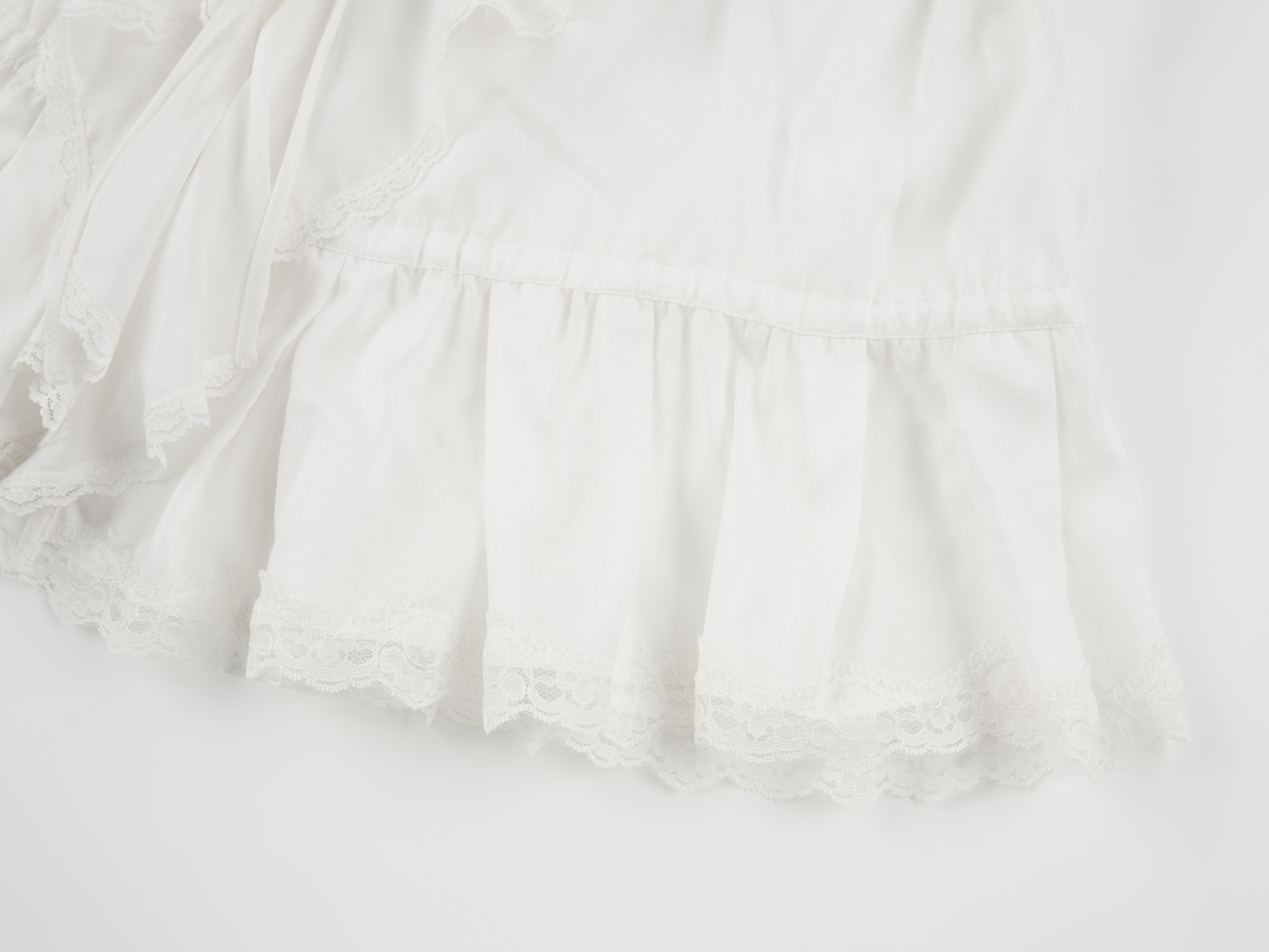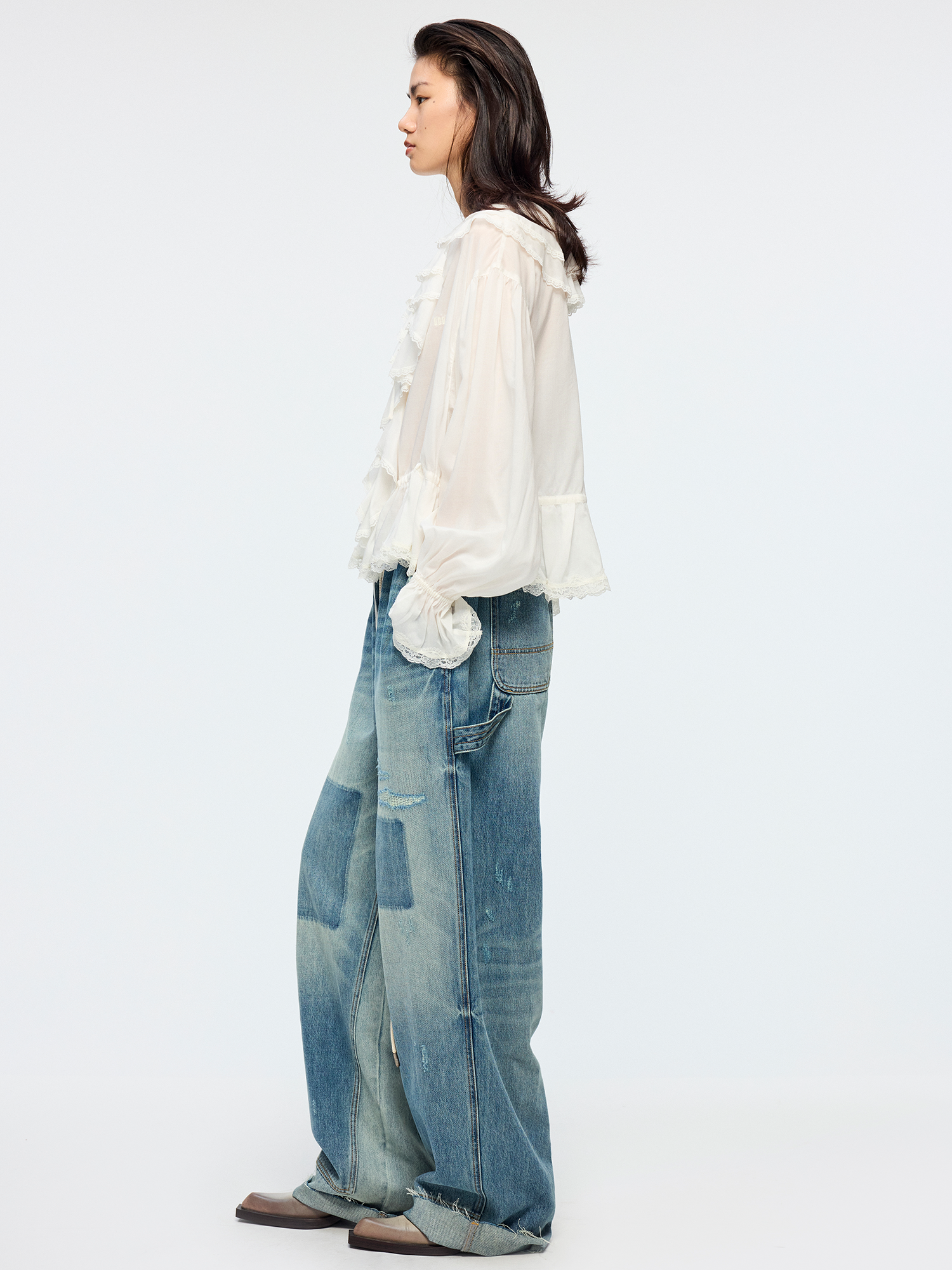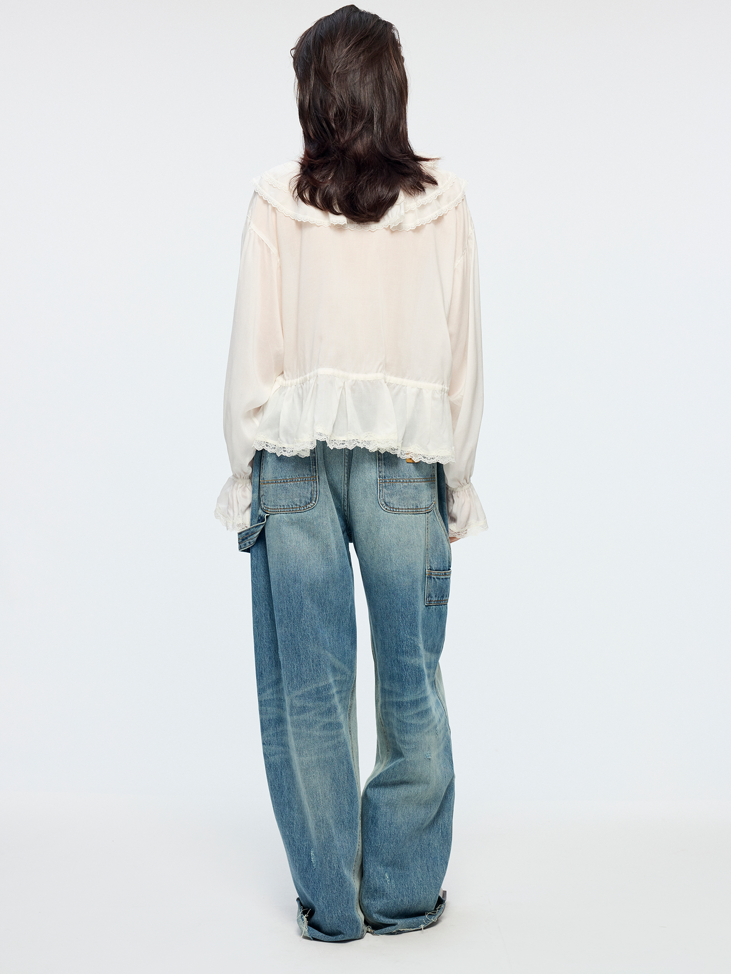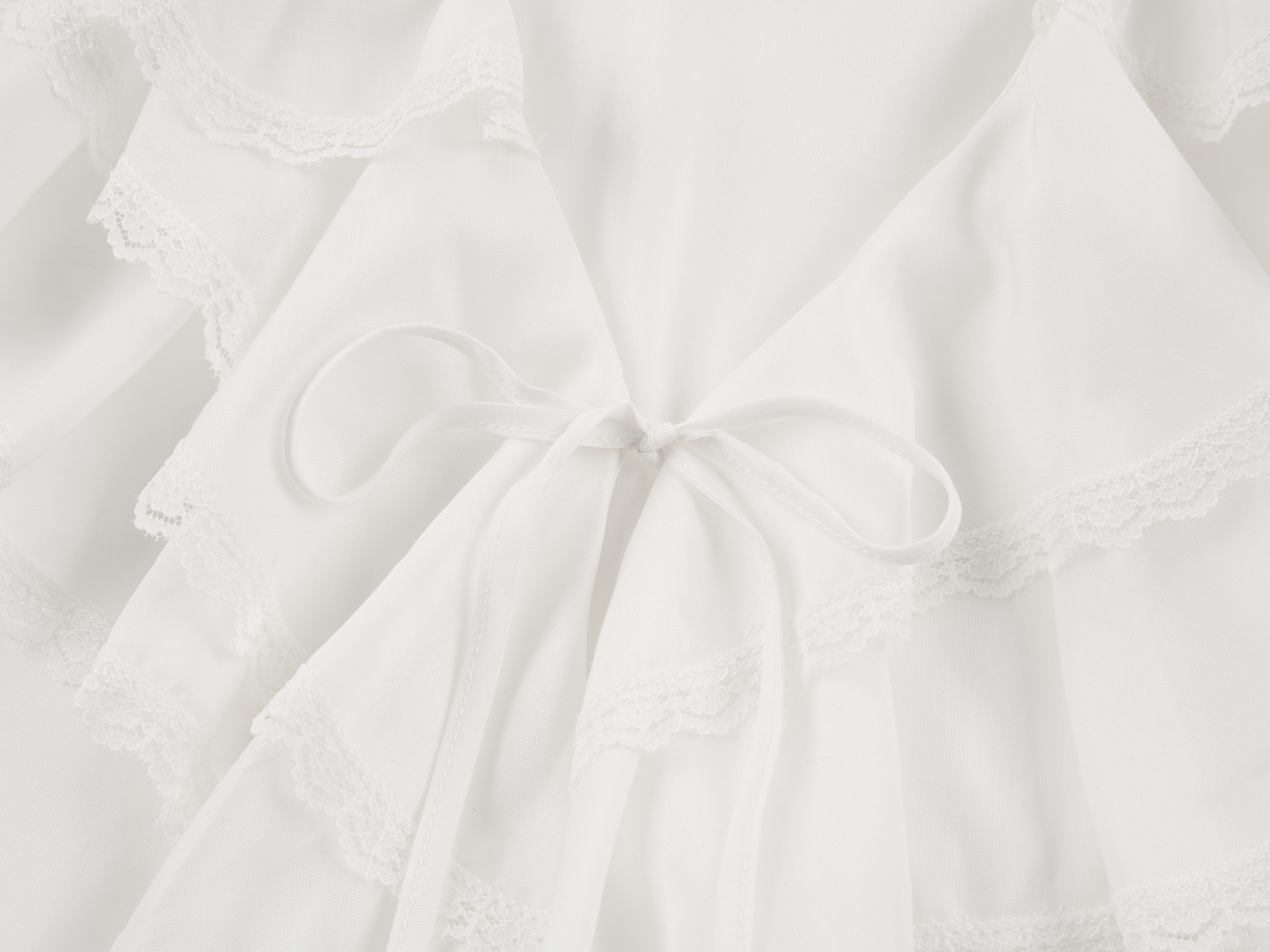 Relaxed fit shirt features layered, staggered ruffle collars?romantic and casual.
