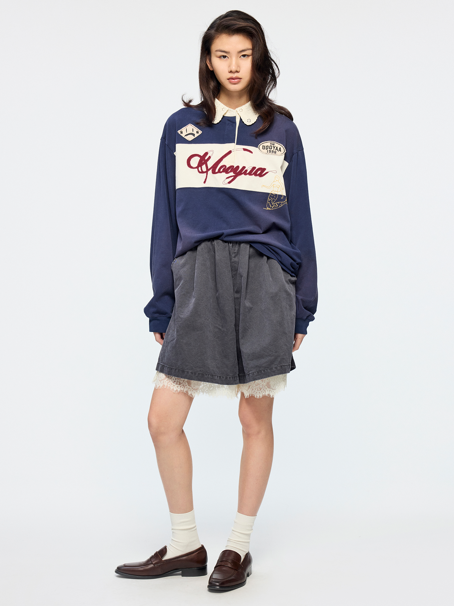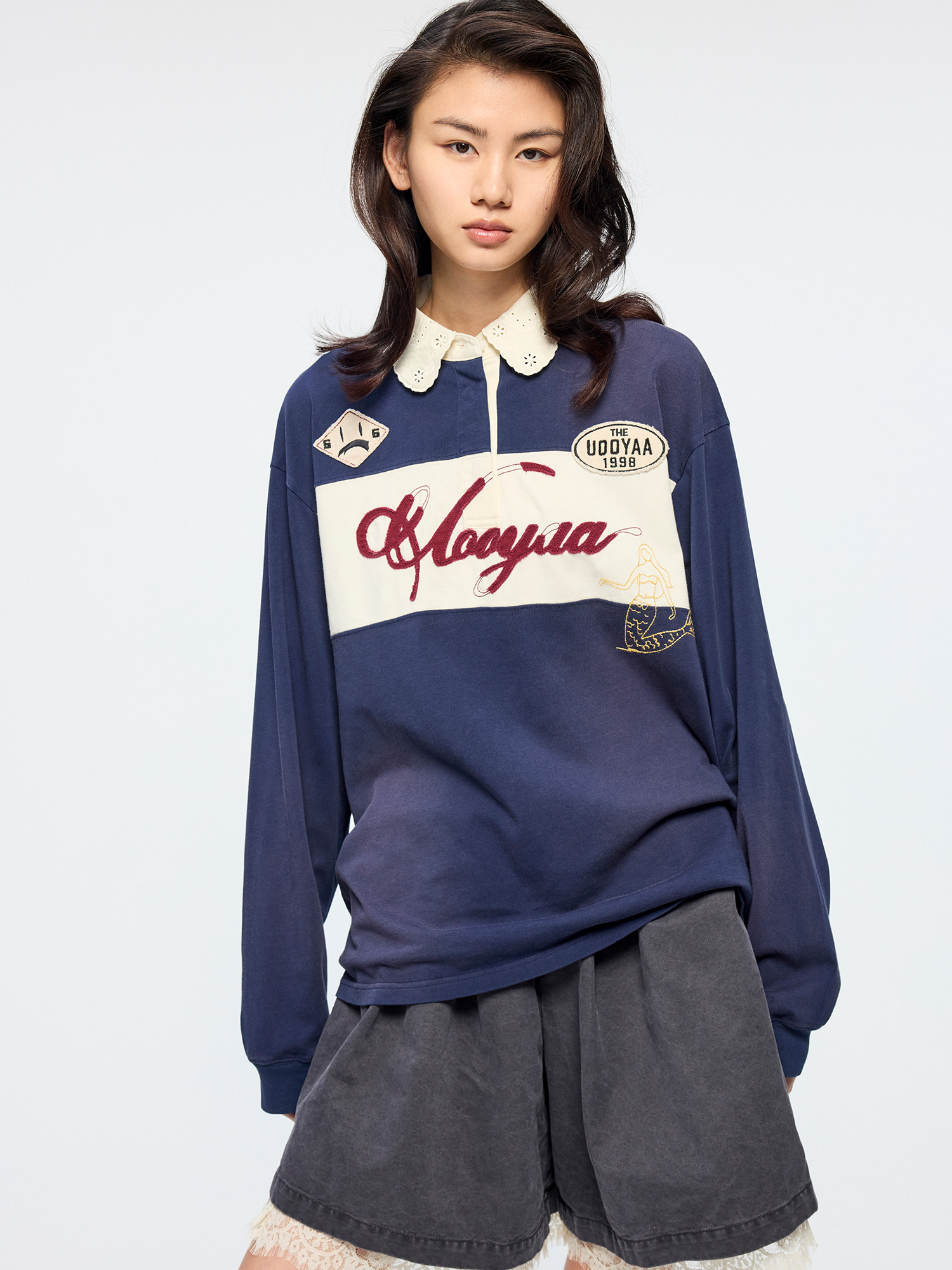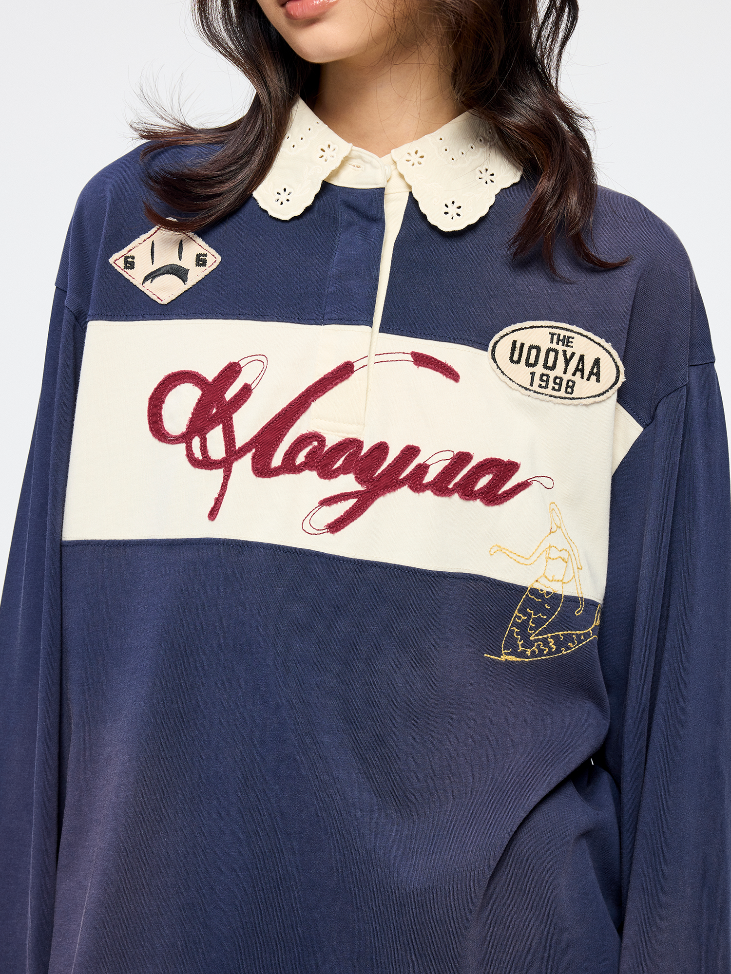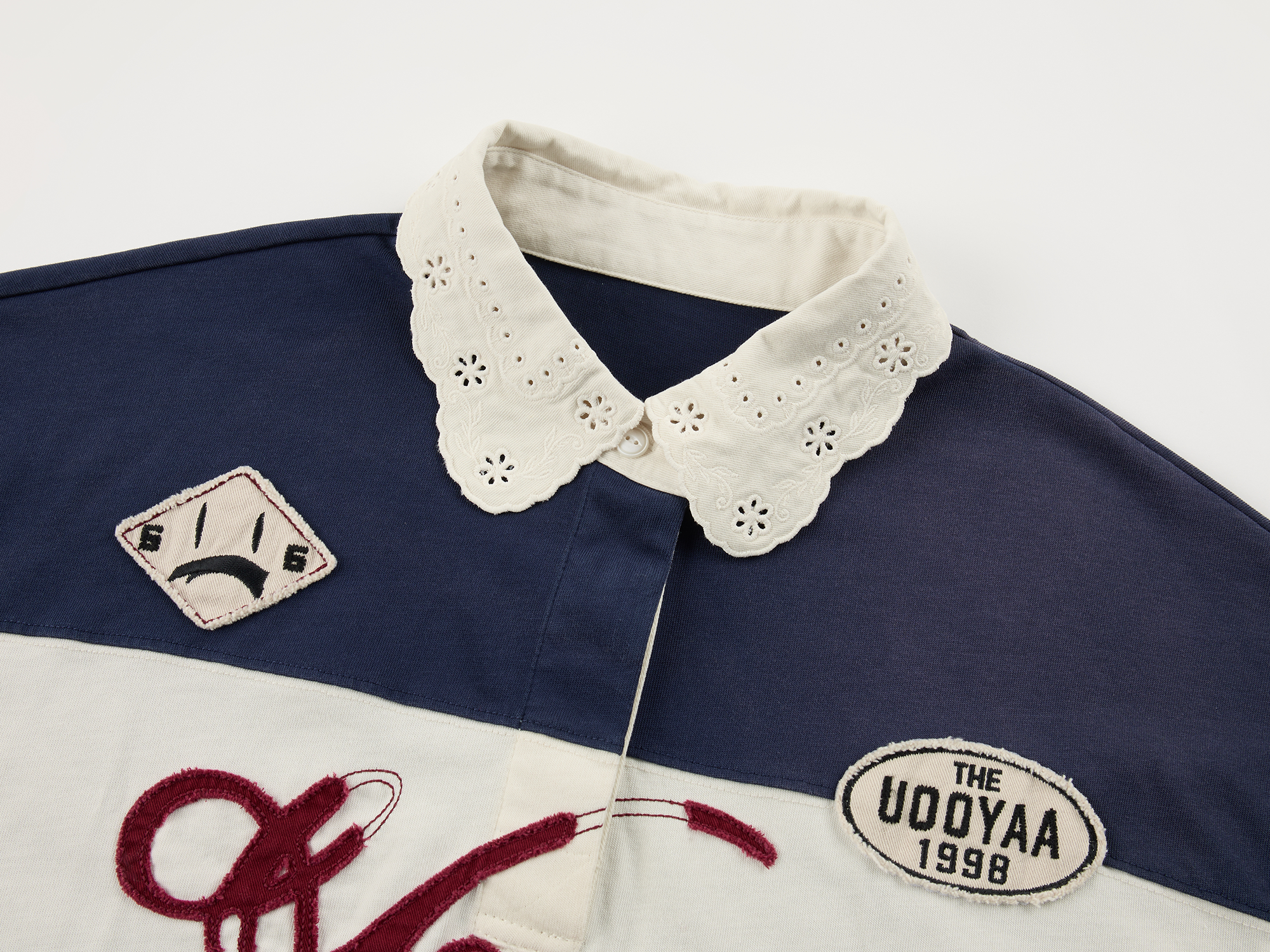 Openwork embroidered Peter Pan collar interprets a classic Polo, layered with fantasy mermaid embroidery, collegiate badges, and raw-edge applique logo?casual and fun.