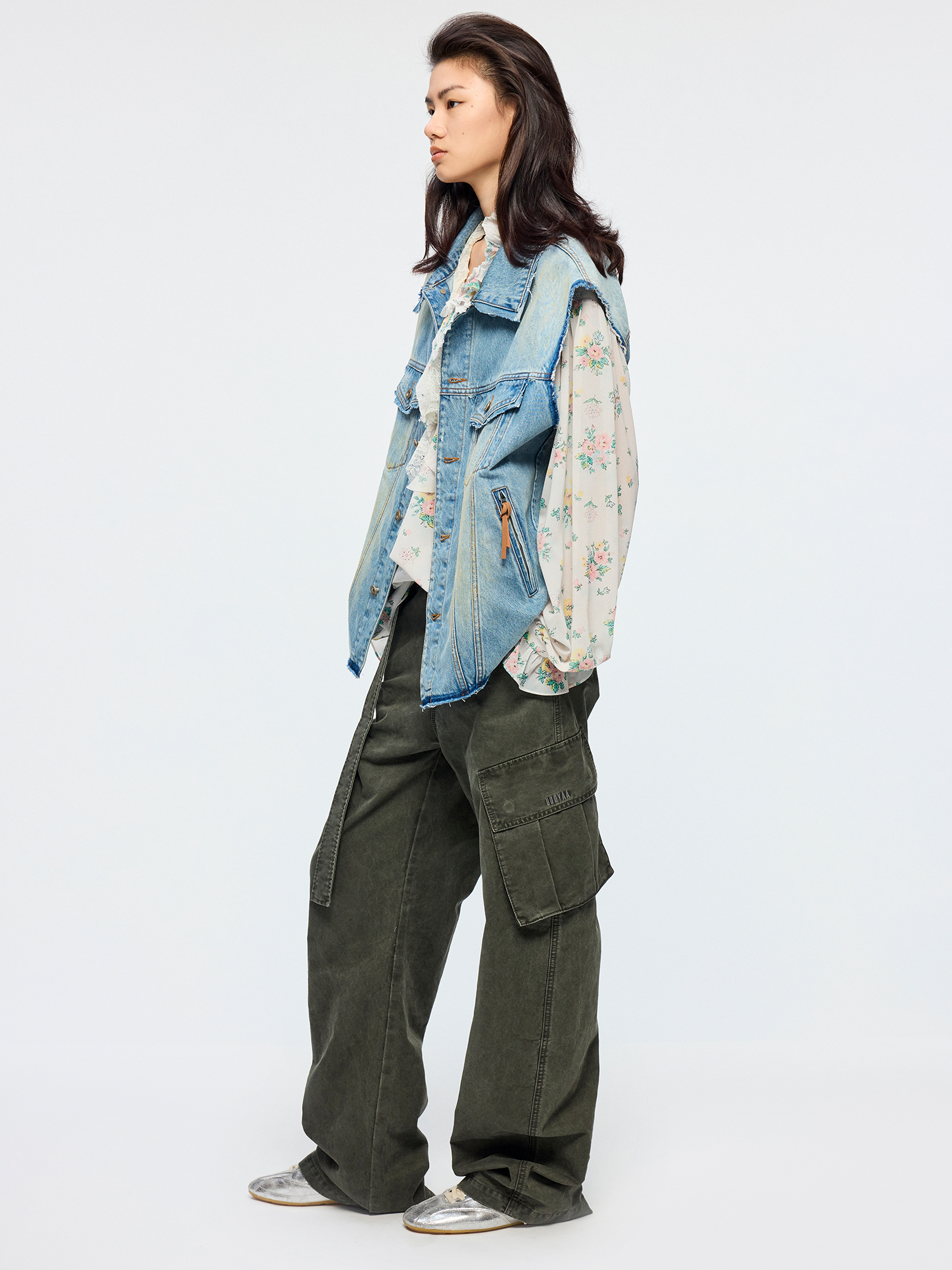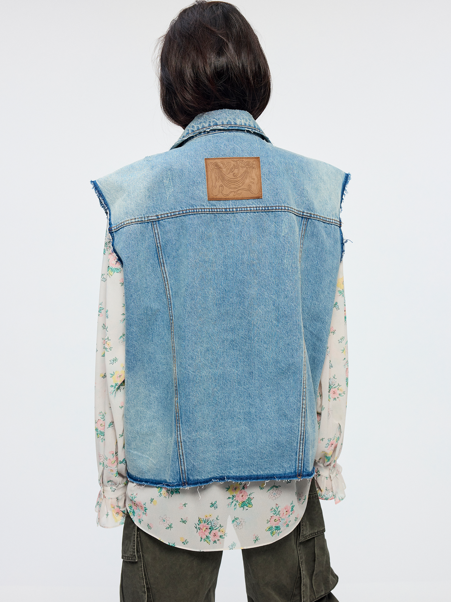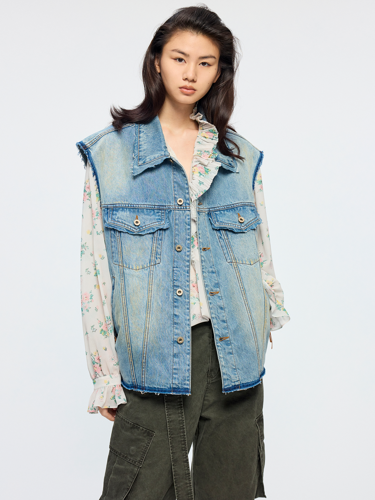 Breaks original structural lines with irregular raw-edge strip patchwork to reinterpret the classic denim vest. 3D vintage wash offers relaxation and spontaneity.
