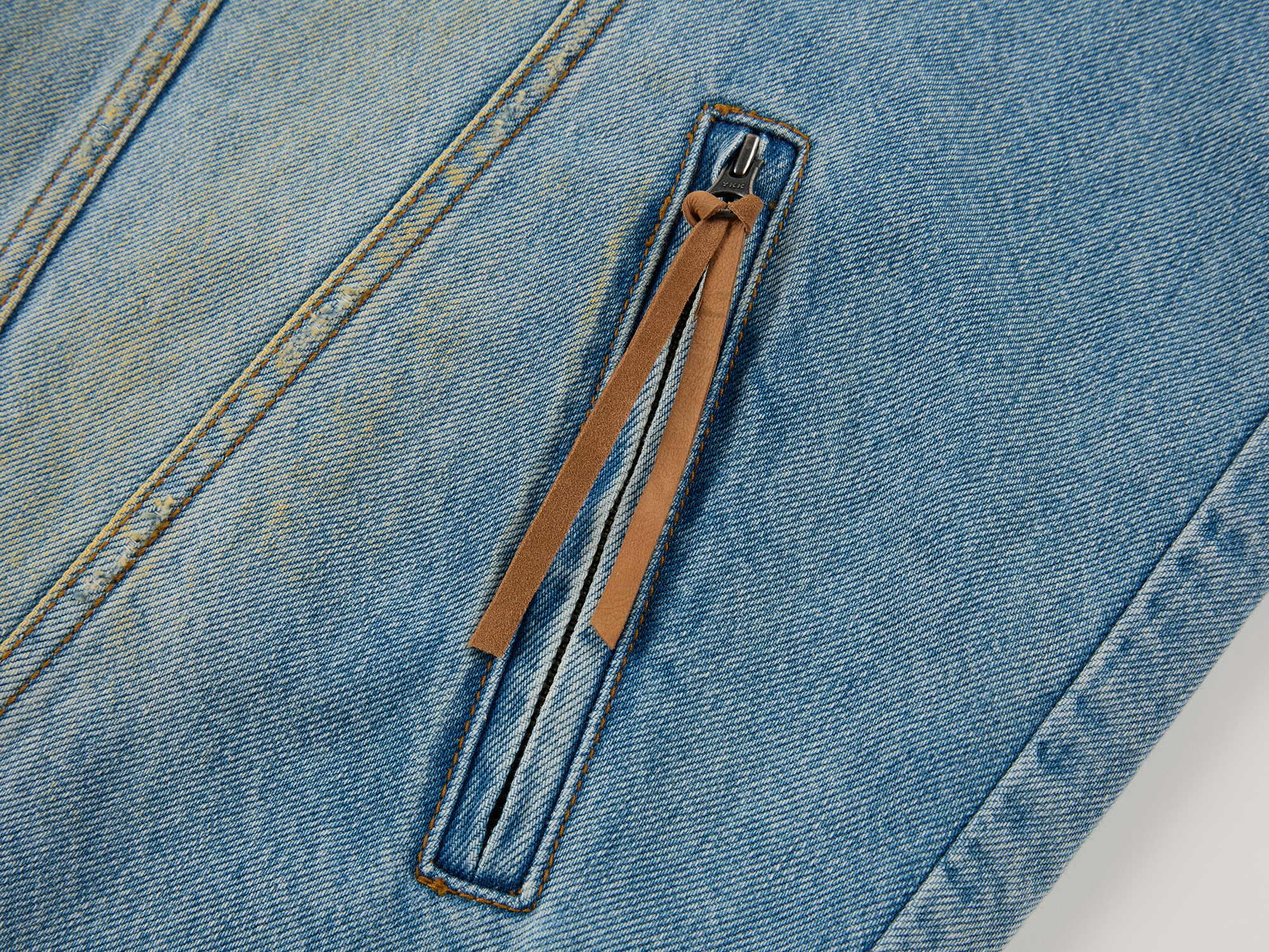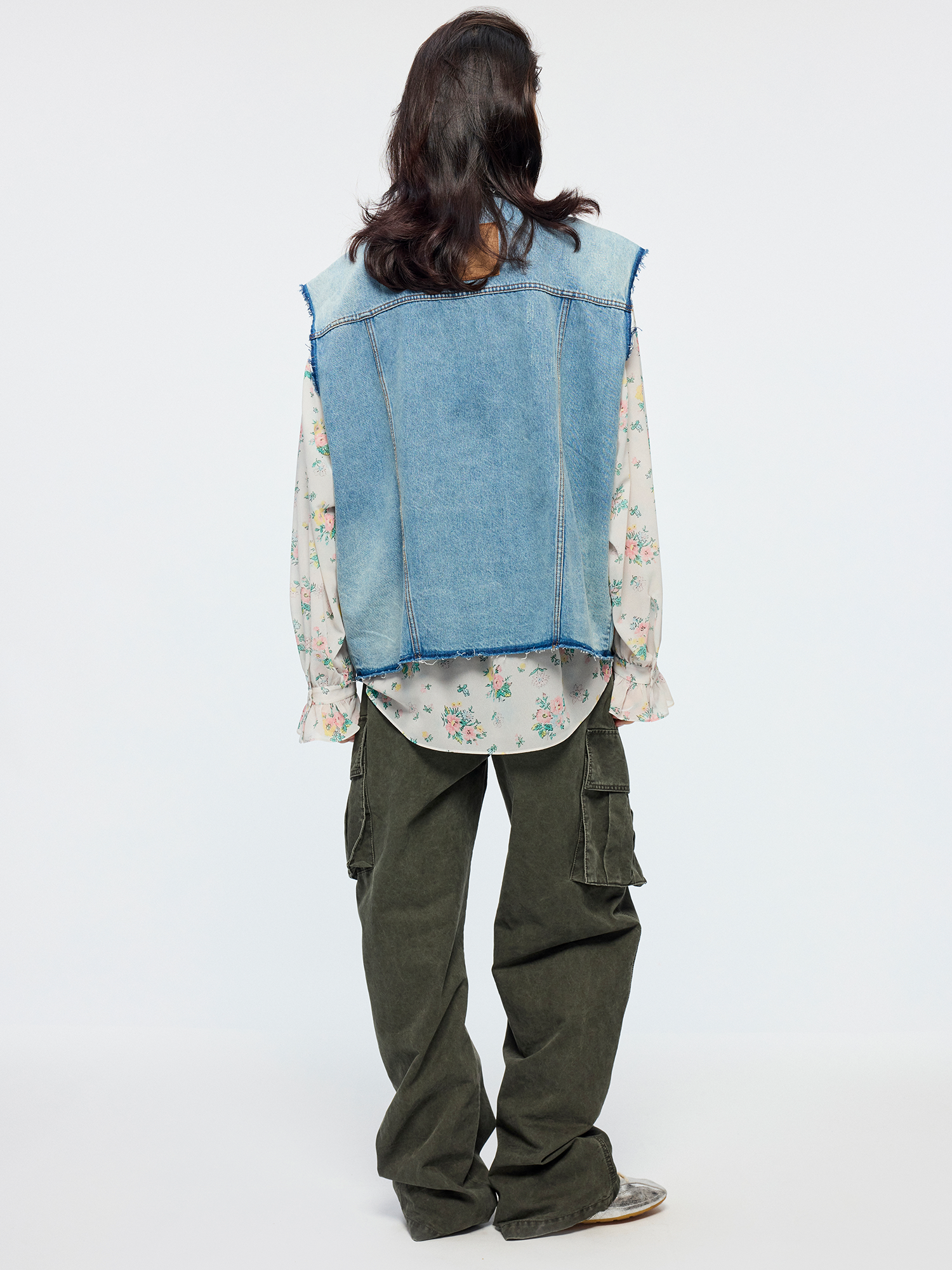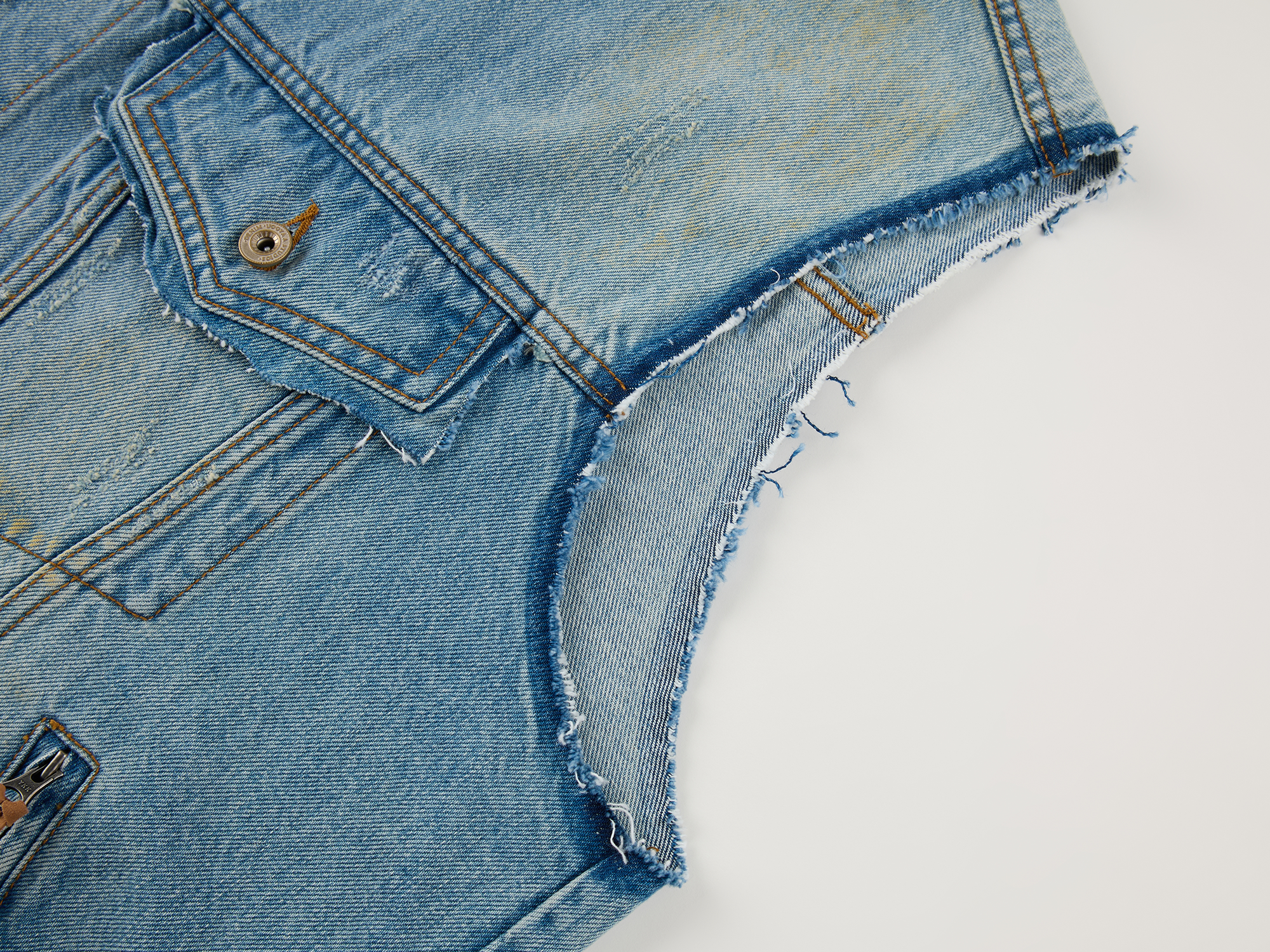 Breaks original structural lines with irregular raw-edge strip patchwork to reinterpret the classic denim vest. 3D vintage wash offers relaxation and spontaneity.
