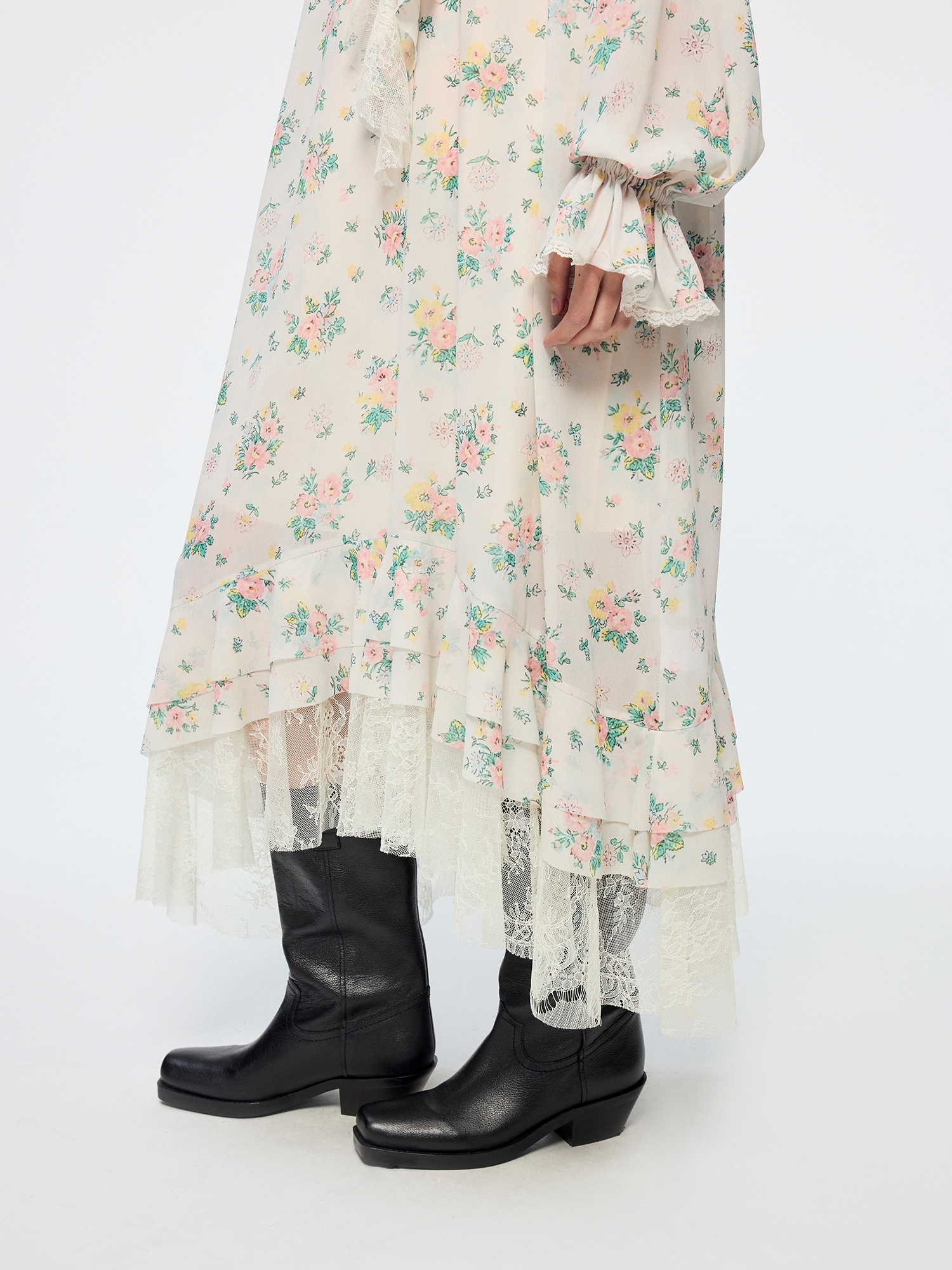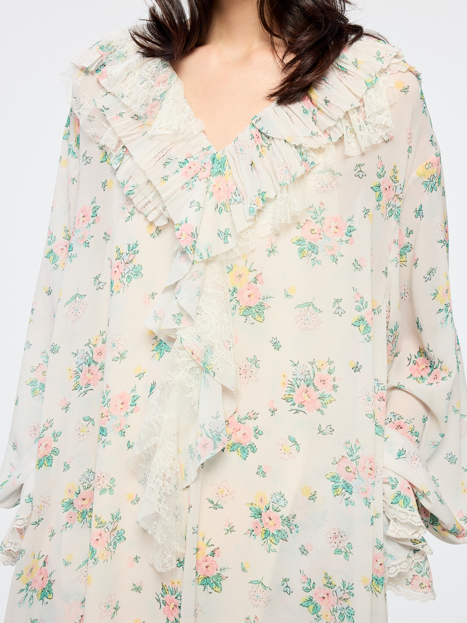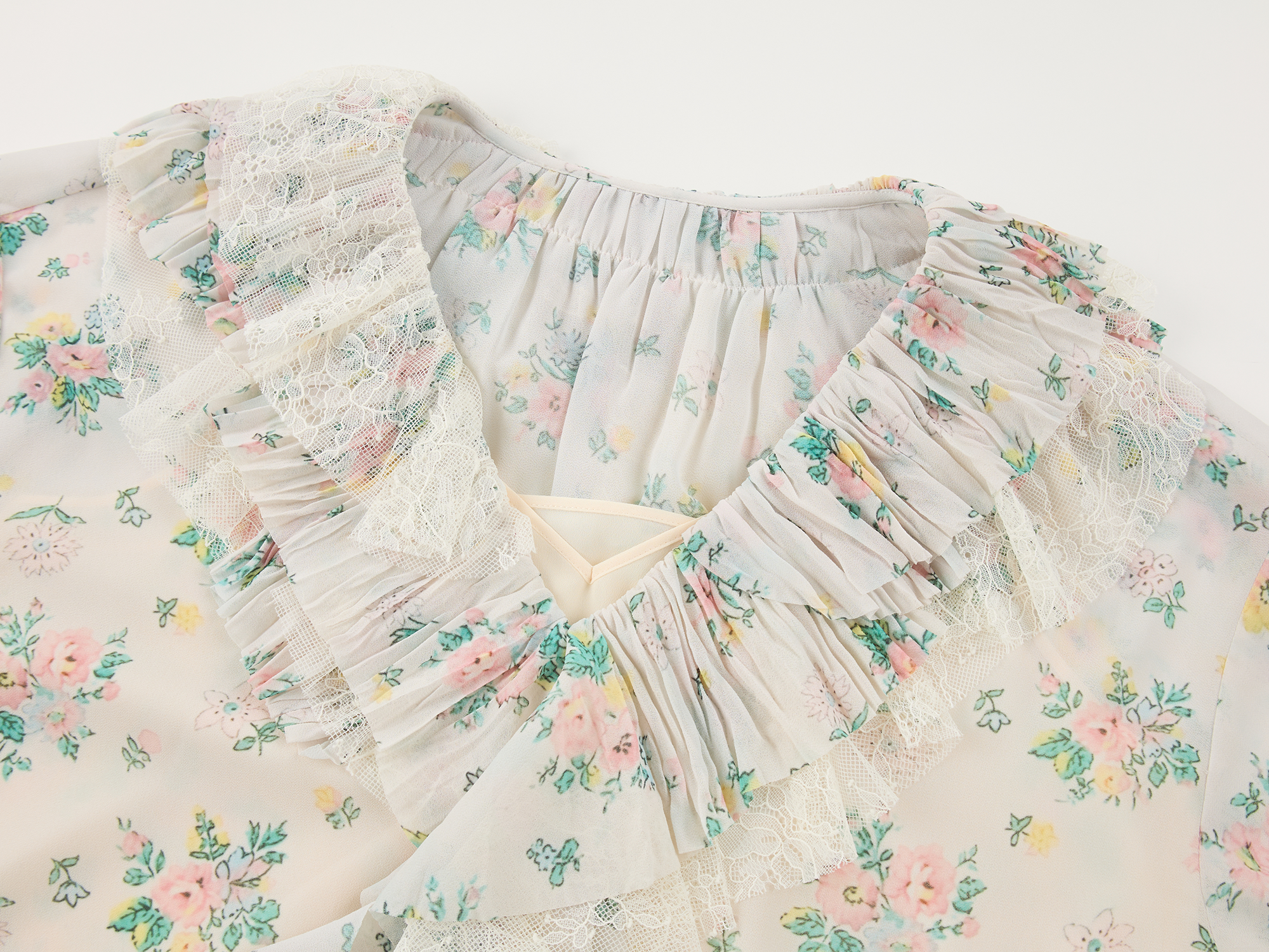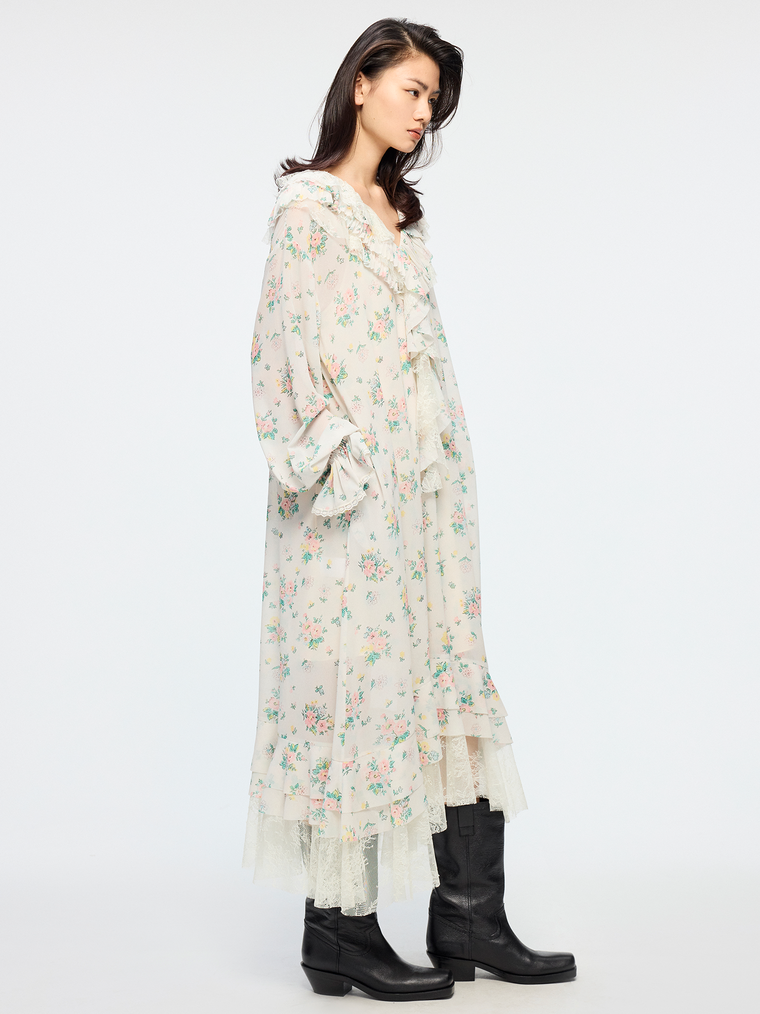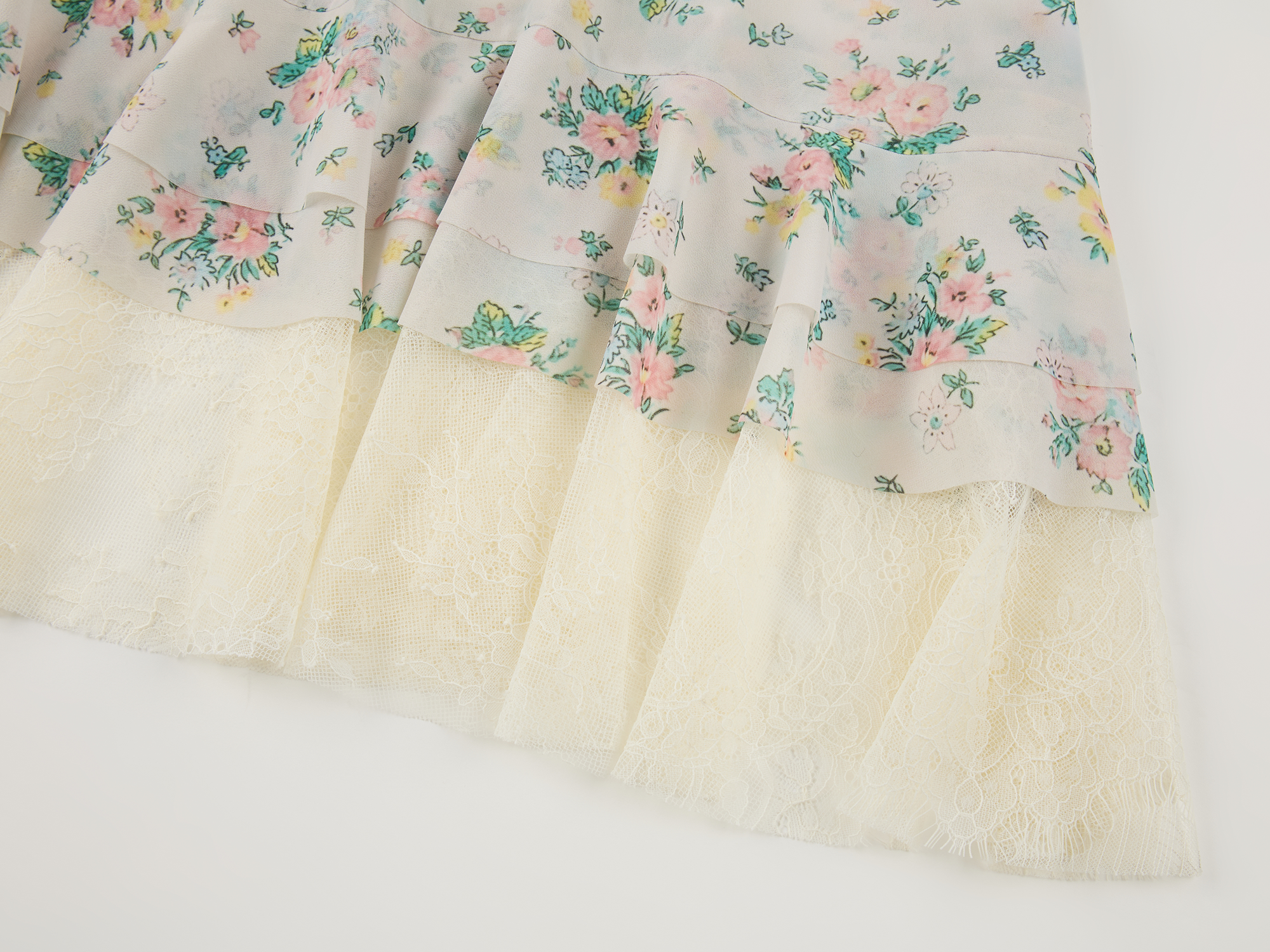 Classical ruffle dress spliced with staggered lace fabric meets vintage floral print?romantic and casual.