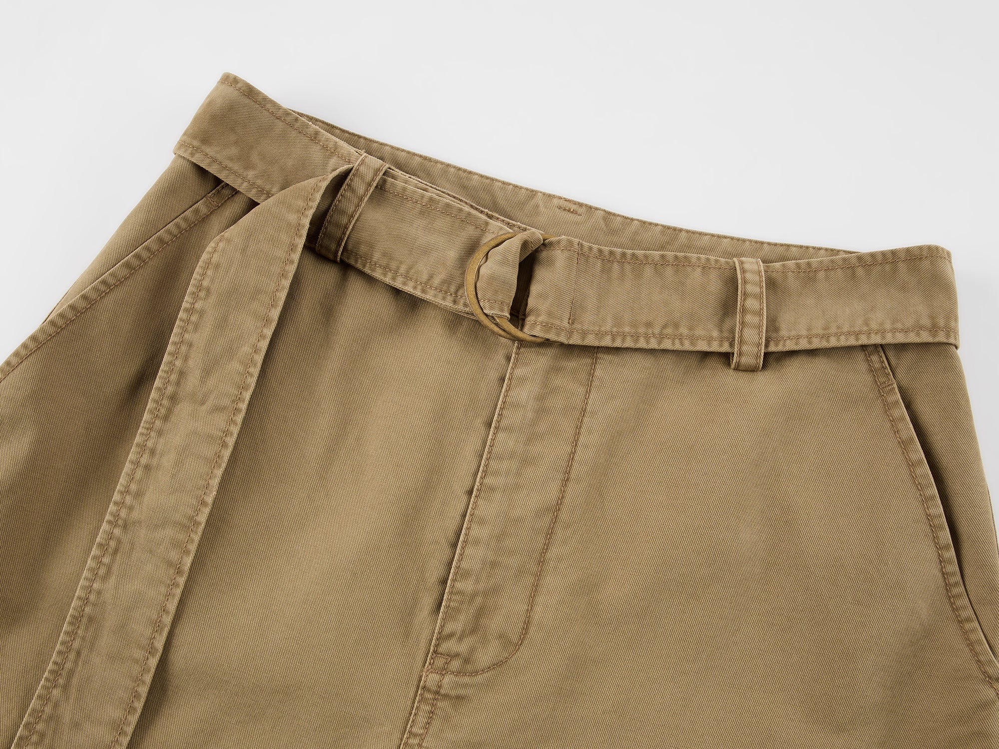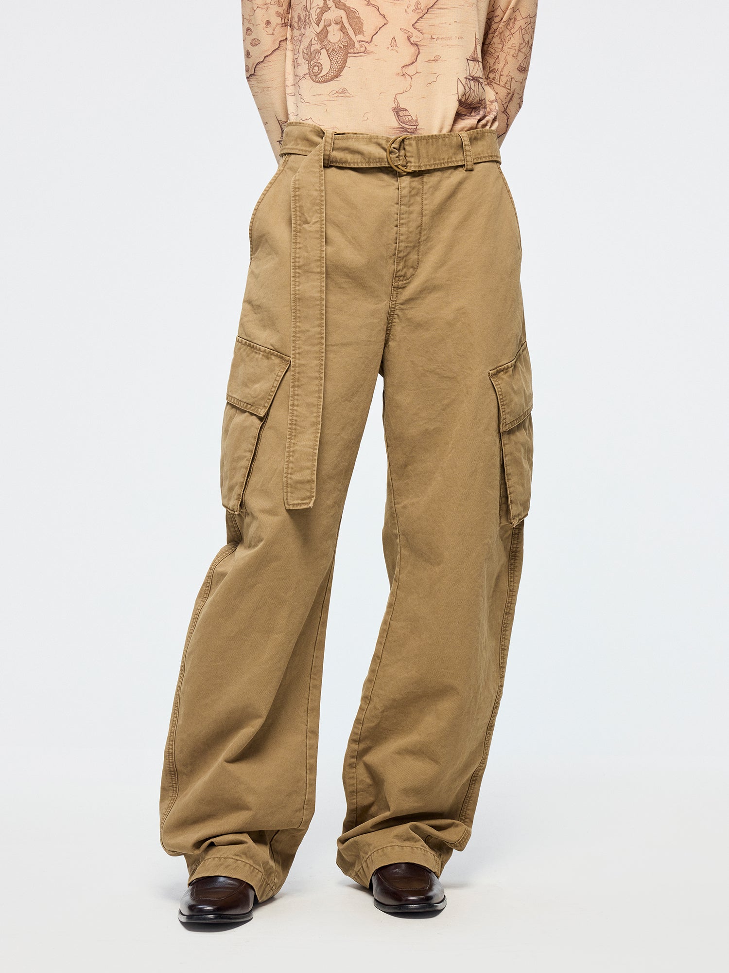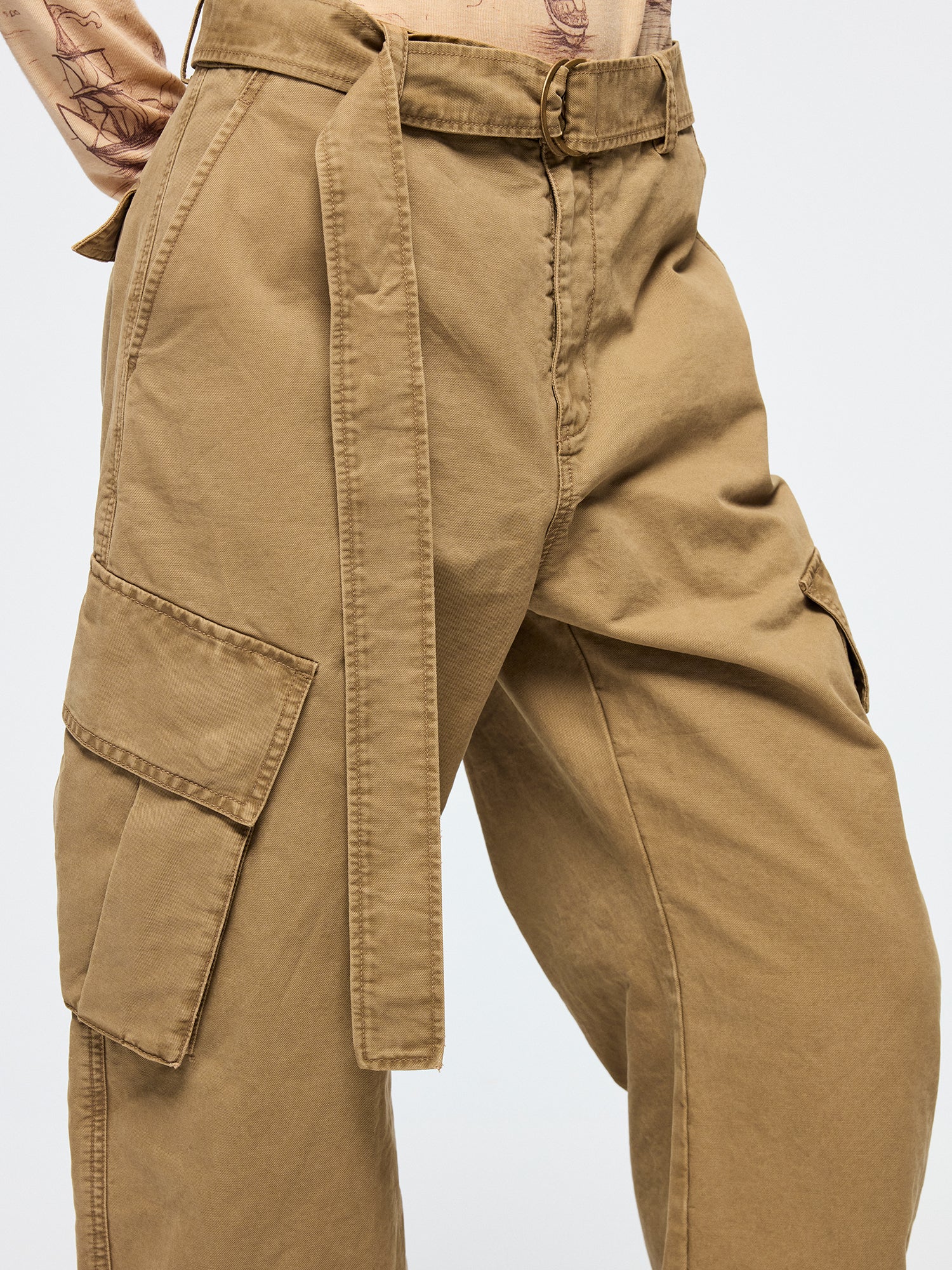 Classic curved-leg cargo pants feature a self-fabric belt, shaping a relaxed state of wear.