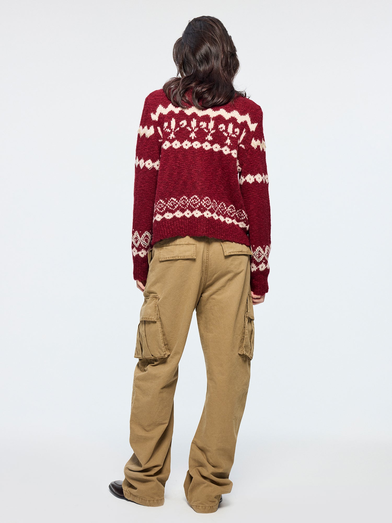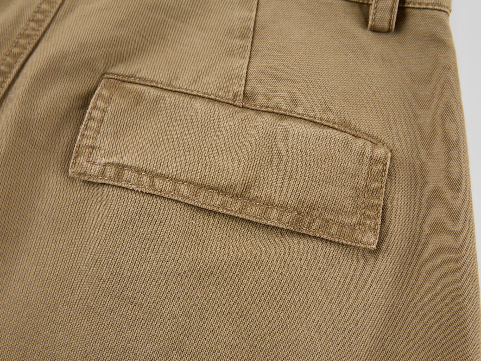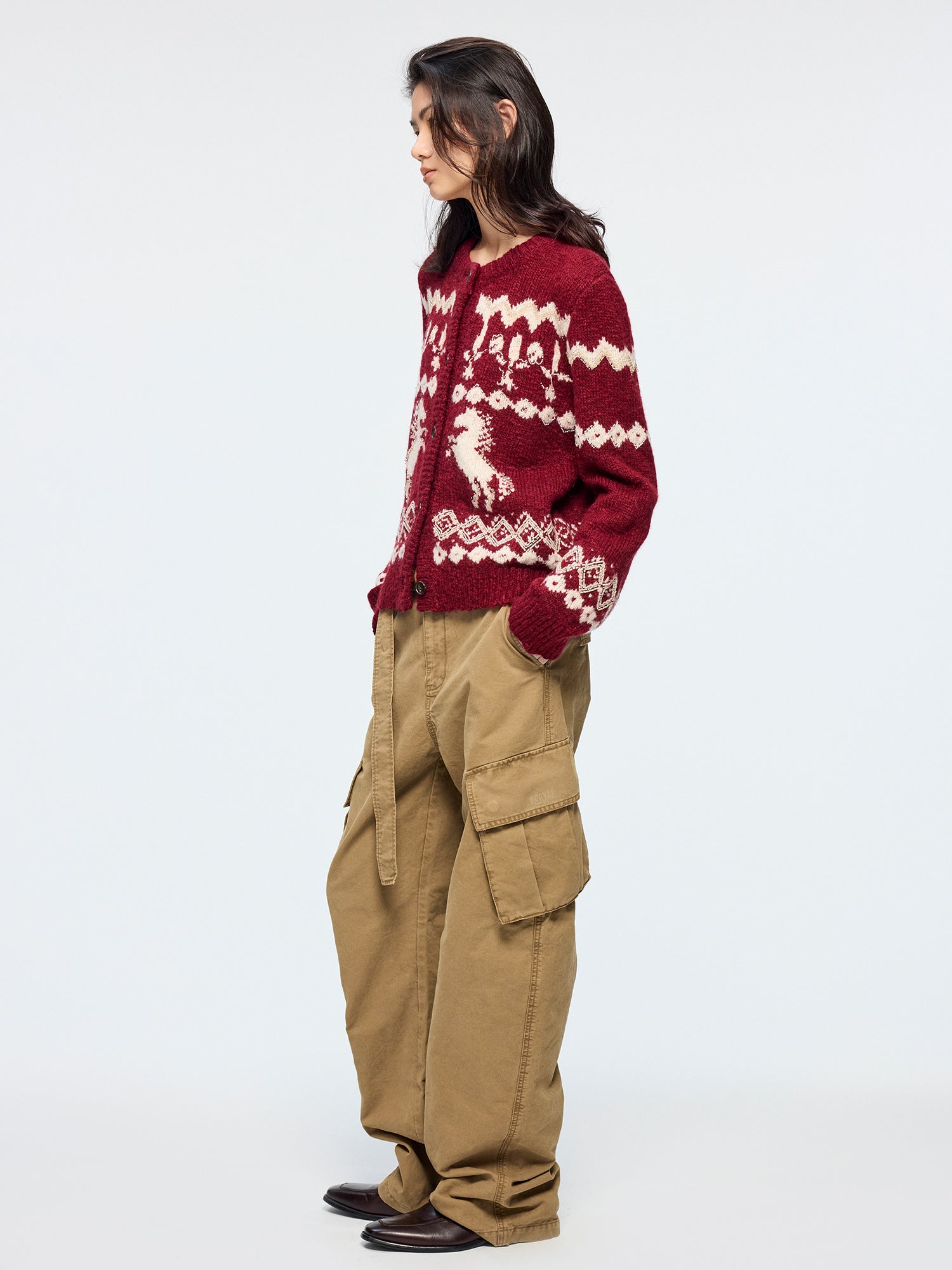 Classic curved-leg cargo pants feature a self-fabric belt, shaping a relaxed state of wear.