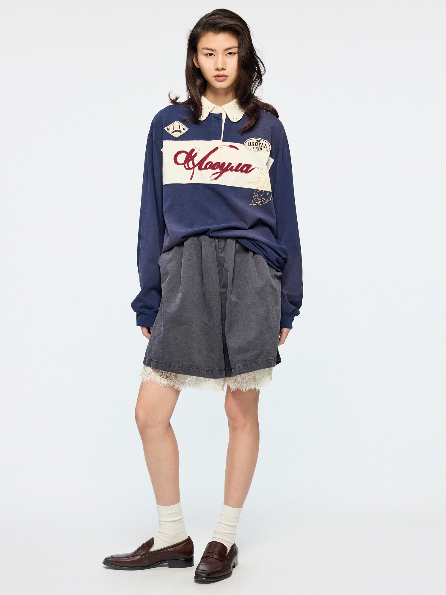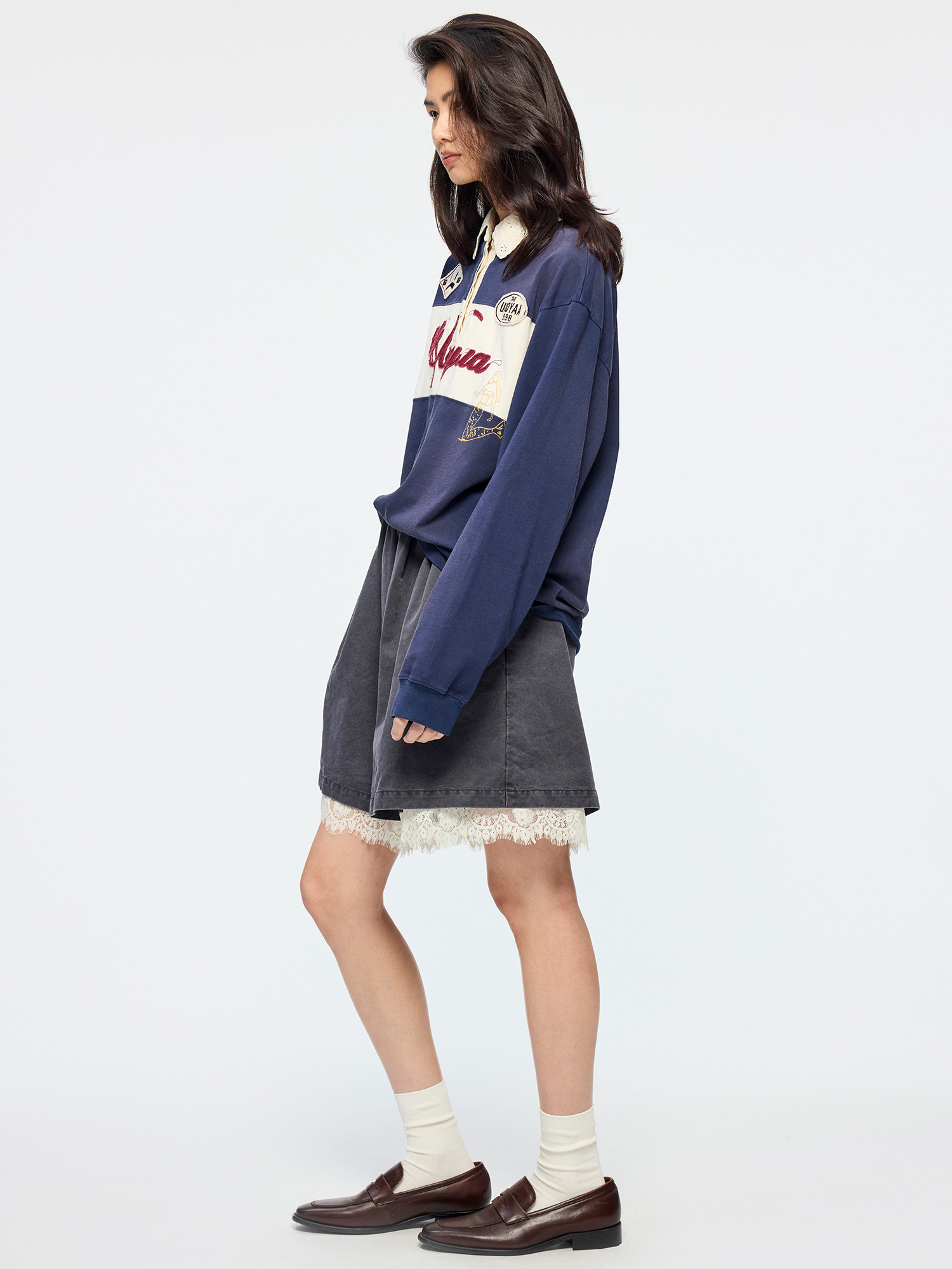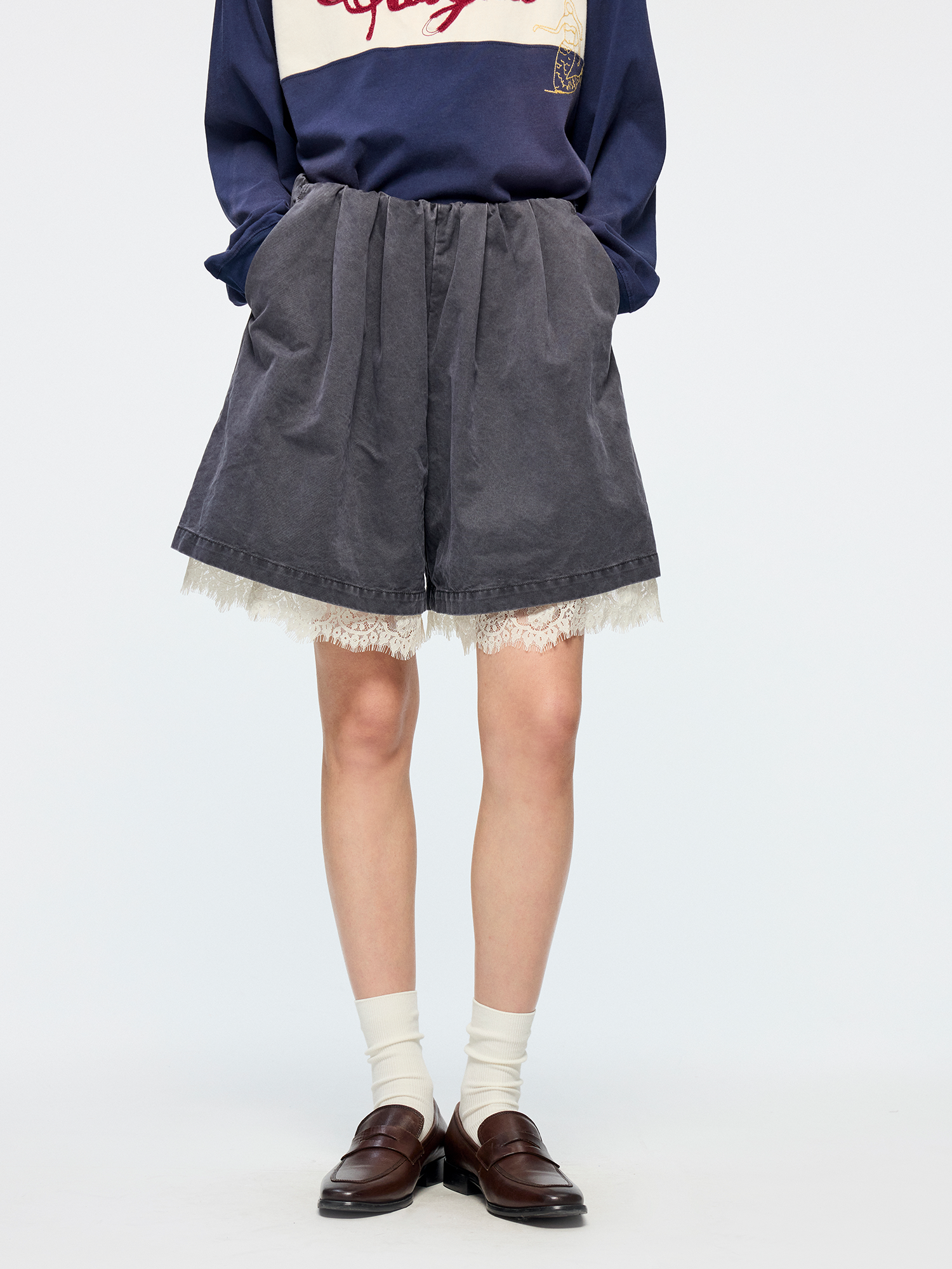 Waistless Bermuda shorts feature ruched details and lace hem patchwork?romantic and casual.