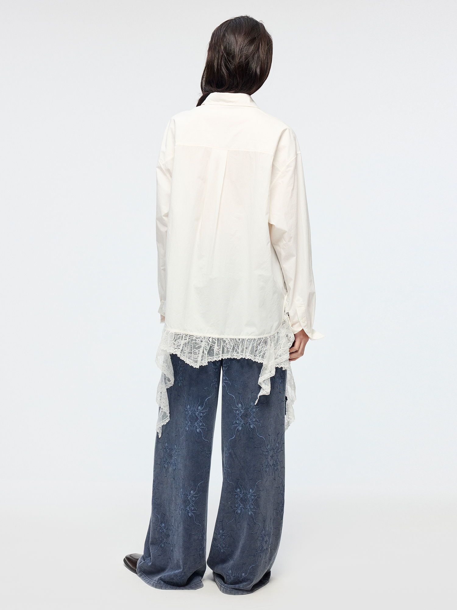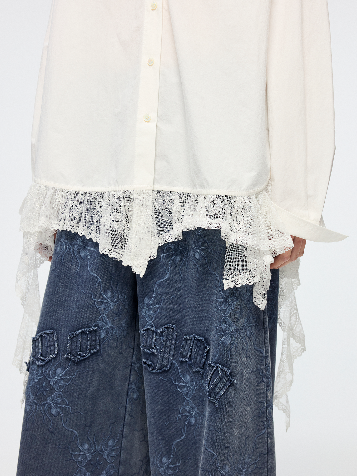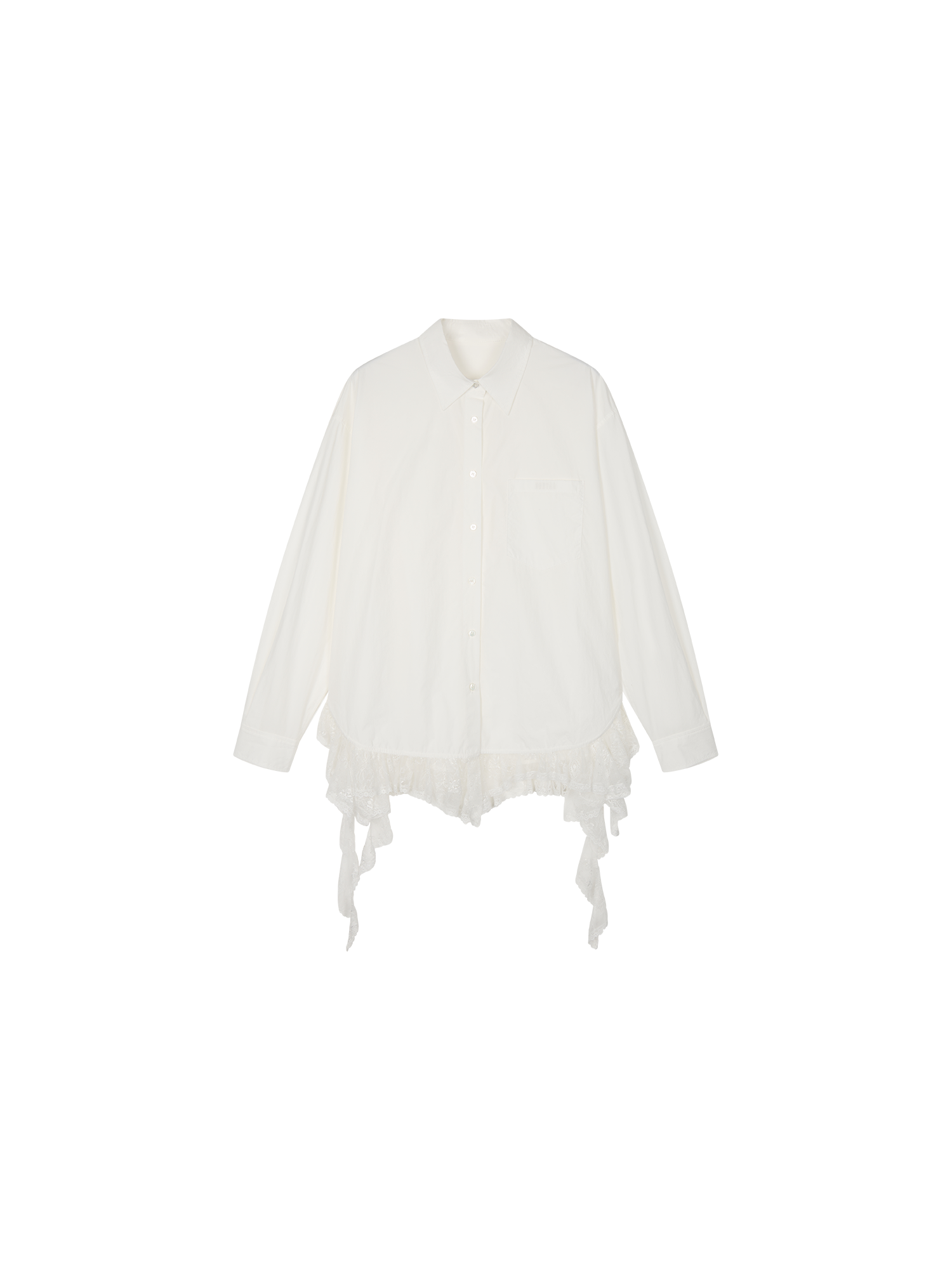 Classic men's shirt reimagined with irregular lace patchwork at the hem, adding romance and spontaneity to the minimalist white design.