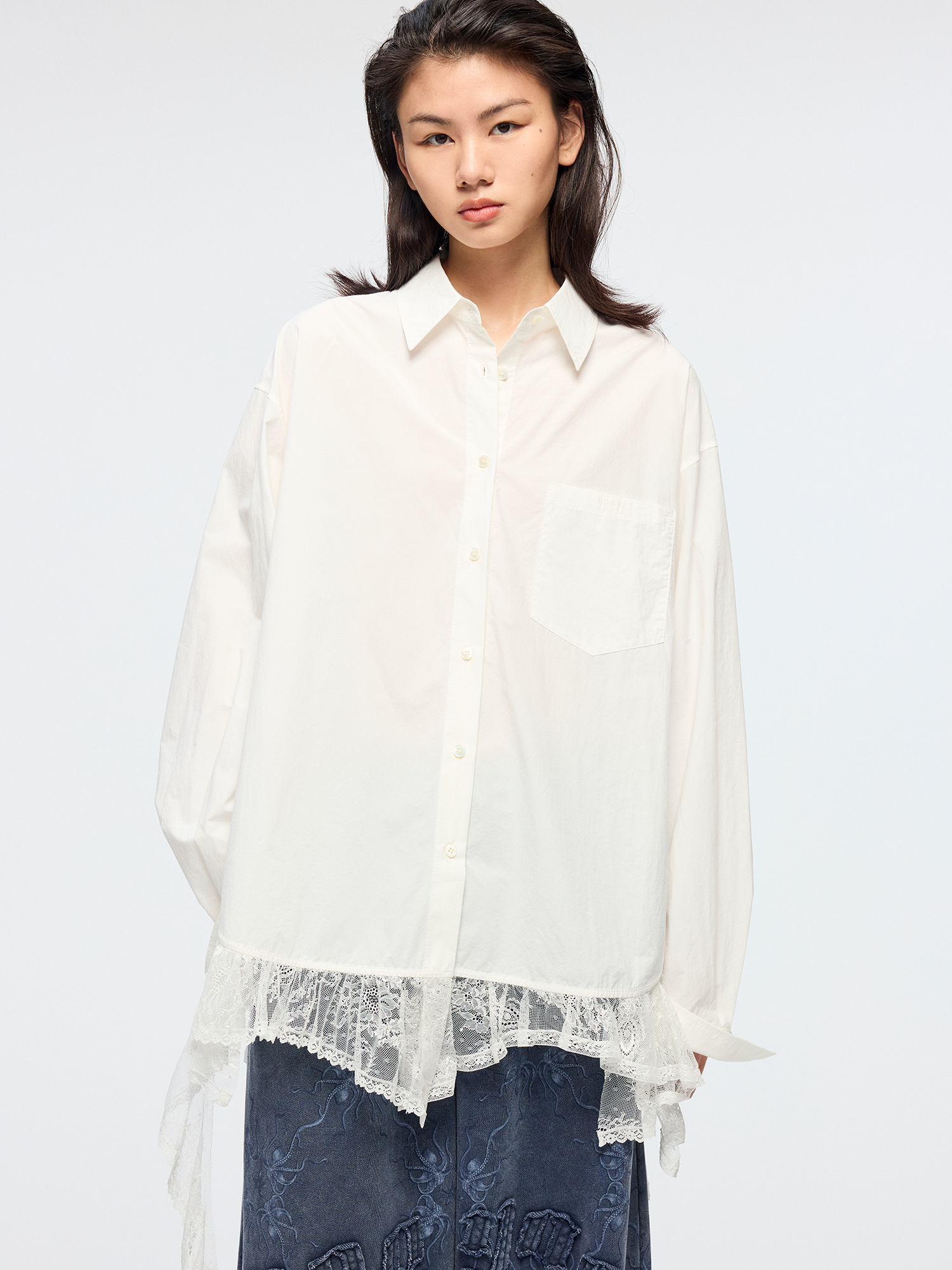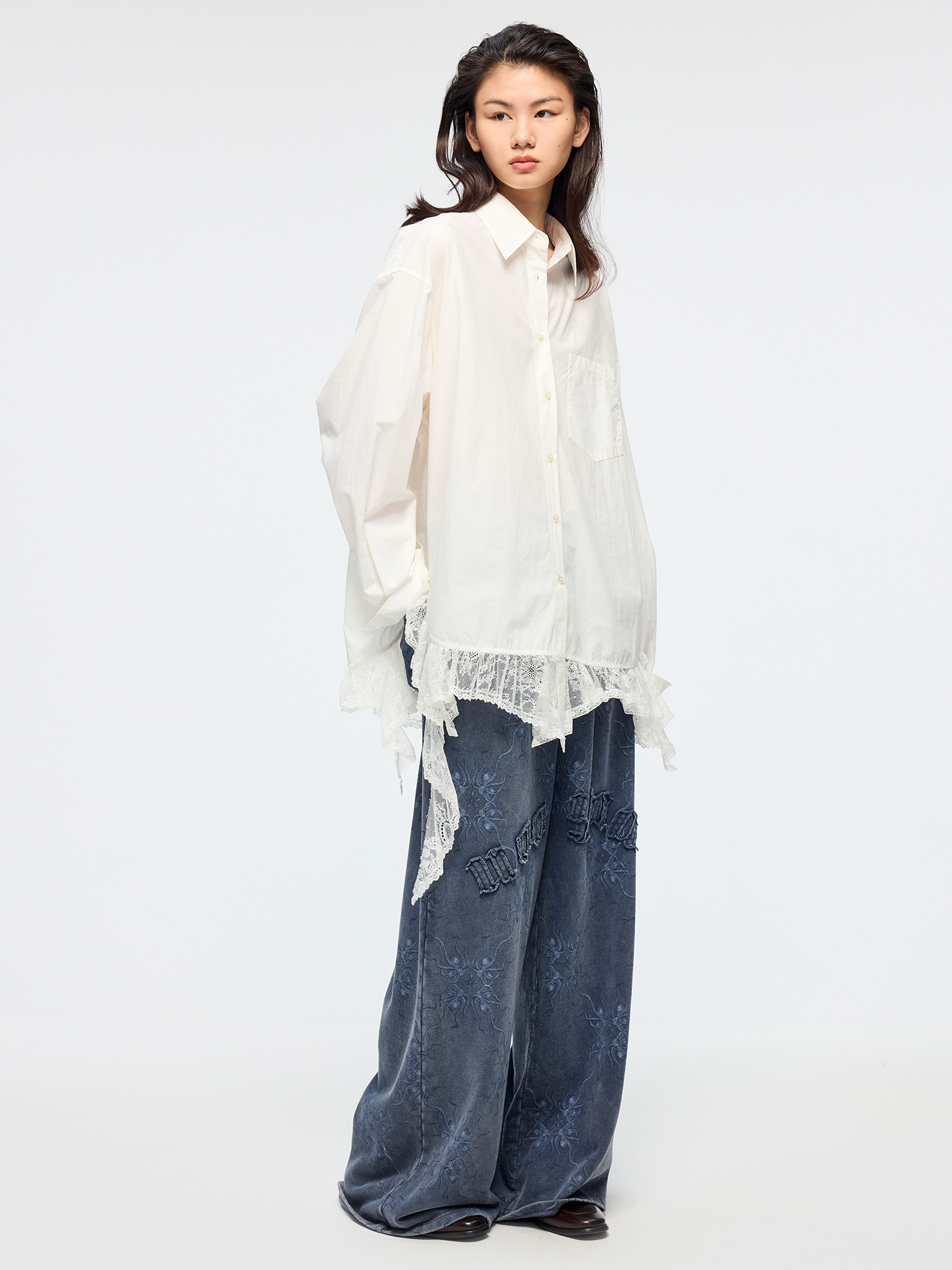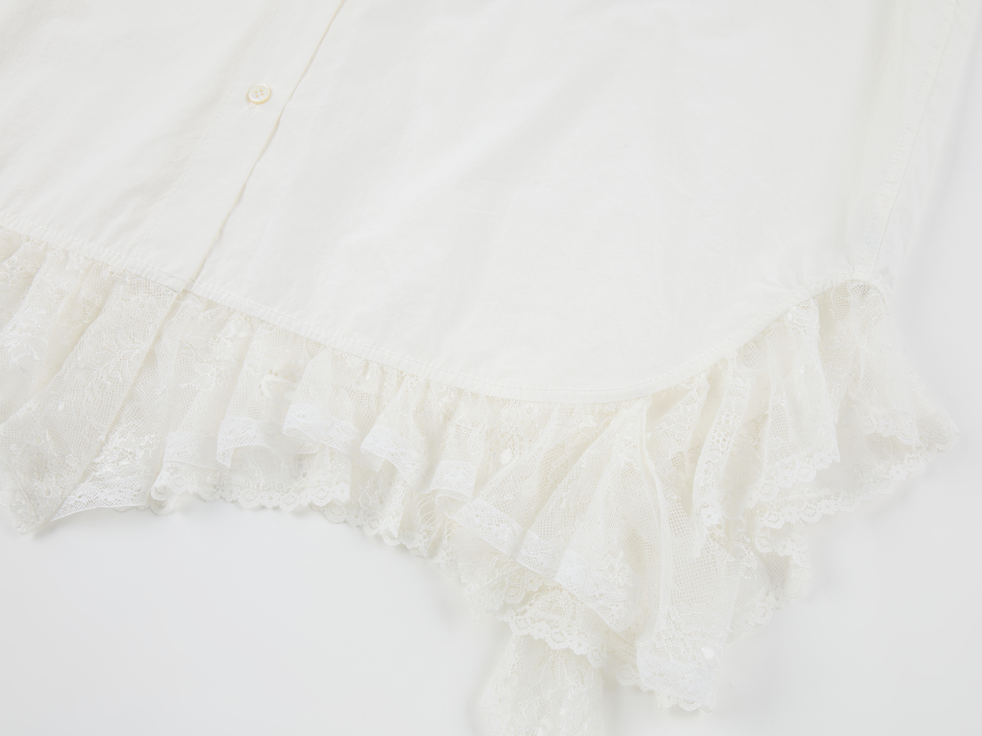 Classic men's shirt reimagined with irregular lace patchwork at the hem, adding romance and spontaneity to the minimalist white design.